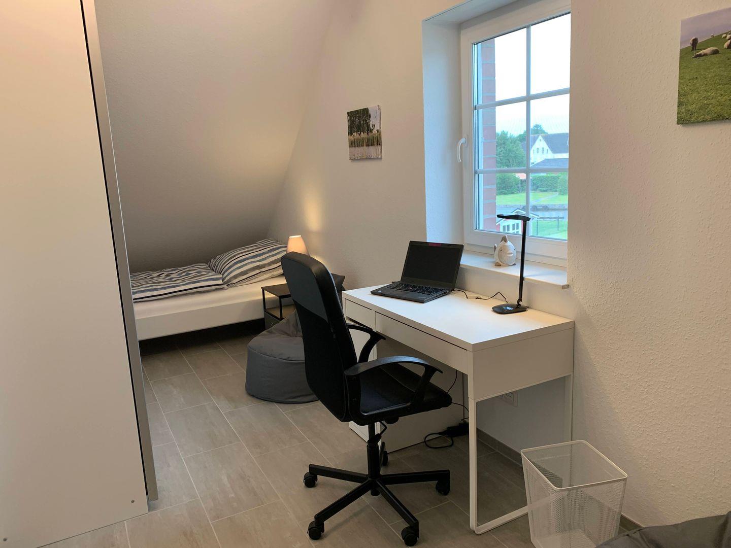 In der oberen Etage befinden sich zwei weitere Schlafzimmer und ein modernes Duschbad mit ebenerdiger Dusche. Das eine Schlafzimmer hat ein Boxspring-Doppelbett (durchgehende Matratze) sowie einen angrenzenden, begehbaren Kleiderschrank. In dem zweiten Schlafzimmer befinden sich zwei Einzelbetten, ein Schrank und ein Schreibtisch. Von hier aus haben Sie einen herrlichen Blick auf den Kanal. Beide Zimmer verfügen über einen weiteren Flachbildfernseher.