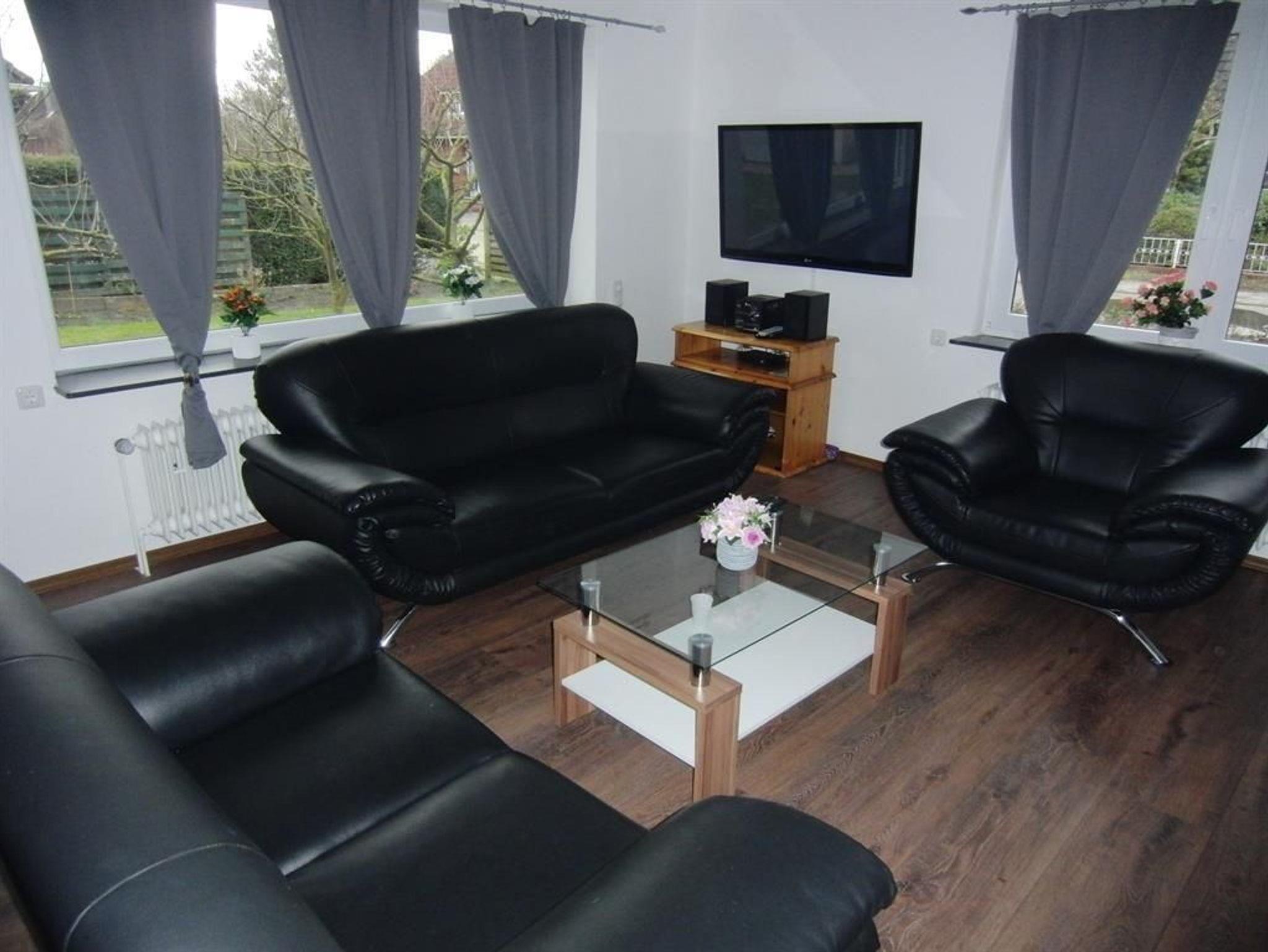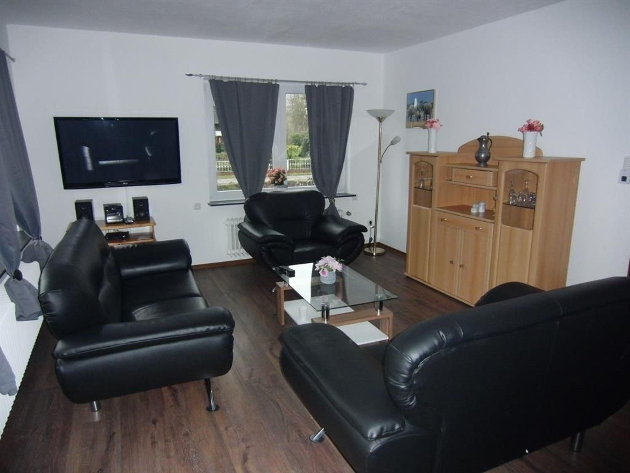 Die Wohnung verfügt über 3 Doppelzimmer mit 2x 1,80 x 2,00 Meter Betten und 1x einem 1,40 x 2,00 Meter Bett. Das Einzelzimmer hat ein 1,00 x 2,00 Meter großes Bett. Jedes Schlafzimmer hat einen TV, einen Kleiderschrank und ein Nachtschränkchen. Die Böden sind mit Laminat ausgelegt. Ein Wohnzimmer und eine Küche mit Gasherd stehen den Gästen zur Verfügung. In der unteren Etage befindet sich das Bad mit Dusche und WC, oben steht zusätzlich ein separates WC zur Verfügung.