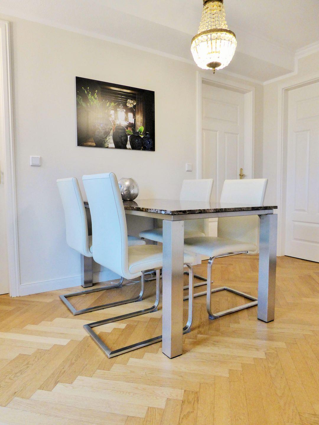 Die moderne und komfortable 2-Zimmer-Wohnung (ca. 60 m²) im Gartengeschoss besitzt ein hohes Maß an Funktionalität und ist komplett eingerichtet. Der Bodenbelag in den Wohn- und Schlafräumen ist hochwertiges Eichen-Parkett, die Küche und das Bad / WC sind gefliest. Alle Räume sind mit Fußbodenheizung ausgestattet.