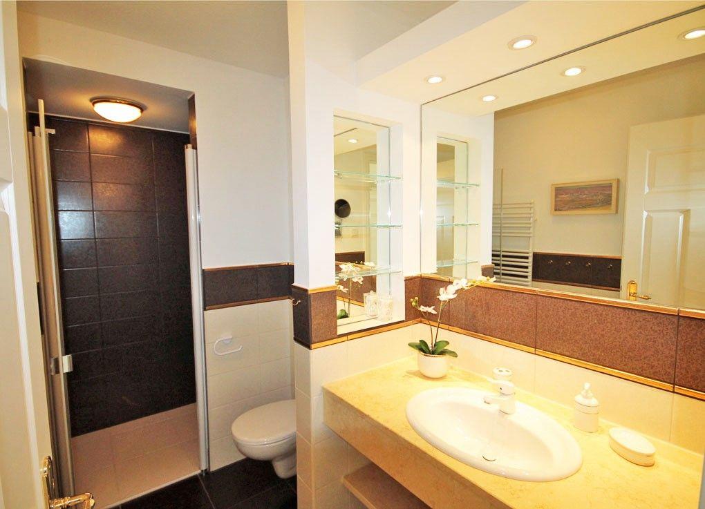 Das moderne Badezimmer verfügt über eine begehbare, ebenerdige und somit auch seniorenfreundliche Dusche, einen Waschtisch mit großem Wandspiegel, WC, Föhn, Kosmetikspiegel, Handtuch-Heizkörper sowie ausreichend Ablagemöglichkeiten.