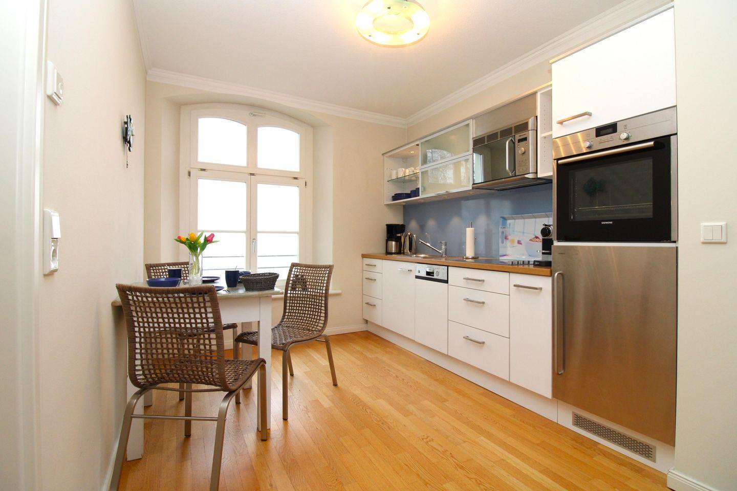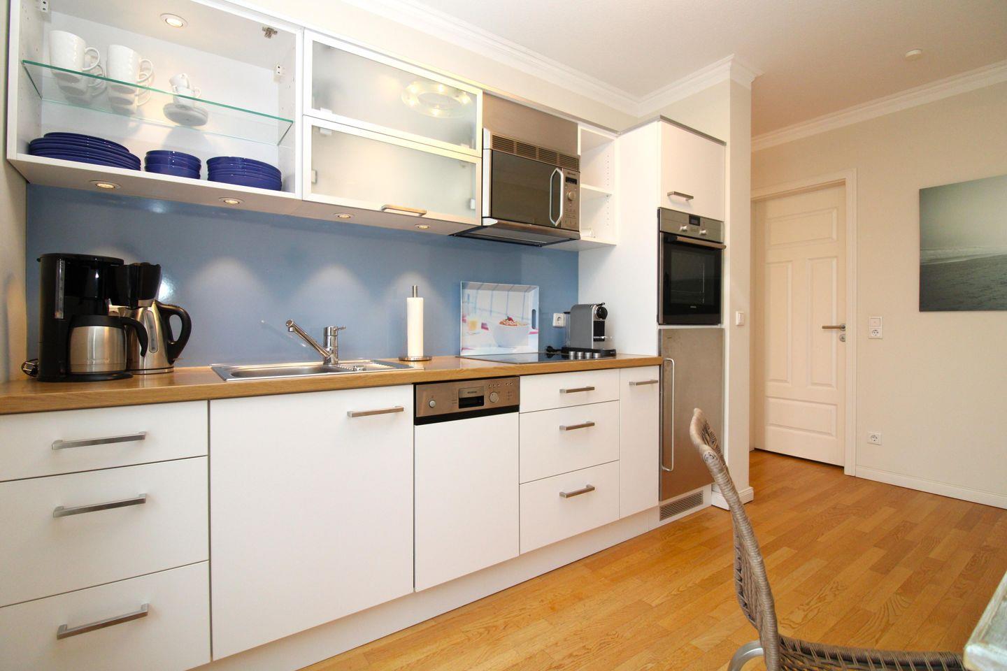 Die separate und moderne Küche beinhaltet eine voll ausgestattete Einbauküchenzeile mit 4-Zonen-Ceran-Kochfeld, Backofen, Dunstabzug, Geschirrspülmaschine, Kühlschrank mit Gefrierfach, Kaffeemaschine, Wasserkocher und Toaster. Die Küche ist mit Geschirr, Gläsern, Besteck und Töpfen bestens und vollständig ausgestattet. Hier befindet sich auch der Essbereich mit einem Esstisch und Stühlen.