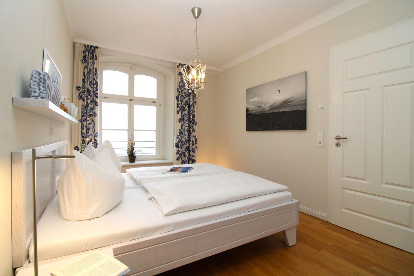 Das gemütliche und geräumige Schlafzimmer ist mit einem bequemen Doppelbett, Nachttischen sowie einem sehr großen und geräumigen Kleiderschrank eingerichtet. Zusätzliche Verdunkelungsvorhänge an den Fenstern ermöglichen eine ungestörte Nachtruhe.