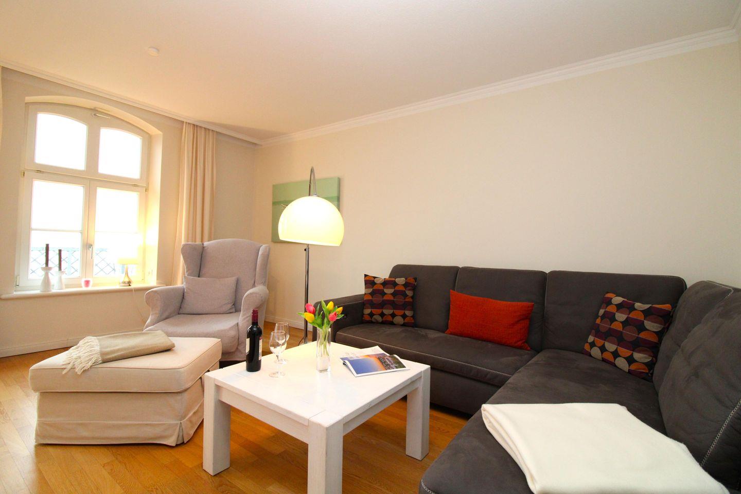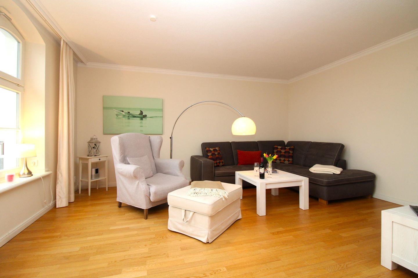Das lichtdurchflutete und geräumige Wohnzimmer verfügt über eine Sitzgruppe mit großer bequemer Eckcouch, einen gemütlichem Ohren-Sessel mit Hocker, Couchtisch, ein TV-Sideboard sowie eine große Vitrine. Vom Wohnzimmer aus haben Sie direkten Zugang zu dem ca. 9 m² großen Balkon (nach Süden ausgerichtet) mit Balkonmöbeln. Hier sitzen Sie entspannt und gemütlich mit Blick ins Grüne und können abends bei einem guten Glas Wein in Ruhe die lauen Sommernächte genießen!