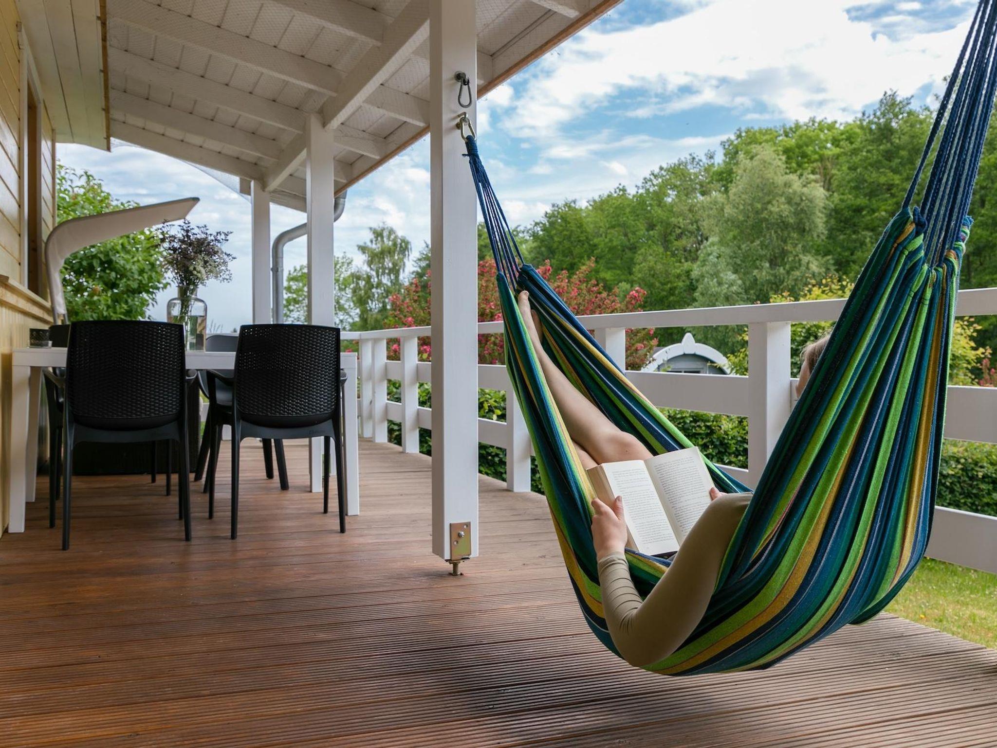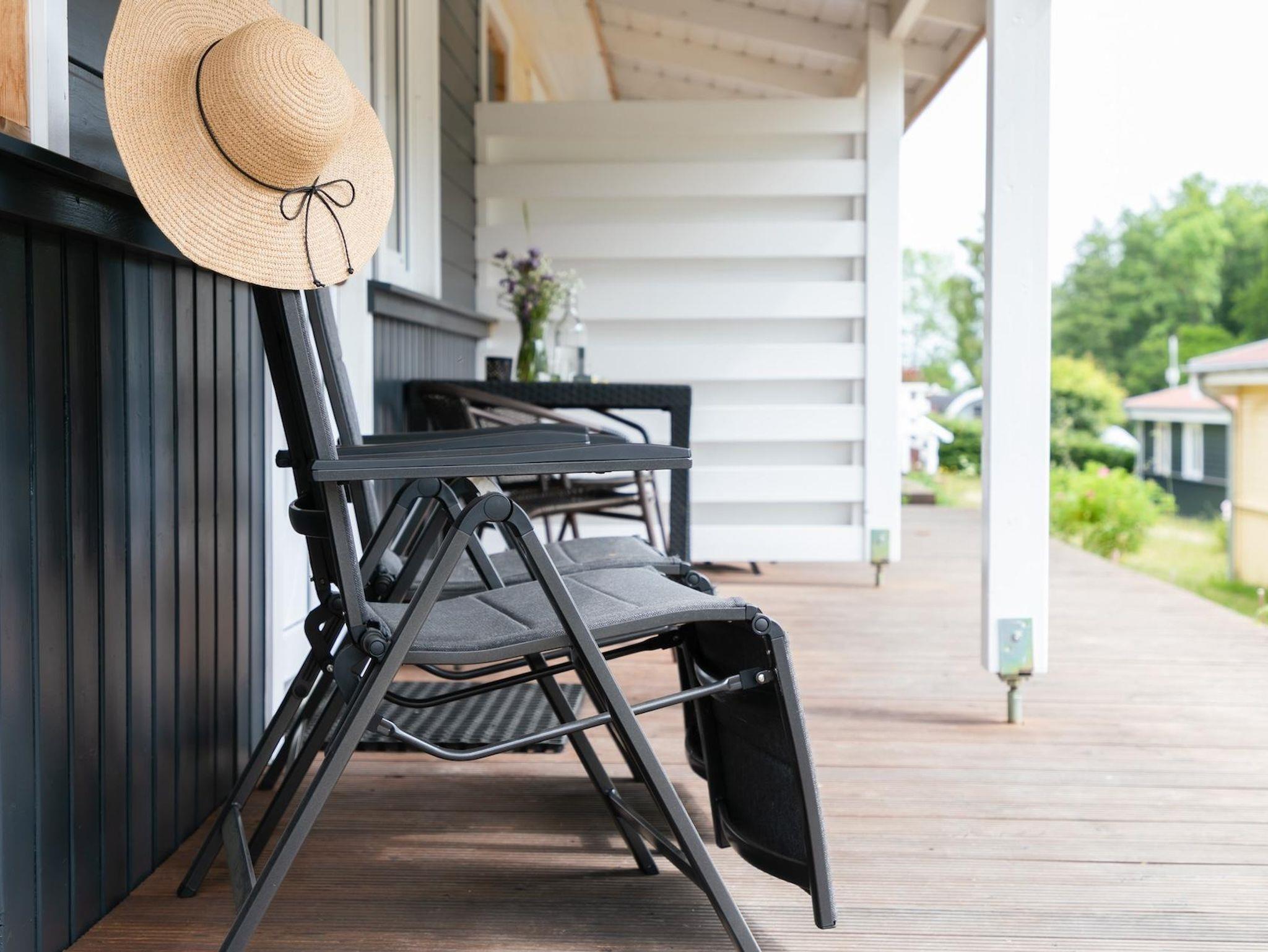 Die überdachte Holzterrasse ist mit Stühlen und einem Tisch ausgestattet und lädt euch dazu ein, den vielen Vögeln im naheliegenden Wald zu lauschen.