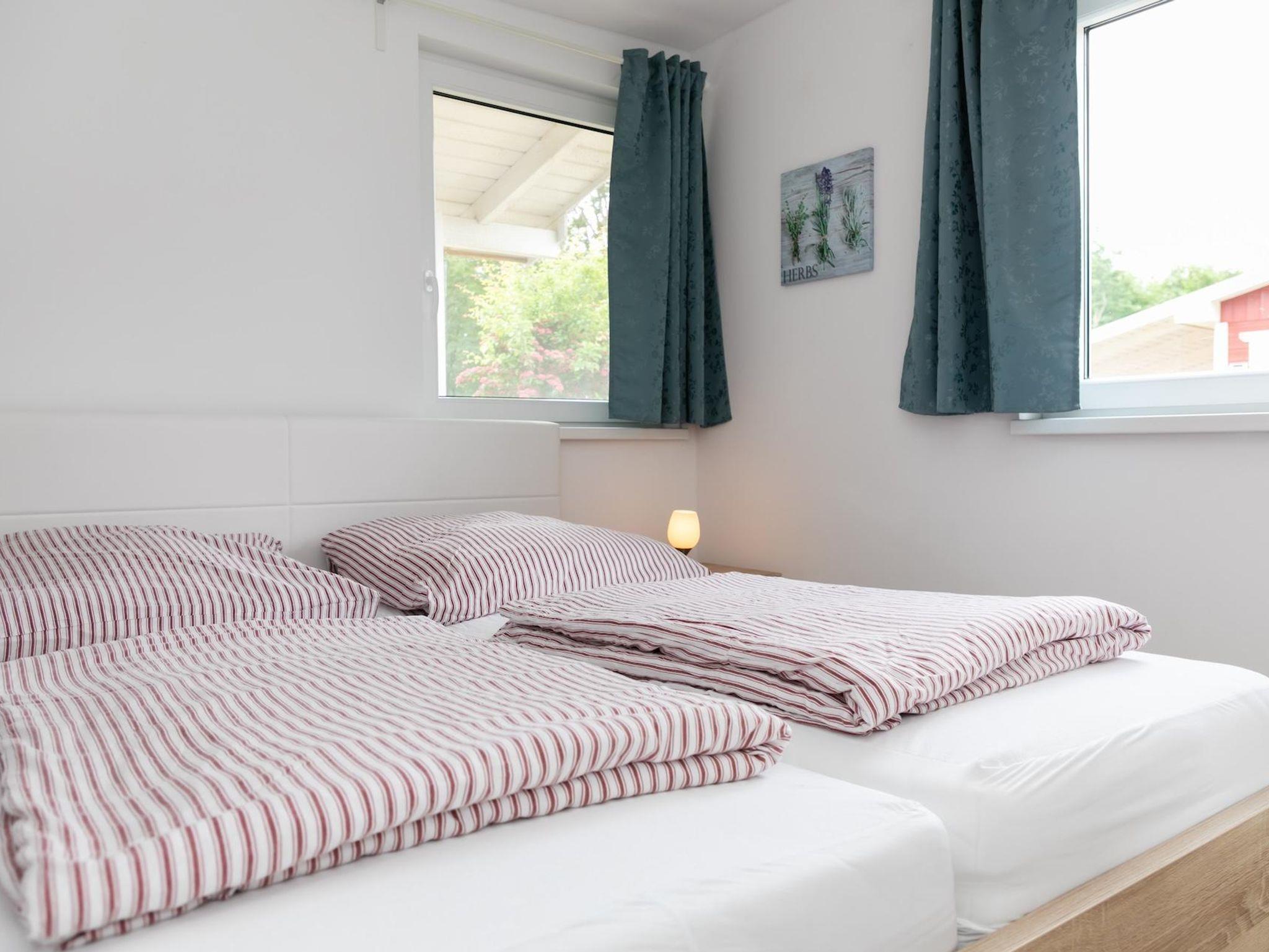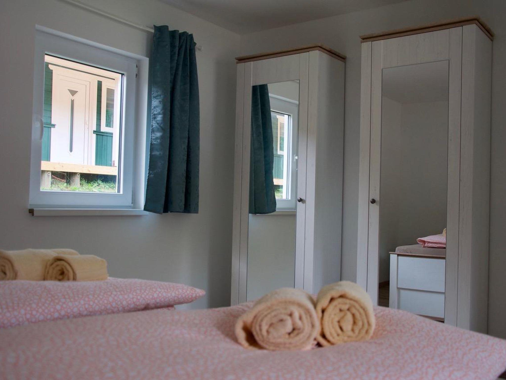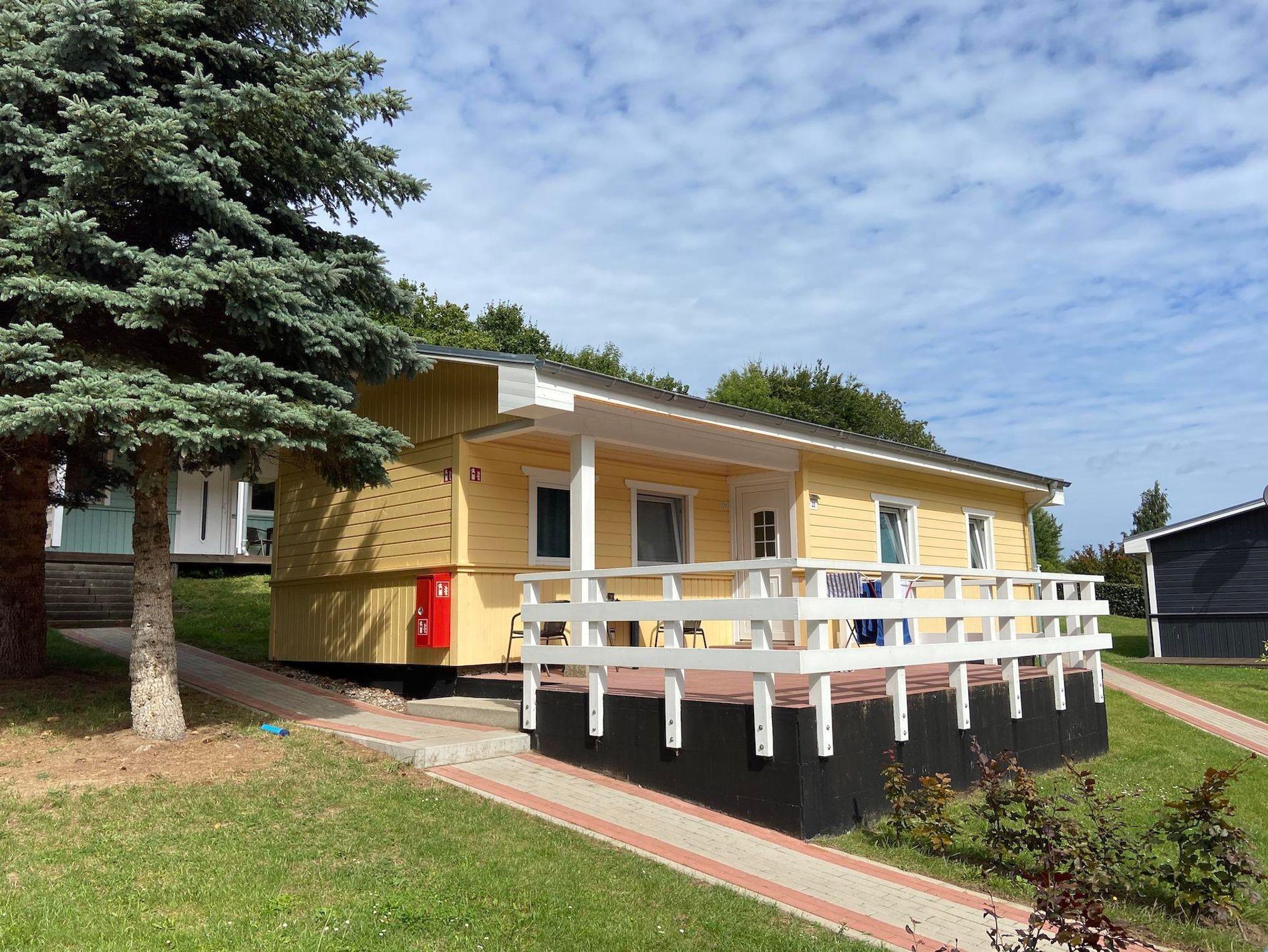 Dieser gemütliche Bungalow ist für 2 Personen und hat ca. 30 qm (Bj. 2018). Er hat ein Schlafzimmer mit Doppelbett (2 Matratzen à 80×200 cm) und Kleiderschrank. 2 Kissen und 2 Bettdecken sind vorhanden, nur die Bezüge müssen selbst mitgebracht werden. Die offene Wohnküche ist mit einem Kühlschrank, einem Herd mit Ceranfeld und einem Backofen sowie den wichtigsten Küchenutensilien ausgestattet. Ein Esstisch mit Stühlen, ein modernes Sofa, ein Couchtisch sowie ein Flachbildfernseher sorgen für Gemütlichkeit. Im Bad befindet sich eine ebenerdige Dusche, das WC und ein Waschbecken.