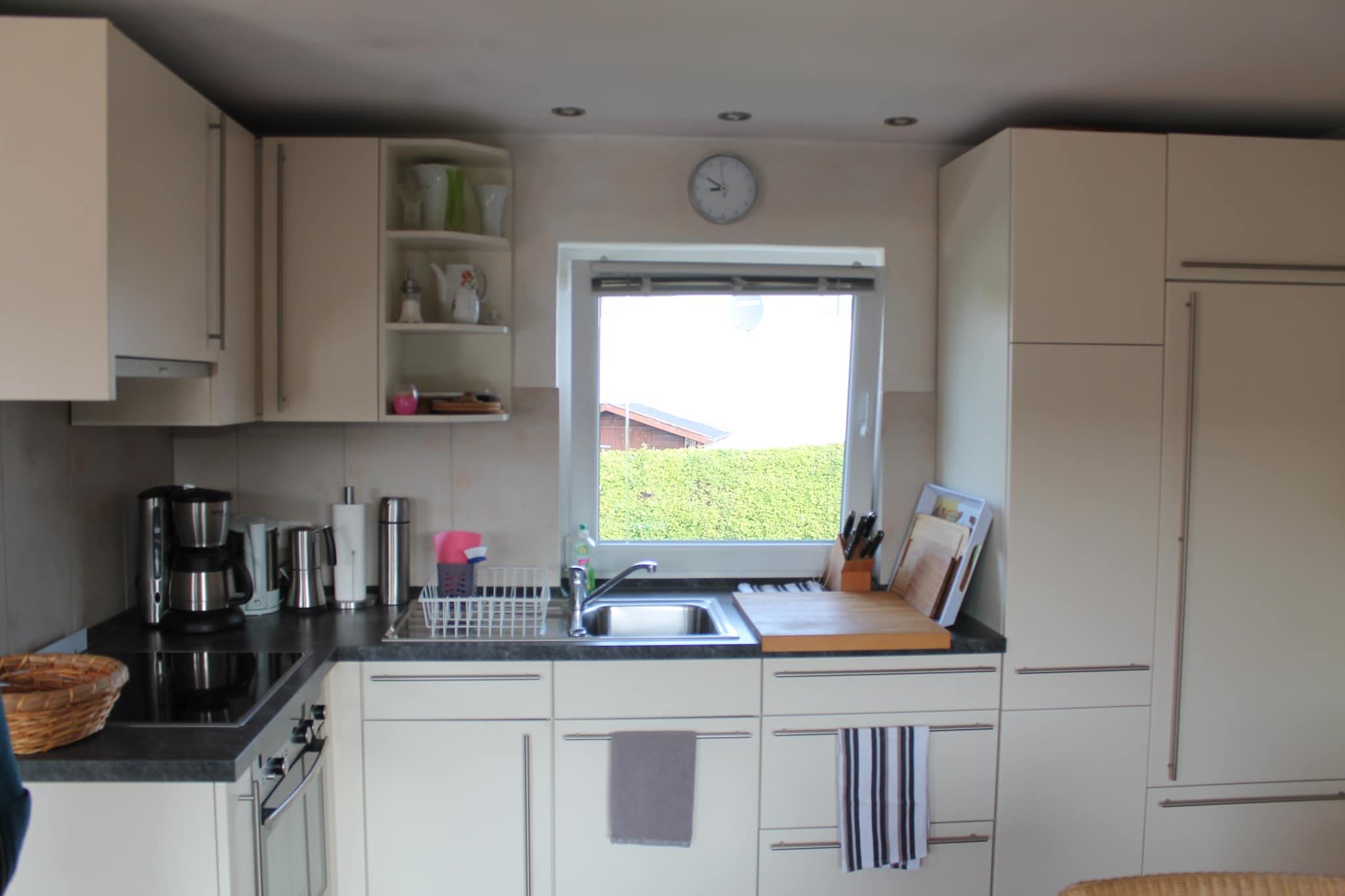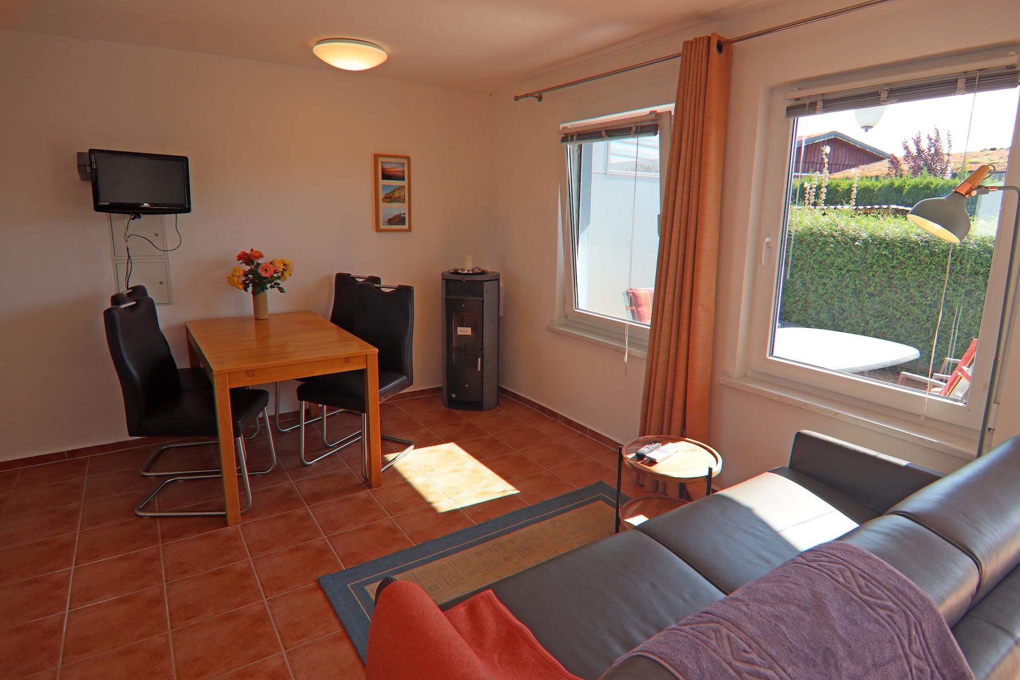 Parterre: (offene Küche(Esstisch(4 Personen), Wasserkocher, Toaster, Kochherd(4 Kochplatten, Ceranfeld), Dunstabzugshaube, Kaffeemaschine, Backofen, Kühlschrank(+ Gefrierfach)), Wohn-/Schlafzimmer(Doppelschlafcouch, TV, Radio, CD-Spieler), Schlafzimmer(Doppelbett), Badezimmer(Dusche(ebenerdige Dusche), Waschbecken, Toilette, Föhn), Heizung, Hochstuhl) Terrasse, Garten, Gartenmöbel, Grill, Parkplatz, Sonnenschirm