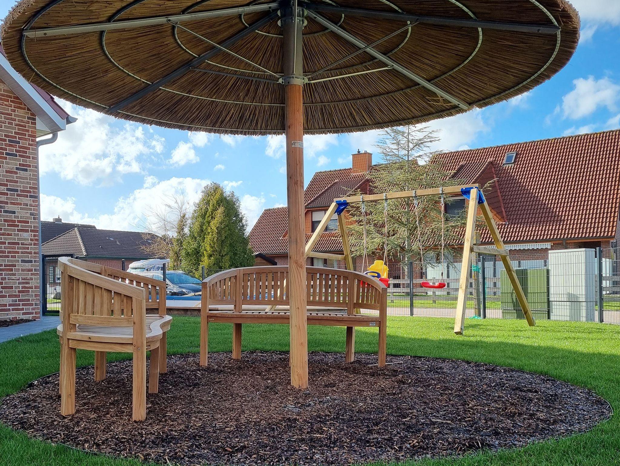 Im eigenen komplett eingezäunten Garten, finden wir tolle Spielmöglichkeiten für Kinder. Während die Kleinen sich austoben, finden die Erwachsenen gemütlich Platz unter dem Sonnenschirm und haben gleichzeitig die Kinder immer im Blick. Eine großzügige Terrassenüberdachung mit einem großen Tisch und Holzkohlegrill ist selbstverständlich in diesem Traumgarten vorhanden.