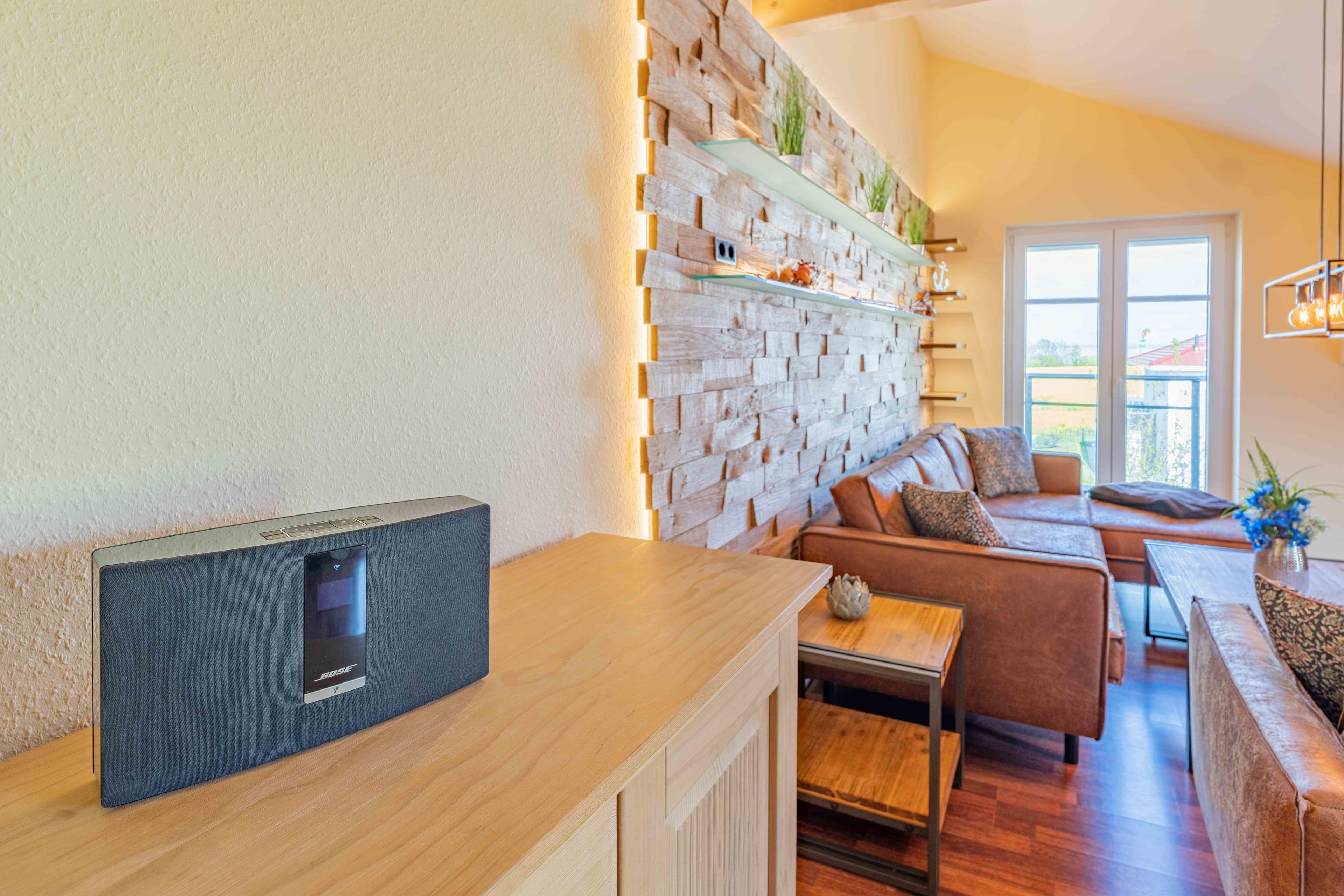 2. Obergeschoss: Küche mit Esstisch für 8 Personen, Kühl- und Gefrierkombination, Mikrowelle, Westbalkon mit Ostseeblick (Wohlenberger Wiek); Wohnzimmer mit TV, Kamin und Süd-Westfenstern (Blick auf die Wismarer Bucht und die Insel Poel), Bose Soundsystem mit Bluetooth