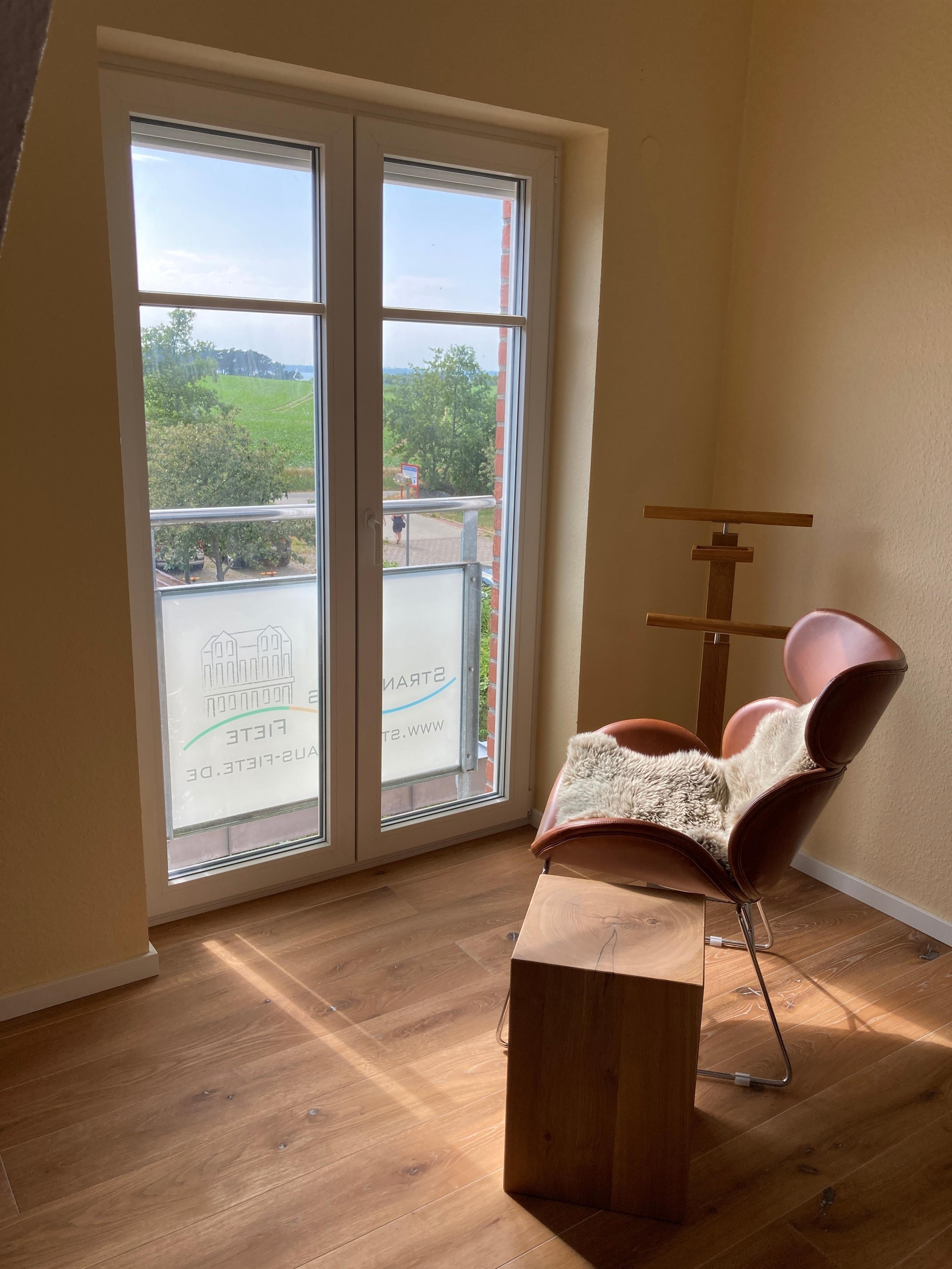 1. Obergeschoss: Schlafzimmer mit TV, Ostbalkon und Blick auf die Wismarer Bucht; Bad mit Dusche & Badewanne, sowie Fußbodenheizung