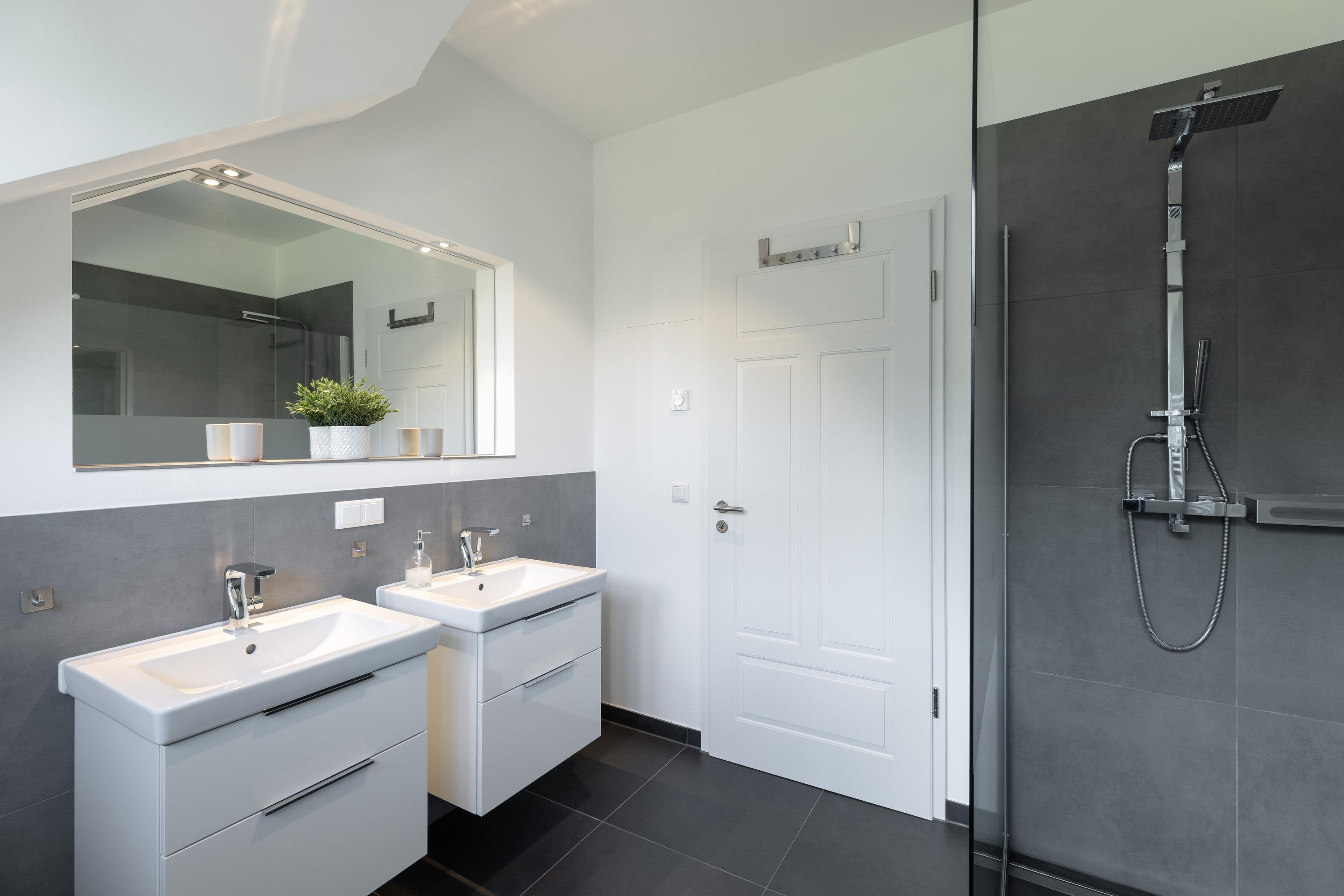 Die Bade-Lounge ist direkt vom großen Schlafzimmer aus zu begehen und bietet mit Badewanne, WC und zwei Waschbecken alle Annehmlichkeiten. Ein zusätzliches Bad mit Dusche, WC und zwei Waschbecken lässt auch bei voller Belegung des Hauses keine Engpässe entstehen.