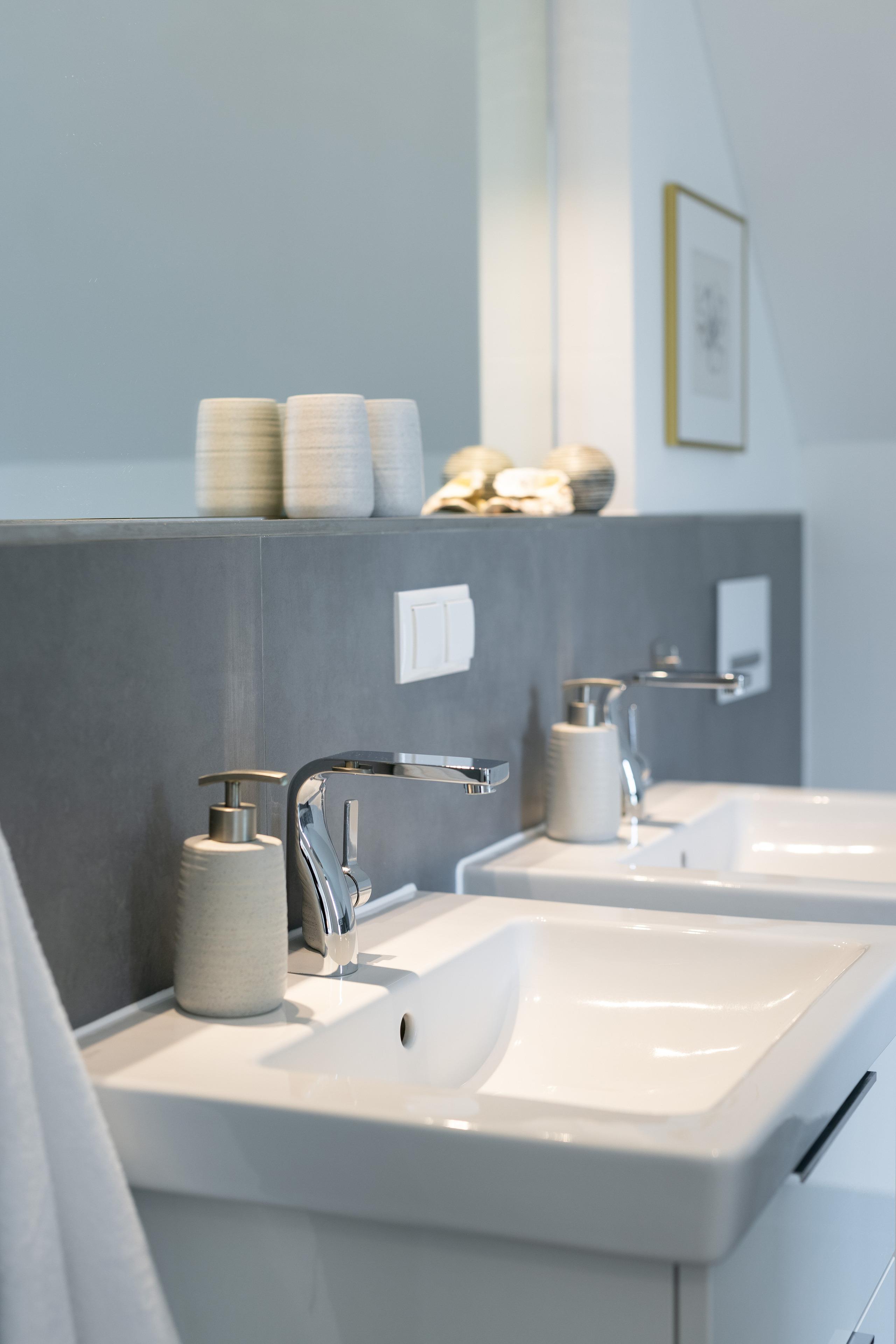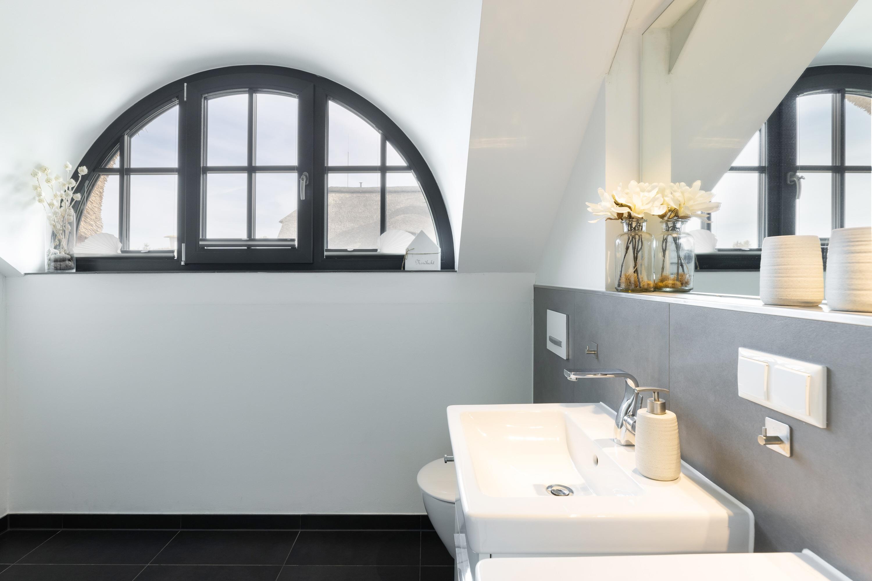 Die Bade-Lounge ist direkt vom großen Schlafzimmer aus erreichbar und bietet mit Badewanne, WC und zwei Waschbecken alle Annehmlichkeiten. Ein zusätzliches Bad mit Dusche, WC und zwei Waschbecken lässt auch bei voller Belegung des Hauses keine Wünsche offen.