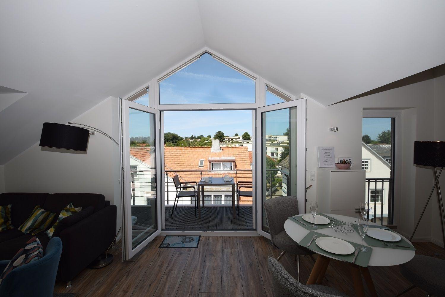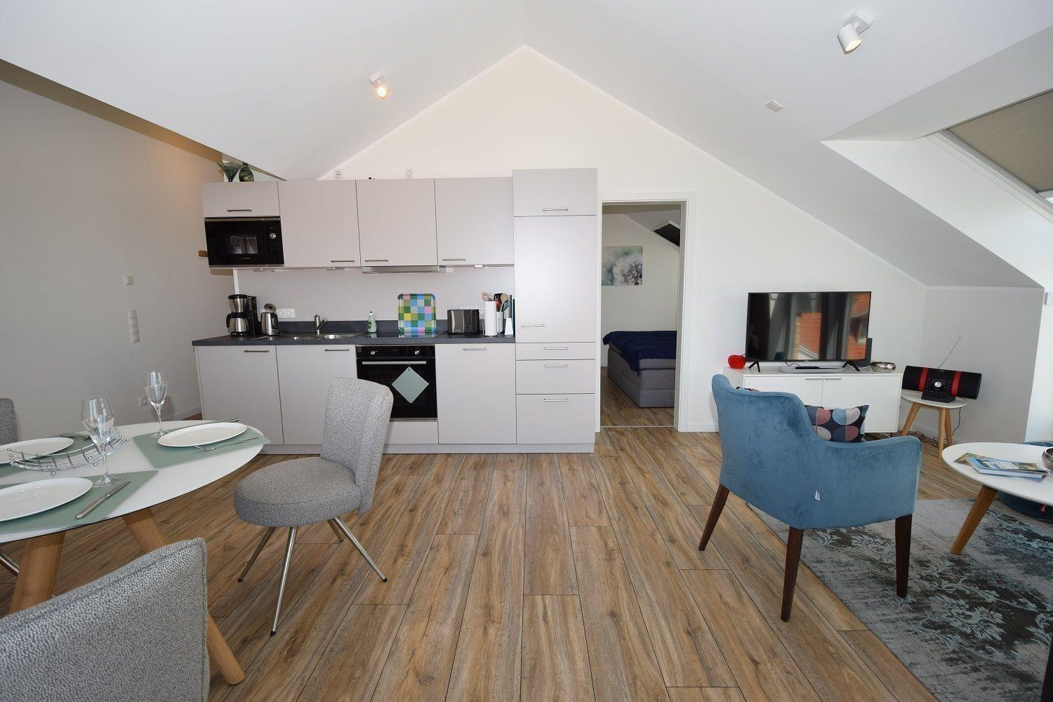 Die Studiowohnung "Storchennest" im Haus Meeresblick bietet Platz für zwei bis drei Personen und überzeugt durch ihre helle, moderne Ausstattung. Der Wohnraum ist lichtdurchflutet und verfügt über eine große Fensterfront sowie ein gemütliches Sofa, das zum Entspannen einlädt. Eine offene Küche mit angrenzendem Essplatz ist umfangreich ausgestattet, darunter Herd, Backofen, Kühlschrank mit Gefriermöglichkeit, Kaffeemaschinen und eine Spülmaschine. Das komfortable Schlafzimmer ist mit einem großen Doppelbett und einem großzügigen Schrank für ausreichend Stauraum ausgestattet. Das moderne Duschbad bietet eine bodentiefen Dusche, einen Waschtisch mit Spiegel und einen Handtuchwärmer. Ein Balkon mit Möbeln lädt dazu ein, die frische Luft zu genießen. WLAN ist verfügbar und ein Lift sorgt für barrierefreien Zugang. Haustiere sind erlaubt, maximal zwei mittelgroße Hunde.