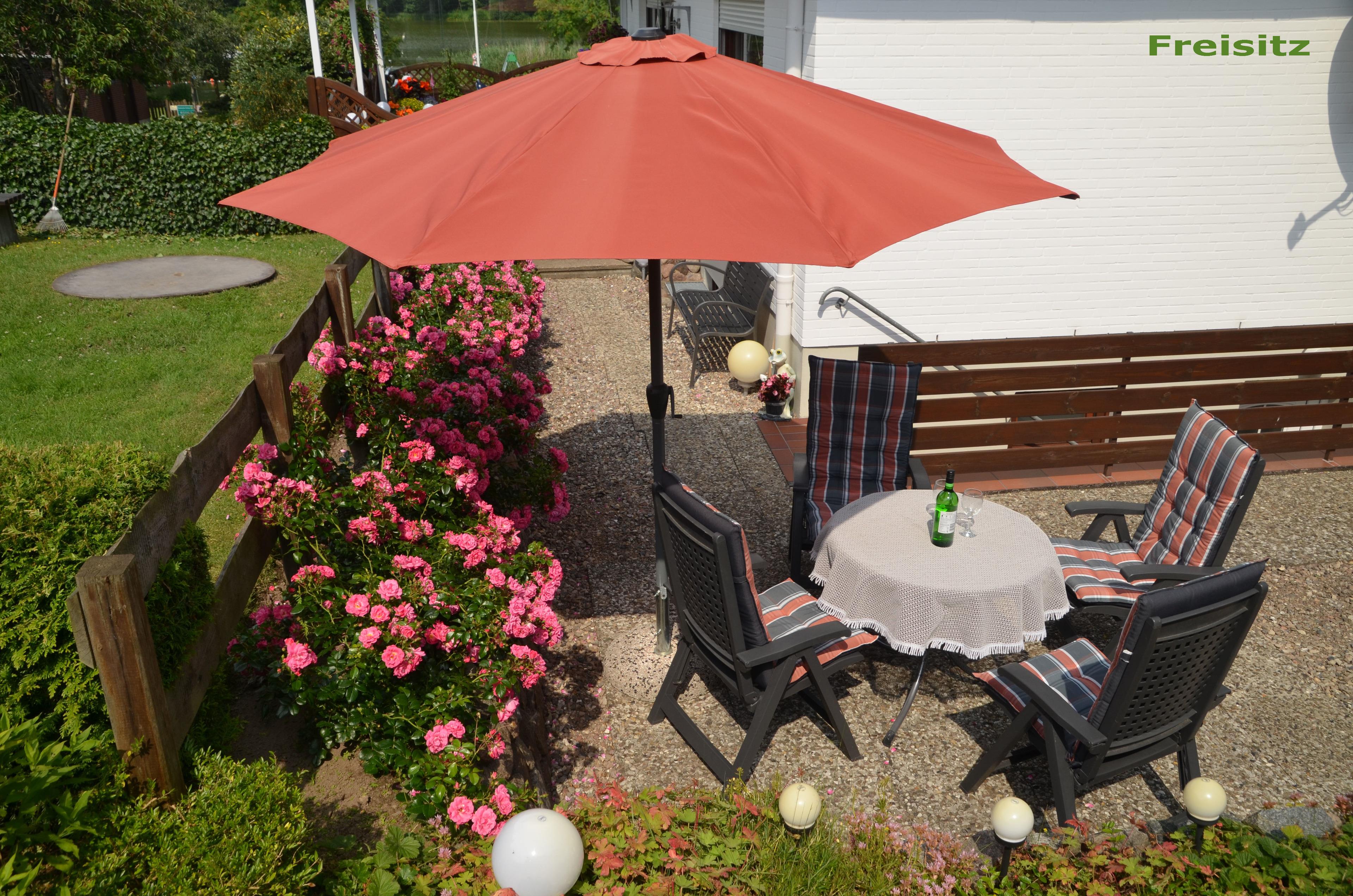 Draußen steht Ihnen ein Freisitz zur alleinigen Nutzung und ein Grill zur Verfügung. Kinder können sich in der Spielecke tummeln (Schaukel, Sandkiste).