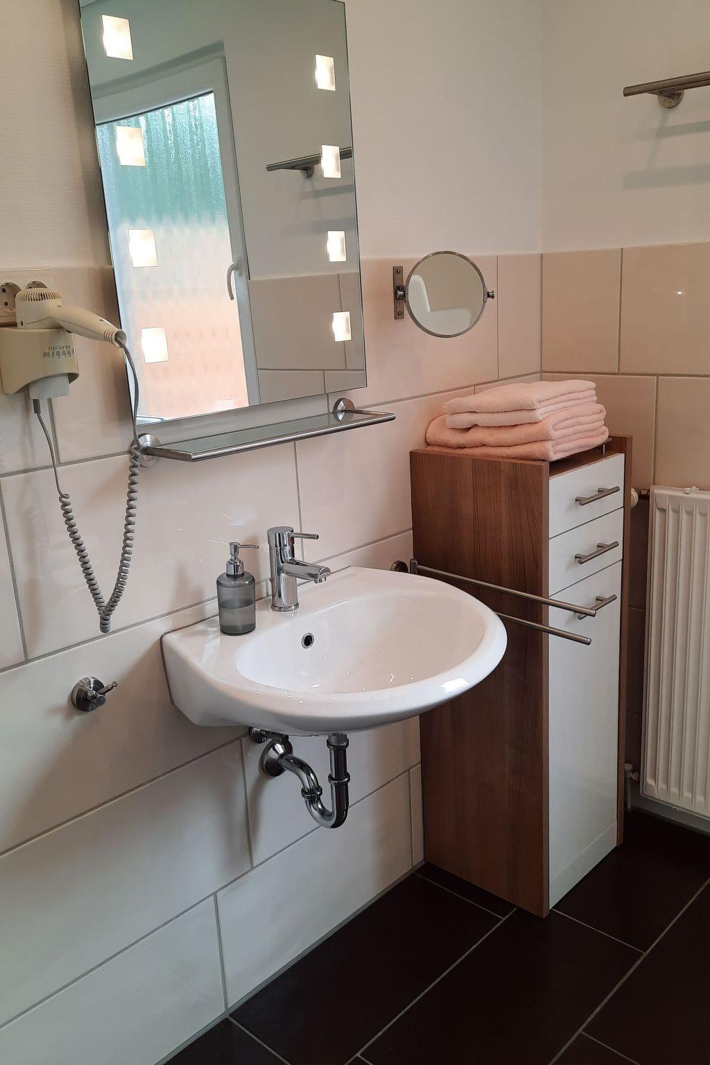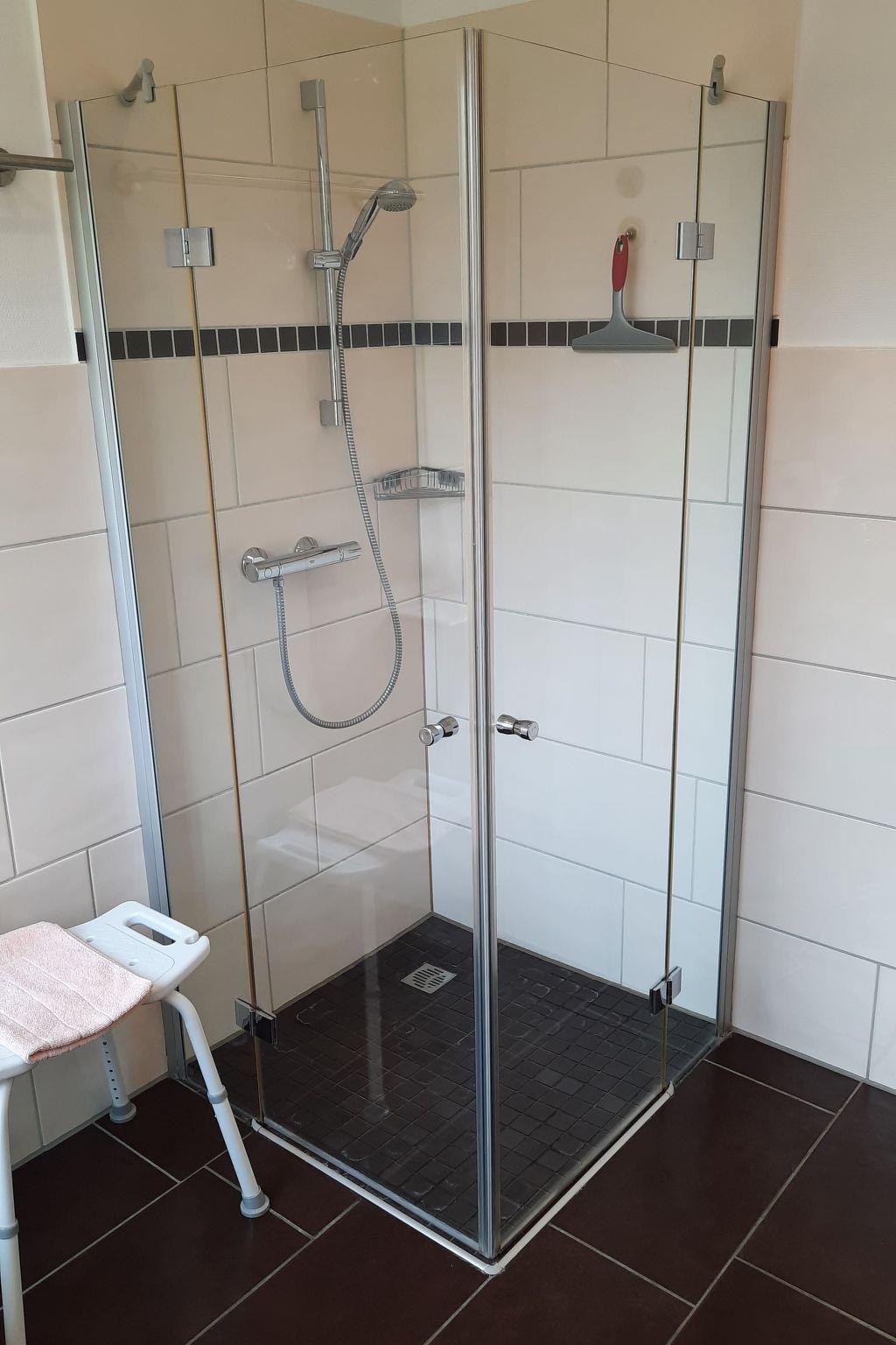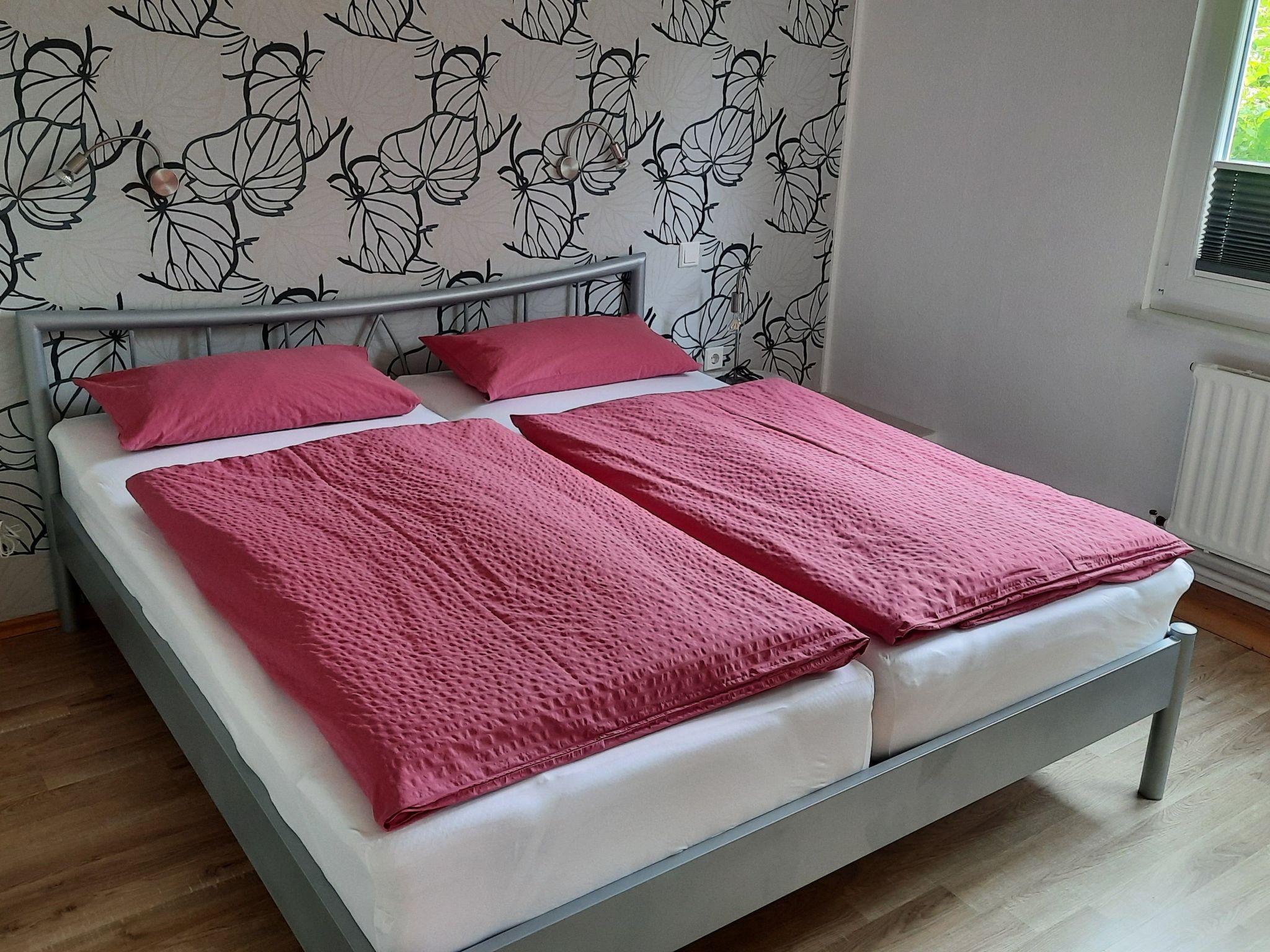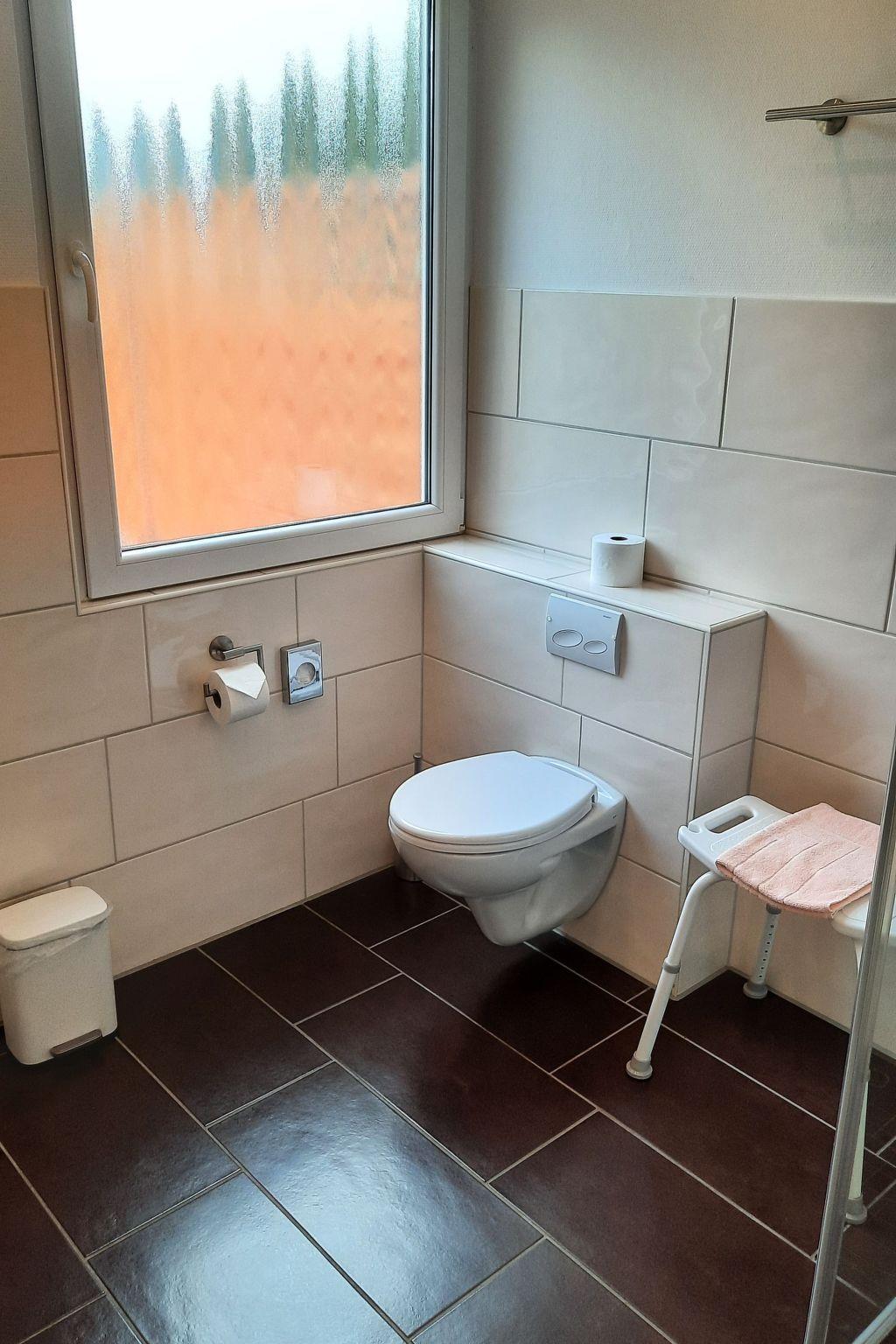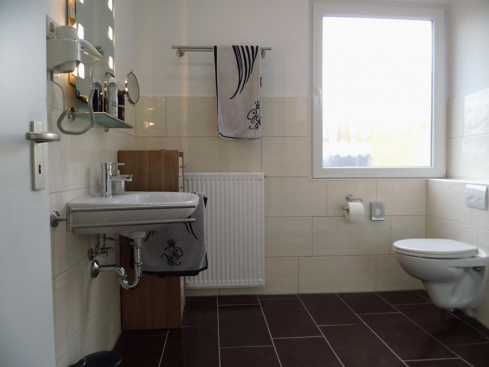 Diese ebenerdige Ferienwohnung eignet sich bedingt für Menschen mit Gehbehinderung (größere Schwelle, ca. 1/2 Stufe, zwischen Wohnbereich und Flur). Sie erstreckt sich auf einer Wohnfläche von ca. 73 m² in zwei Doppelzimmer, ein geräumiges Tageslichtbad, einen Flur mit Garderobe, sowie den Hauptraum als Wohn-, Ess- und Kochbereich. Im ersten Schlafzimmer wird Ihnen ein großzügiges Doppelbett einer Maße von 180 cm x 200 cm geboten. Des Weiteren bietet ein fünftüriger Kleiderschrank ausreichend Verstauungsmöglichkeiten für Ihr Reisegepäck. Zwei große Fenster lassen viel Tageslicht hinein und schenken Ihnen vor und nach dem Schlafengehen den Blick auf die grüne Umgebung. Das zweite Schlafzimmer ist mit zwei Einzelbetten ausgestattet und eignet sich somit ideal für Kinder. Selbstverständlich lassen sich die beiden Einzelbetten (90 cm x 200 cm) ebenfalls zusammen stellen. Der Nachttisch mit Leselampe neben dem Bett ermöglicht den Gästen vor dem Einschlafen noch ein gutes Buch zu lesen. Ein Kleiderschrank ist auch in diesem Zimmer vorhanden. Ein Kinderbett kann gegen Gebühr bei Vollbelegung zusätzlich bestellt werden. Herzstück der Wohnung ist die Wohnküche, die sich in einen voll ausgestatteten Kochbereich mit modernen Geräten zu Ihrer umfangreichen Selbstversorgung, einen gemeinsamen Essplatz und den gemütlichen Wohnbereich aufteilt. In der Einbauküche wird Ihnen eine Geschirrspülmaschine, ein Herd mit Cerankochfeld, Dunstabzugshaube und Backofen, ein Kühlschrank mit Gefrierfach, sowie Kleinelektrogeräte wie eine Kaffeemaschine, ein Wasserkocher, ein Toaster, und eine Mikrowelle geboten. Am Essplatz nehmen vier Gäste gemeinsam Platz. Im gemütlichen Wohnbereich entspannen Sie nach einem Tagesausflug auf der bequemen Ledercouch, sowie zwei Ledersesseln. Für Unterhaltung sorgt ein Flachbildfernseher mit Sat.-TV und Stereoanlage. Das Badezimmer zeichnet sich mit einer bodengleichen, verglasten Duschkabine, einem Badezimmerfenster, sowie Handwaschbecken und WC, Kosmetikspiegel und Haartrockner aus. Für einen störungsfreien Schlaf sind alle Fenster mit Insektenschutz ausgerüstet. Außerdem steht ein separater, abschließbarer Fahrrad-Abstellraum zur Verfügung.