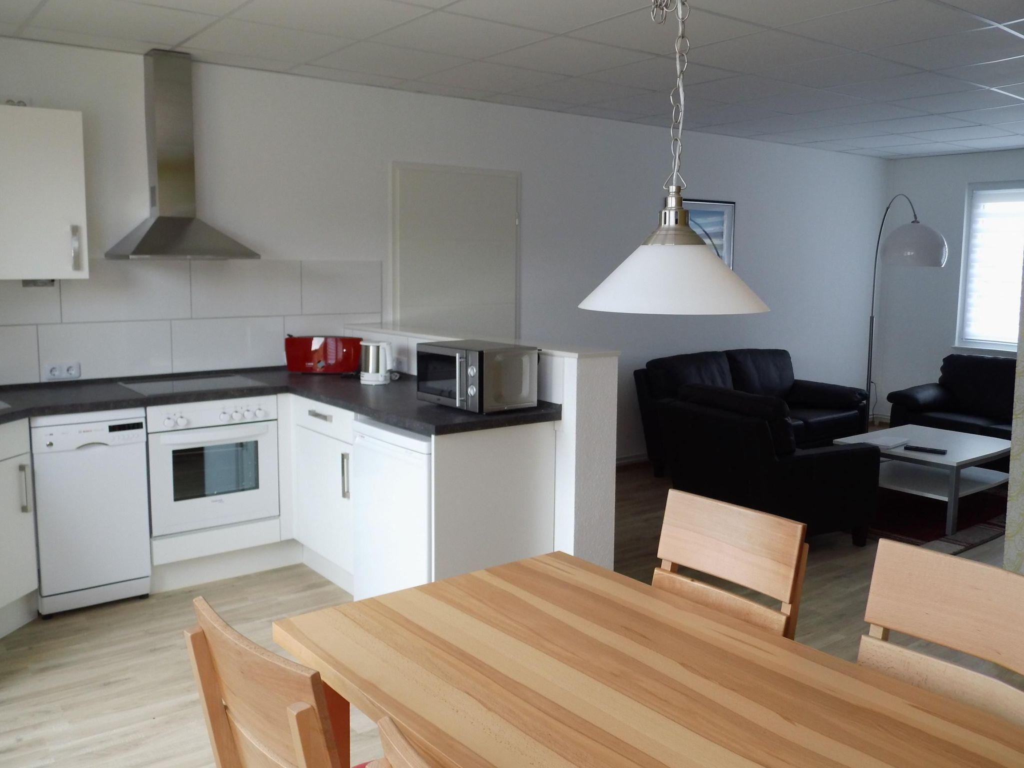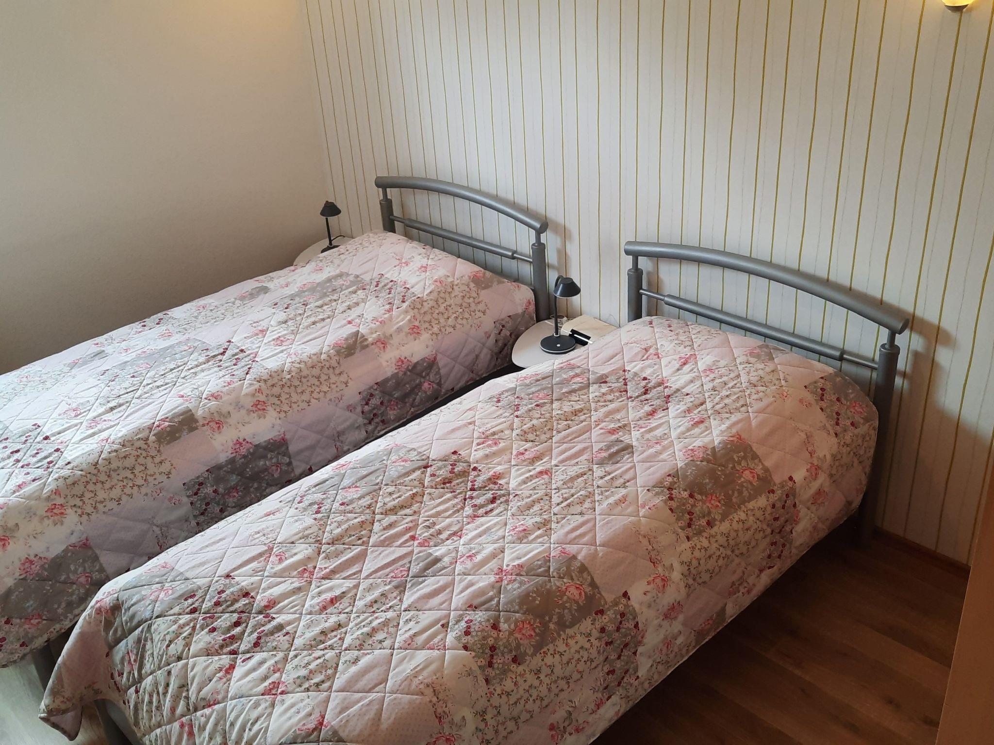 Diese ebenerdige Ferienwohnung eignet sich bedingt für Menschen mit Gehbehinderung (größere Schwelle, ca. 1/2 Stufe, zwischen Wohnbereich und Flur). Sie erstreckt sich auf einer Wohnfläche von ca. 73 m² in zwei Doppelzimmer, ein geräumiges Tageslichtbad, einen Flur mit Garderobe, sowie den Hauptraum als Wohn-, Ess- und Kochbereich. Im ersten Schlafzimmer wird Ihnen ein großzügiges Doppelbett einer Maße von 180 cm x 200 cm geboten. Des Weiteren bietet ein dreitüriger Kleiderschrank ausreichend Verstauungsmöglichkeiten für Ihr Reisegepäck. Zwei große Fenster lassen viel Tageslicht hinein und schenken Ihnen vor und nach dem Schlafengehen den Blick auf die grüne Umgebung. Das zweite Schlafzimmer ist mit zwei Einzelbetten ausgestattet und eignet sich somit ideal für Kinder. Selbstverständlich lassen sich die beiden Einzelbetten (90 cm x 200 cm) ebenfalls zusammen stellen. Der Nachttisch mit Leselampe neben dem Bett ermöglicht den Gästen vor dem Einschlafen noch ein gutes Buch zu lesen. Ein Kleiderschrank ist auch in diesem Zimmer vorhanden. Ein Kinderbett kann gegen Gebühr bei Vollbelegung zusätzlich bestellt werden. Herzstück der Wohnung ist die Wohnküche, die sich in einen voll ausgestatteten Kochbereich mit modernen Geräten zu Ihrer umfangreichen Selbstversorgung, einen gemeinsamen Essplatz und den gemütlichen Wohnbereich aufteilt. In der Einbauküche wird Ihnen eine Geschirrspülmaschine, ein Herd mit Cerankochfeld, Dunstabzugshaube und Backofen, ein Kühlschrank mit Gefrierfach, sowie Kleinelektrogeräte wie eine Kaffeemaschine, ein Wasserkocher, ein Toaster, und eine Mikrowelle geboten. Am Essplatz nehmen vier Gäste gemeinsam Platz. Im gemütlichen Wohnbereich entspannen Sie nach einem Tagesausflug auf der bequemen Ledercouch, sowie zwei Ledersesseln. Für Unterhaltung sorgt ein Flachbildfernseher mit Sat.-TV und Stereoanlage. Das Badezimmer zeichnet sich mit einer bodengleichen, verglasten Duschkabine, einem Badezimmerfenster, sowie Handwaschbecken und WC, Kosmetikspiegel und Haartrockner aus. Für einen störungsfreien Schlaf sind alle Fenster mit Insektenschutz ausgerüstet.
