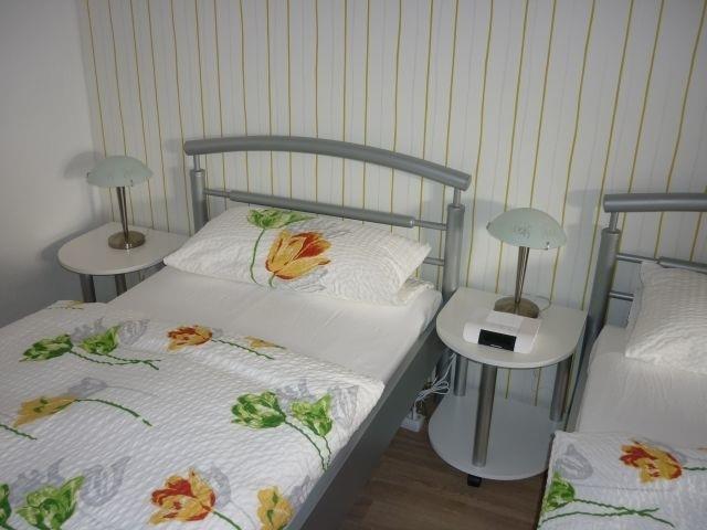 Die Ferienwohnung verfügt über zwei geräumige Schlafzimmer für vier Personen (ein Doppelbett und zwei Einzelbetten) und einen Hauptraum. Dieser unterteilt sich in einen Koch-/Essbereich mit vollwertiger Einbauküche und einen Wohnbereich mit bequemer Sitzecke und Fernseher. Die Wohnung ist ebenerdig und hat einen großen Vorflur. Für Fahrräder steht je Ferienwohnung ein separater abschließbarer Abstellraum zur Verfügung.