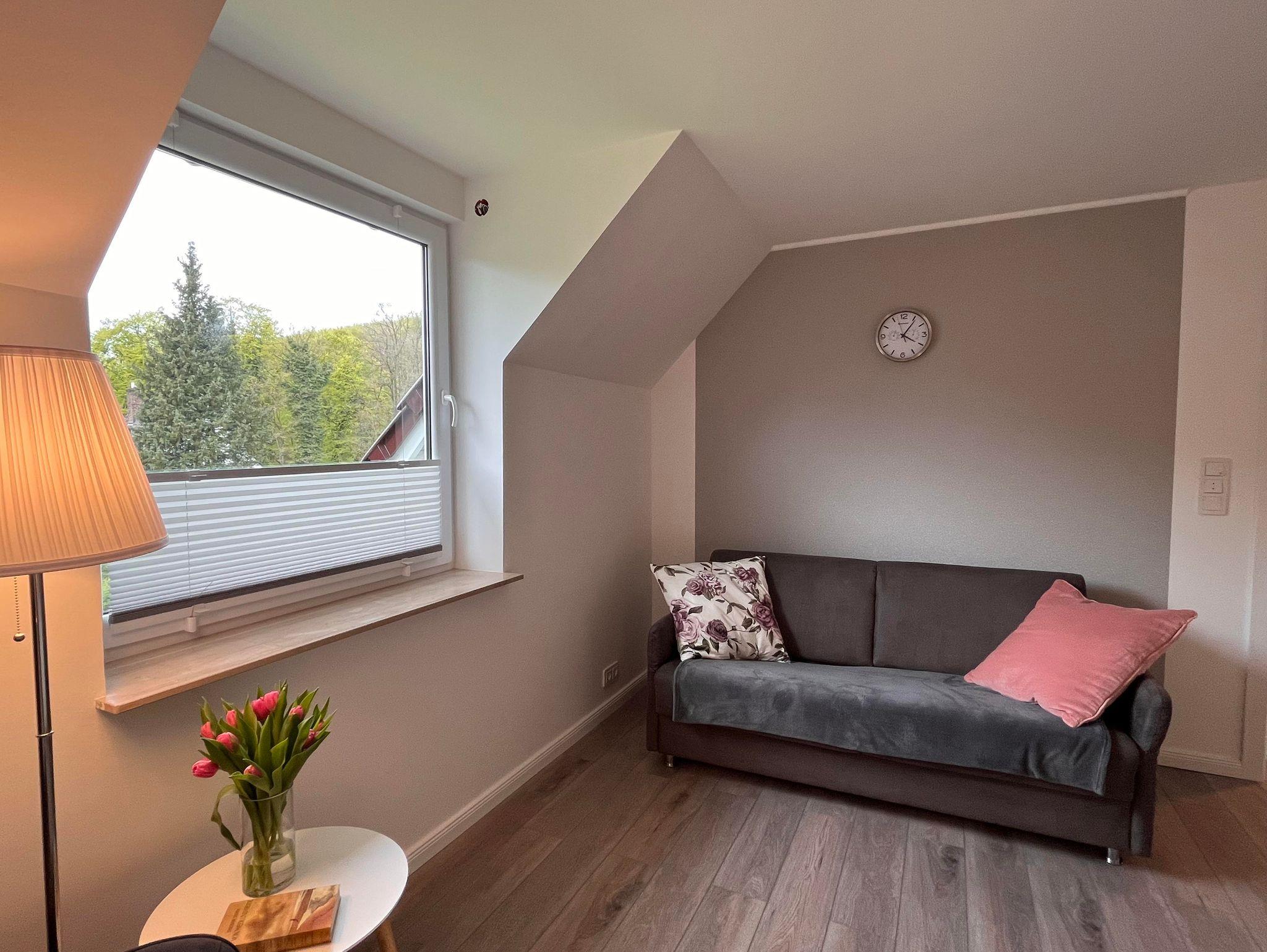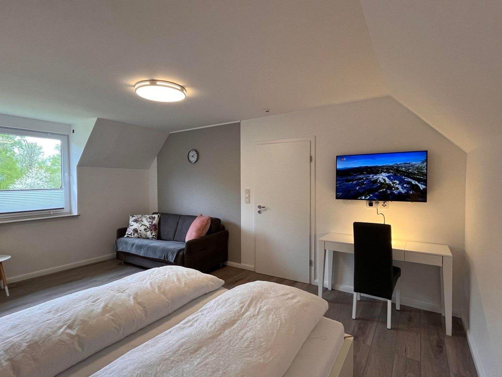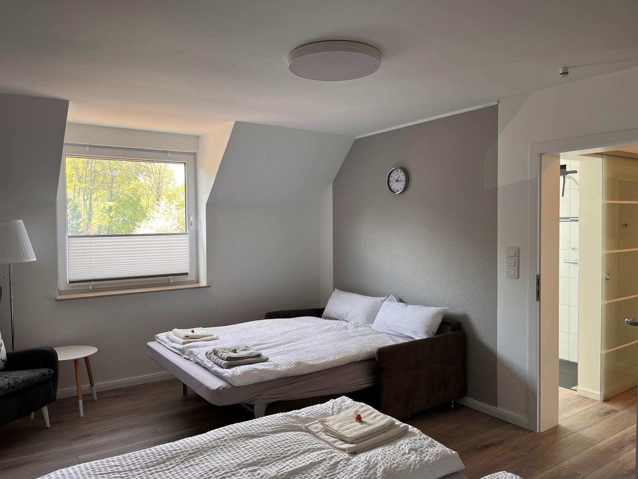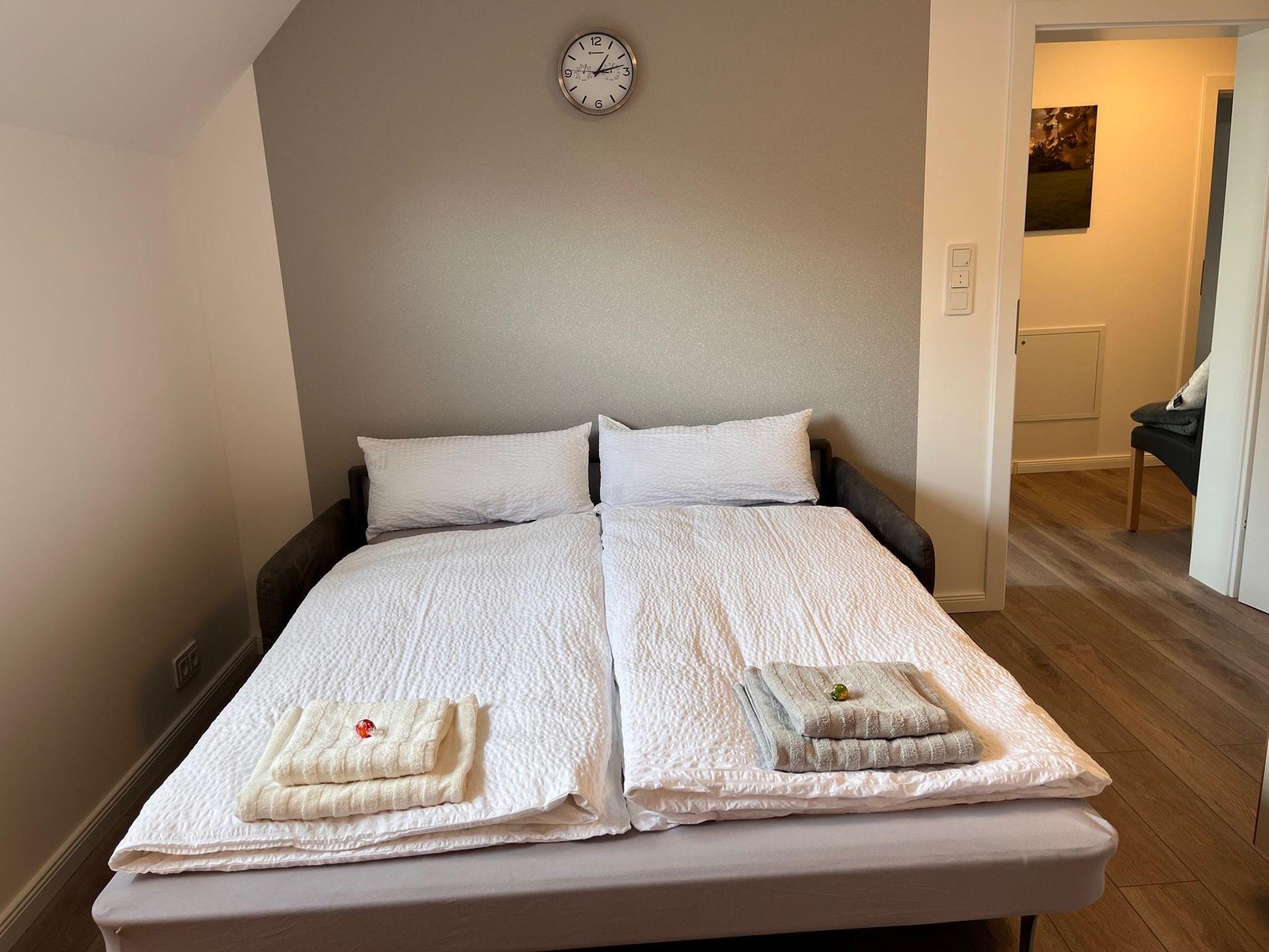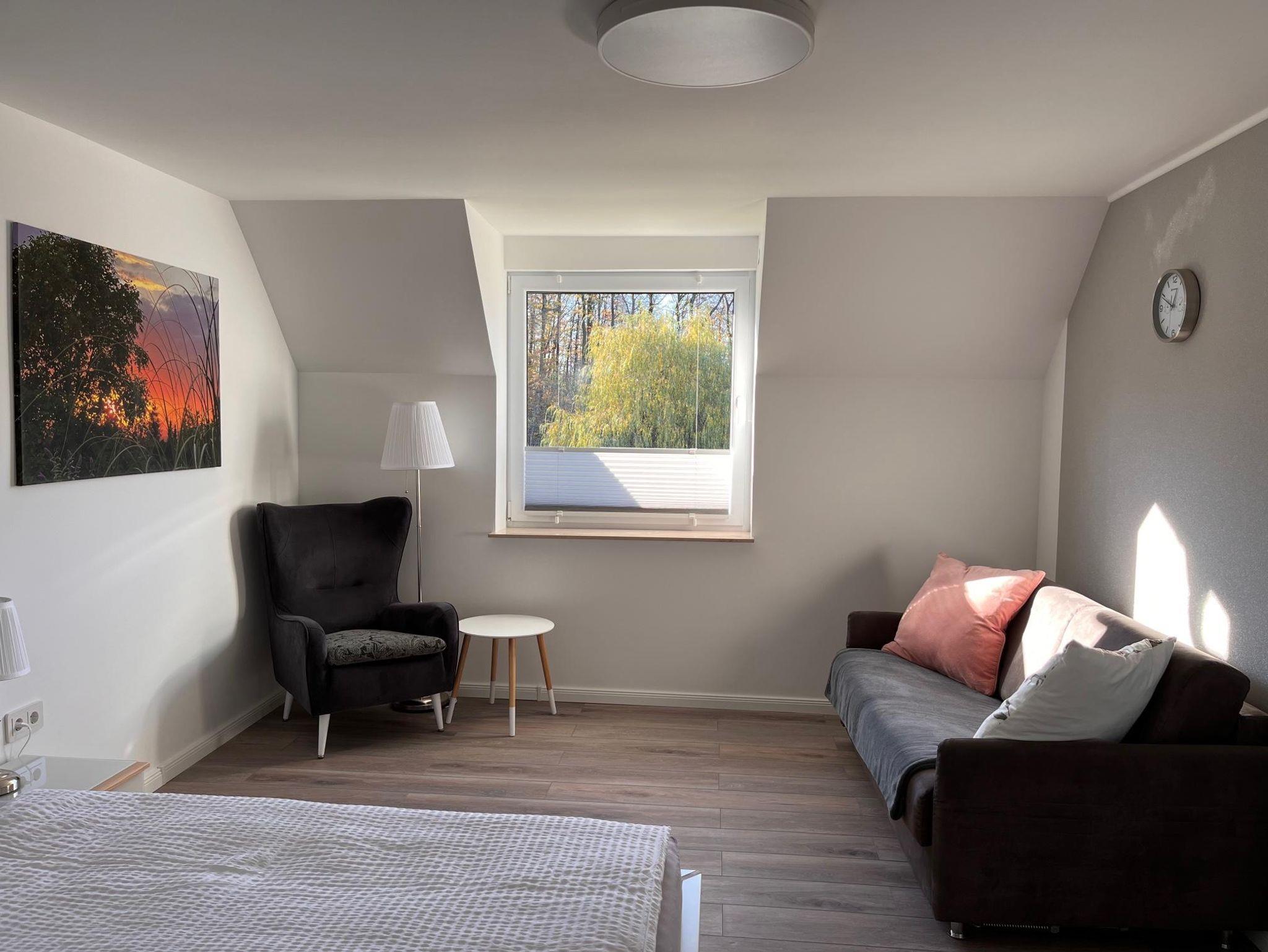 Das 28 m² große Apartment und das Bad sind lichtdurchflutet. Die Schallschutztüren, die den Wohn-/Schlafraum vom Flur und vom Gemeinschaftsraum/Küche trennen, sorgen für Ruhe und ungestörten Schlaf. In den Außenwänden des Hauses ist eine Wandstrahlungsheizung installiert, so dass es in der kalten Jahreszeit angenehm warm ist und an heißen Tagen das Haus gekühlt werden kann. Das Apartment bietet Platz für bis zu 4 Personen. Der Wohn-/Schlafraum ist mit elektrischen Rollläden ausgestattet. Das 180 x 200 cm große Doppelbett ist mit orthopädischen Matratzen ausgestattet. Die 140 x 200 cm große Schlafcouch ist mit Lattenrost und Matratze ausgestattet. Eine Waschmaschine und ein Wäschetrockner stehen ab der 8. Übernachtung oder nach Absprache zur Verfügung. Rauchen ist im Haus nicht erlaubt. Die Wohn-/Schlafräume und die Wohnküche sind mit Rauchmeldern ausgestattet. Wir lieben Tiere, aber die Vierbeiner sind in diesem Haus leider nicht erlaubt, da wir allergikerfreundliche Apartements anbieten.