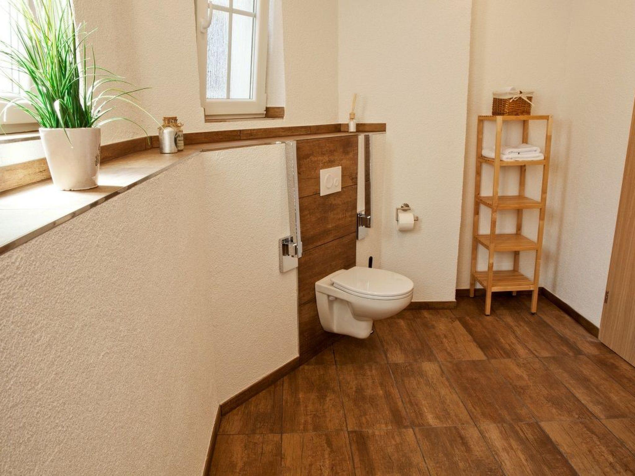 Barrierefreiheit: Die Ferienwohnung bietet barrierefreie breite Durchgänge. Das großzügige Badezimmer wurde mit einer extragroßen bodenebenen Dusche (Duschhocker und fahrbarer Nachtstuhl auf Anfrage), einem unterfahrbarem Waschbecken mit großem Spiegel und einem erhöhtem WC mit beidseits abklappbaren Haltegriffen ausgestattet.