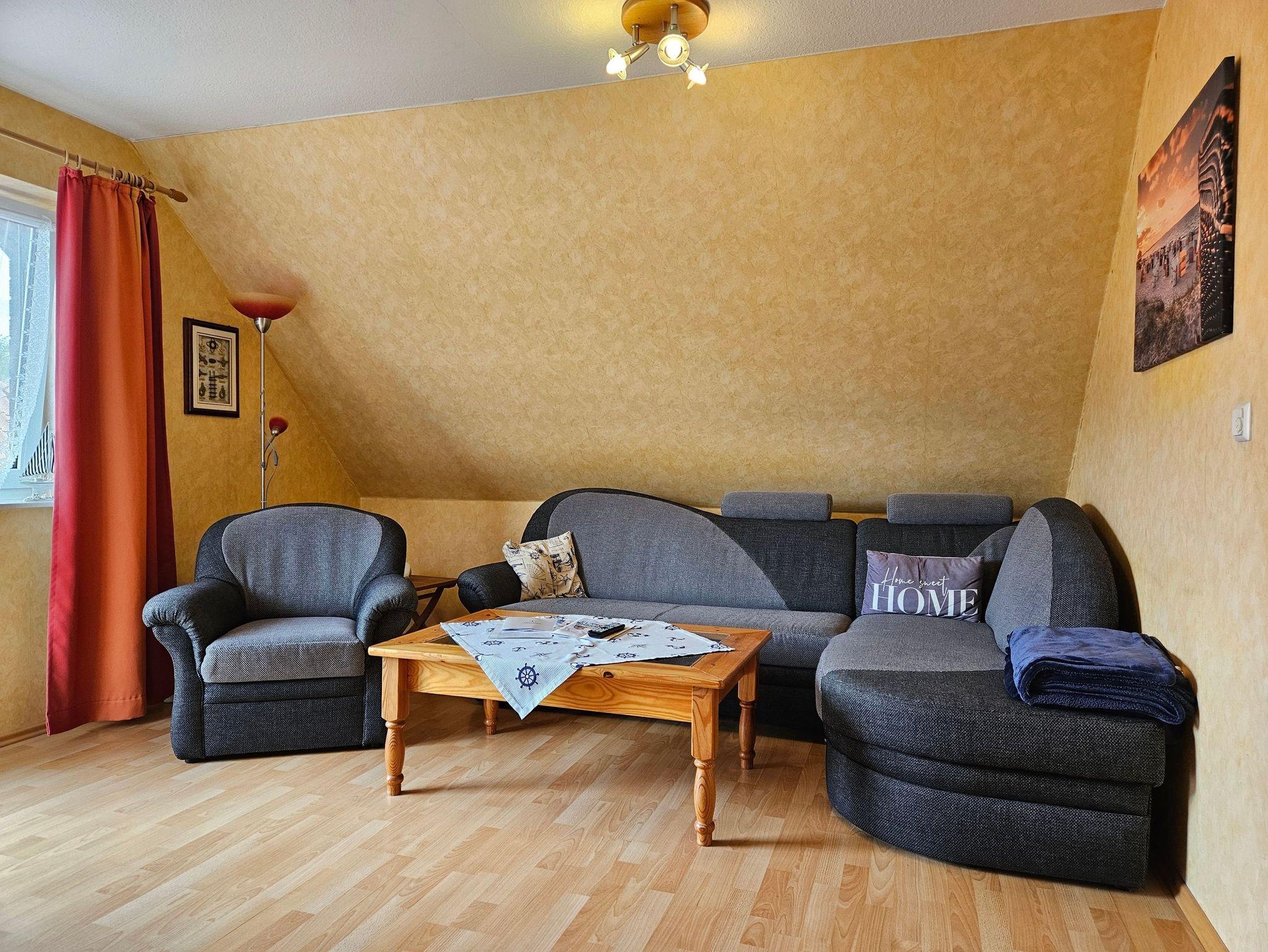 Die Nichtraucherwohnung Seestern ist komfortabel und gemütlich eingerichett. Sie befindet sich im Obergeschoß eines Einfamilienhauses mit zwei Ferienwohnungen. Sie bietet einen Schlafraum, einen großen Wohnraum mit Balkon, eine Küche mit Eßecke sowie ein helles Badezimmer mit Tageslicht. Flachbild-Fernseher, Blu-ray-Player und WLAN sind vorhanden. In der Küche stehen Geschirrspüler, Backofen, Wasserkocher, Mikrowelle sowie Kühlschränke mit Eisfach zur Verfügung.