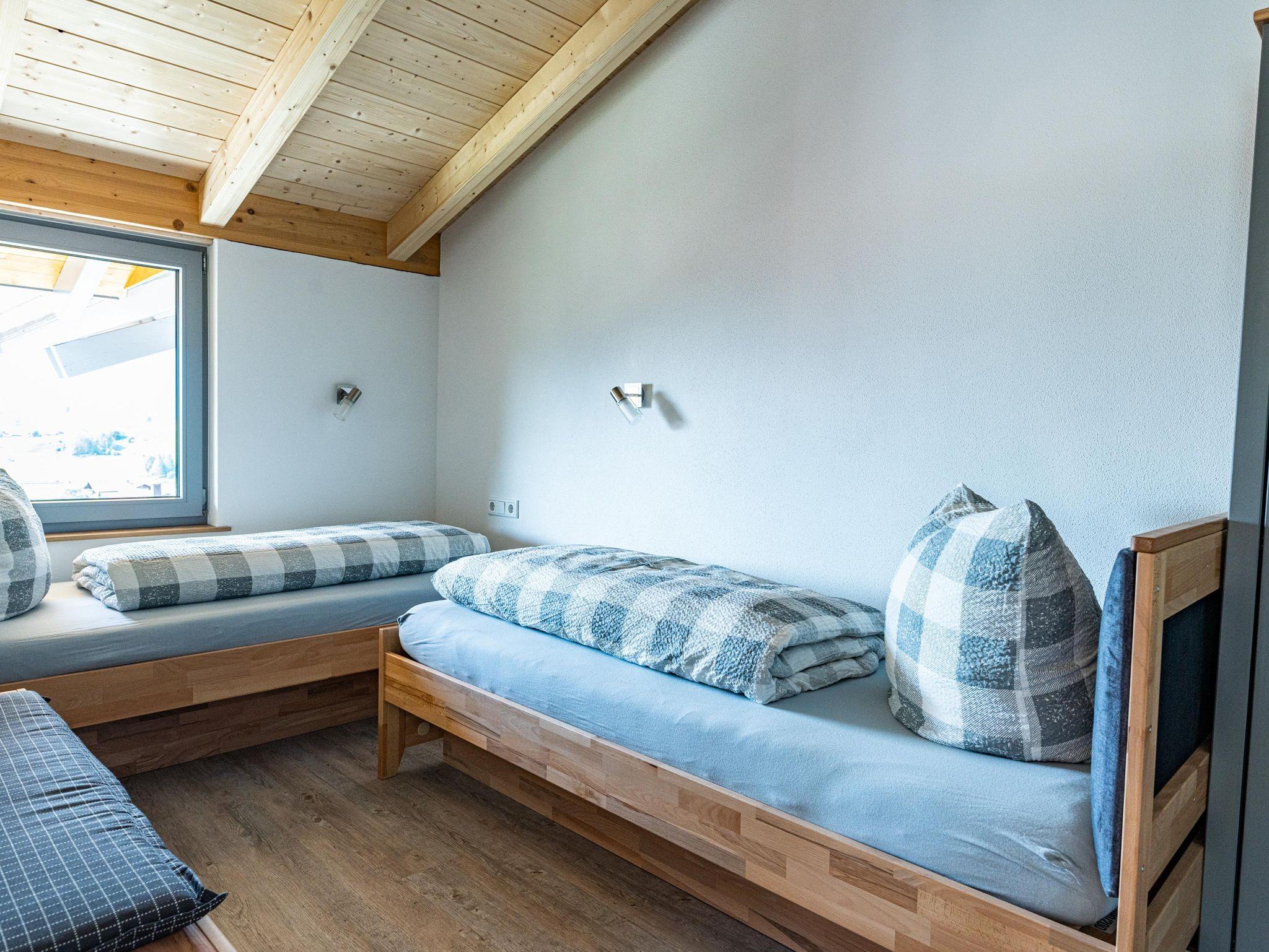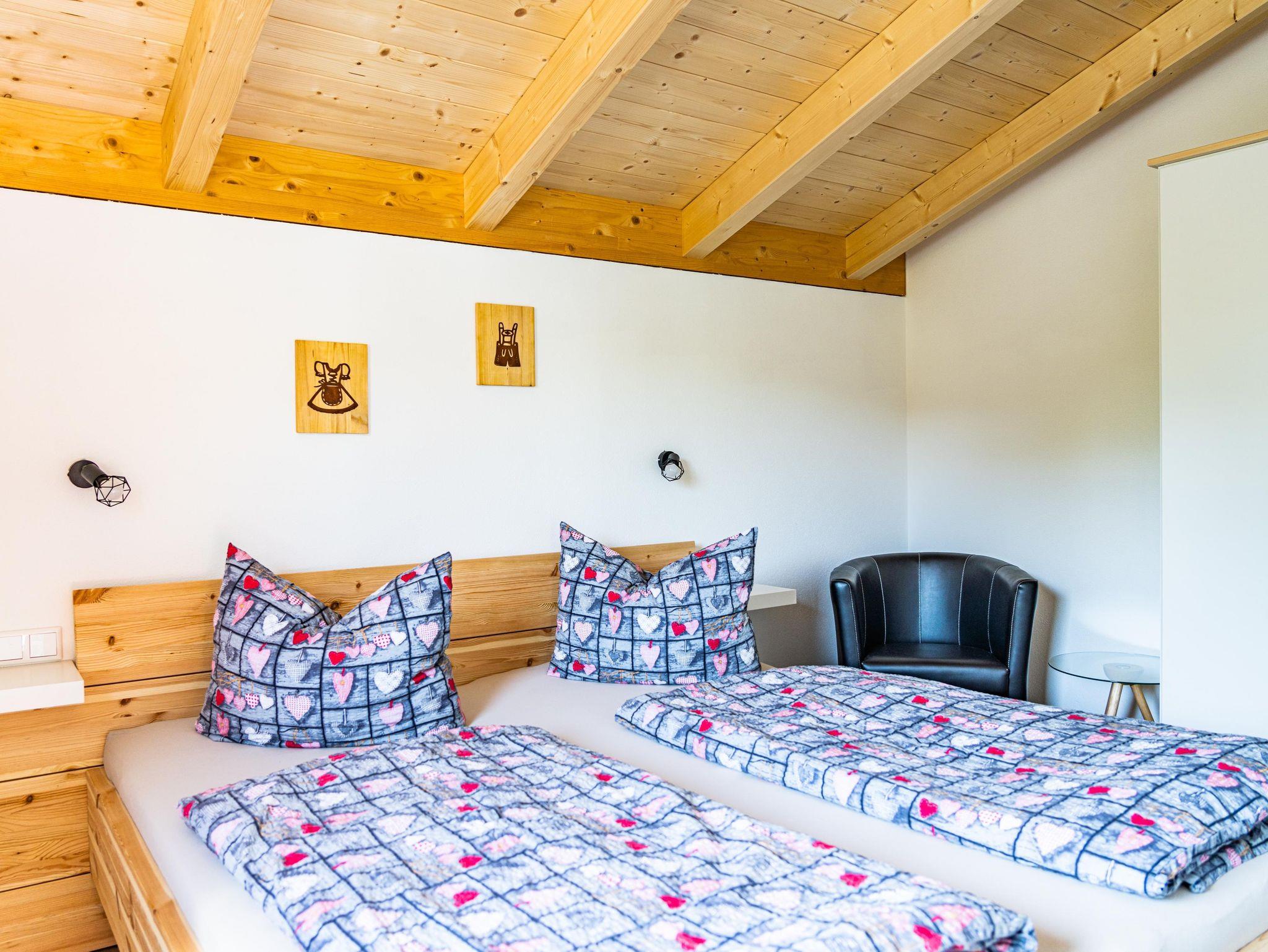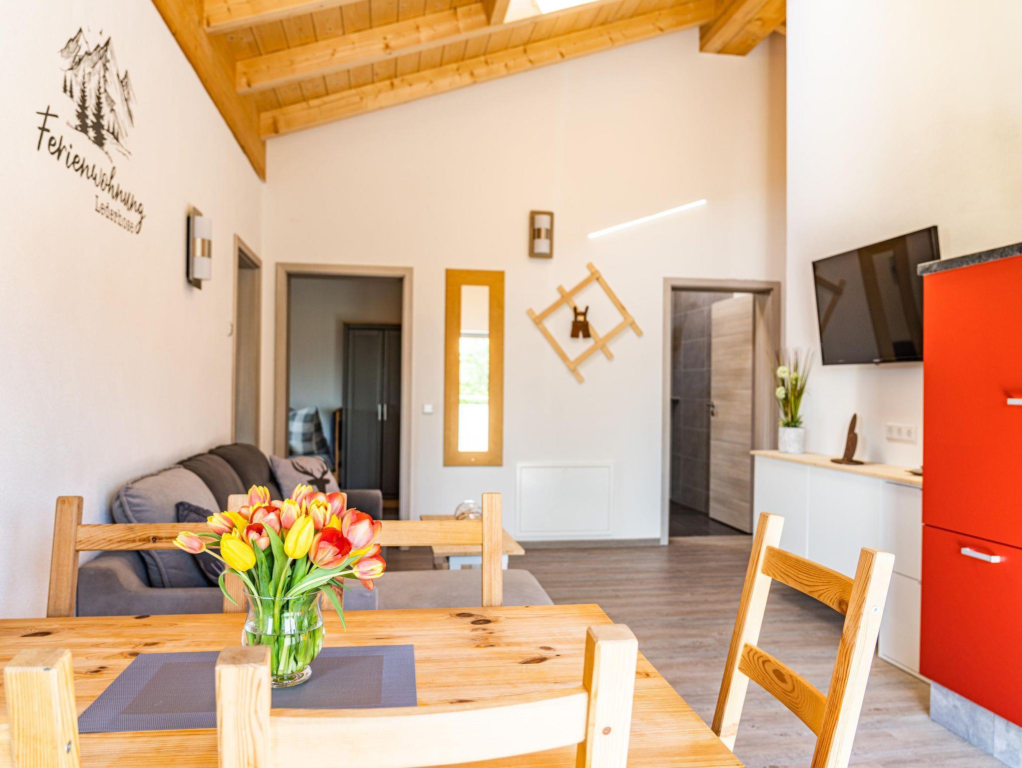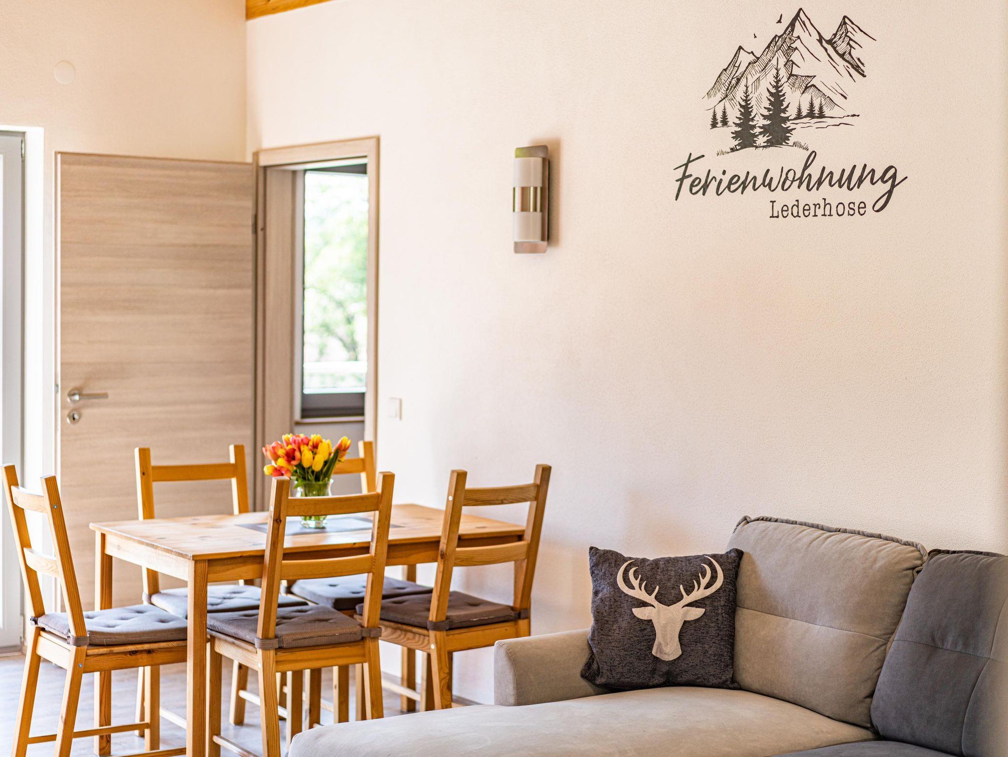 Unsere neue Ferienwohnung „Lederhose“ für bis zu 5 Personen bietet 3nSchlafzimmer (1 Doppel-, 1 Zweibett- u. 1 Einzelzimmer mit elektrischen Außenrollos zur Verdunkelung) und ist somit besonders für Familiengeeignet.Der freundliche Wohnbereich mit offenem Sichtdachstuhl ist für Sie mit gemütlicher Fernseh-Couch, Essbereich und moderner Küche mit Spülmaschine und Induktionsherd ausgestattet. Das moderne Badezimmer besticht mit ebenerdig begehbarer Regendusche.