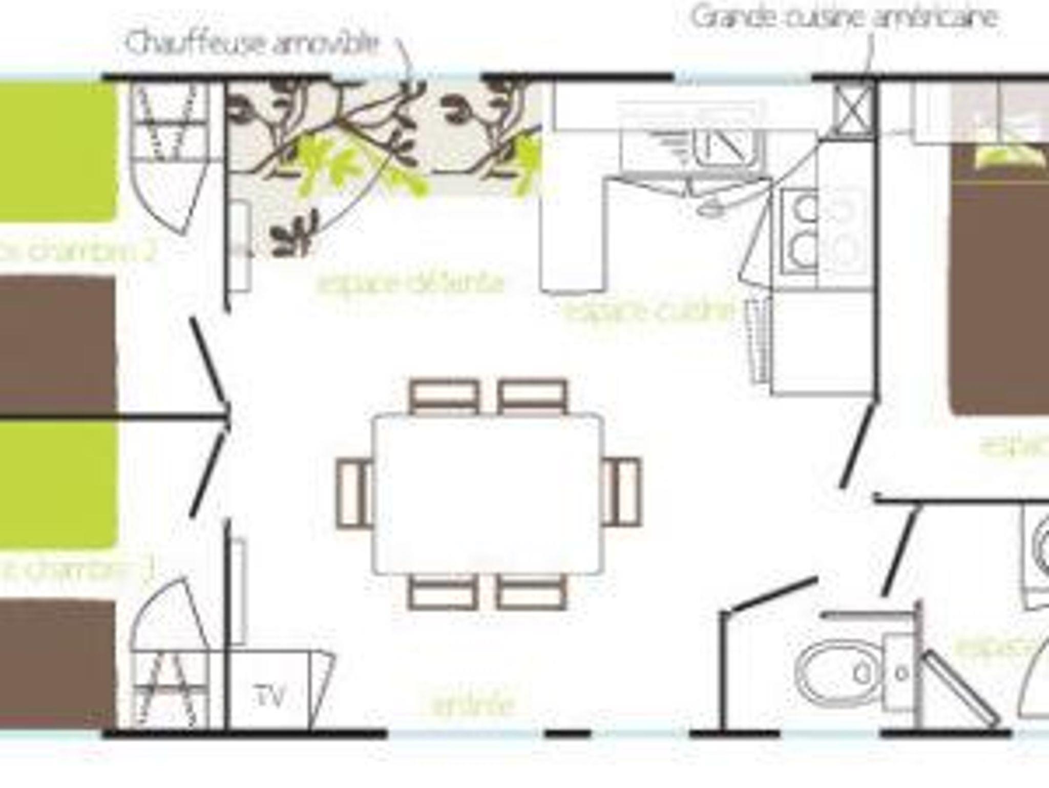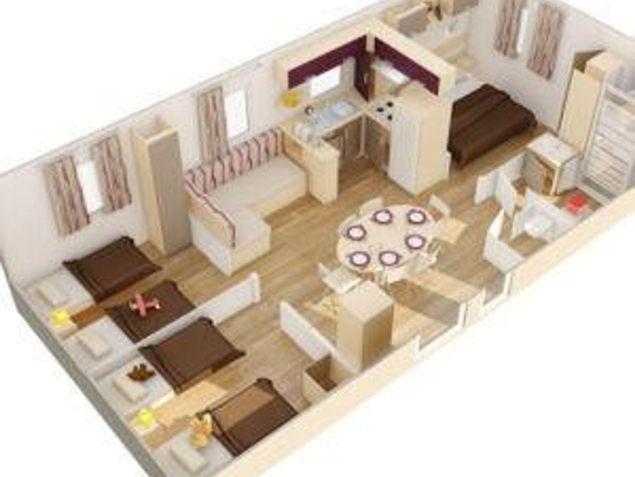 Im Mobilheim groß wohnen Sie auf komfortablen 35 m² mit eigener Terrasse. Dieses liebevoll eingerichtete Haus verfügt über drei separate Schlafräume – ein Doppelzimmer mit einem franz. Bett (1,90m x 1,40m) und zwei Zimmer mit je zwei Einzelbetten (1,90m x 0,80m). Fühlen Sie sich vom ersten Augenblick wohl in dem hellen, offenen Wohnbereich mit eingebauter Küche und gemütlicher Sitzecke. Bad und WC sind separate Räume.