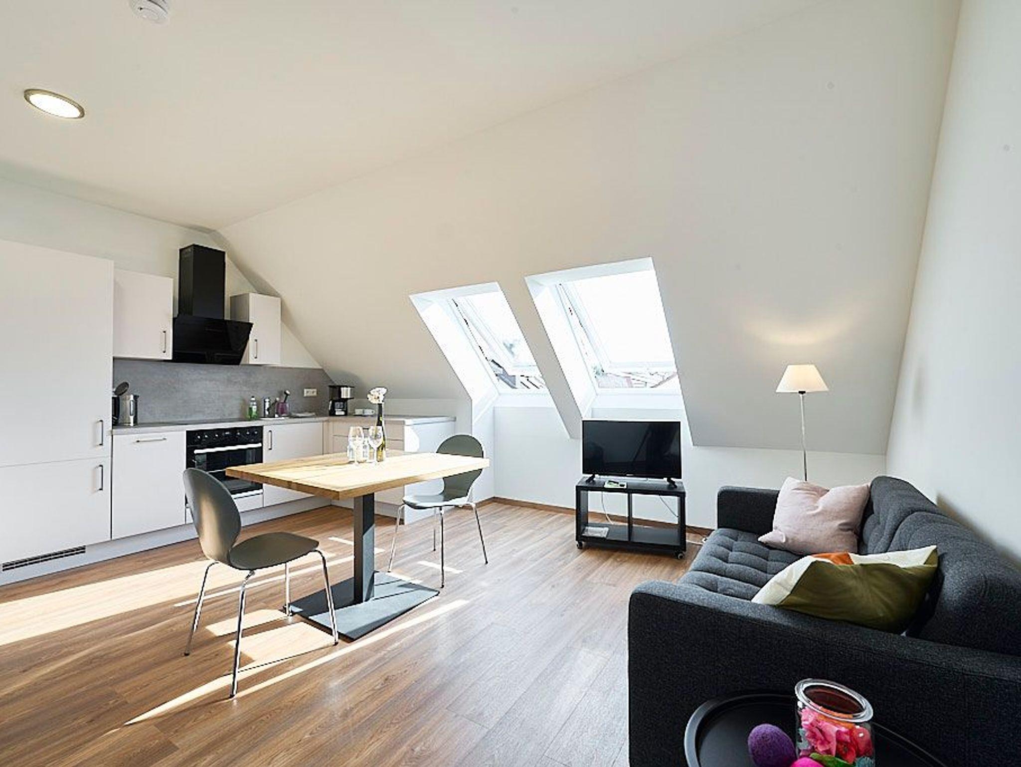 Wohnzimmer mit Couch und separatem Schlafsofa, Schlafzimmer mit Doppelbett und Kleiderschrank, Badzimmer mit Dusche, voll ausgestattete Küche (Spülmaschine, Wasserkocher, Kaffeemaschine, Kühlschrank uvm., Essbereich mit Tisch und 2 Stühlen)