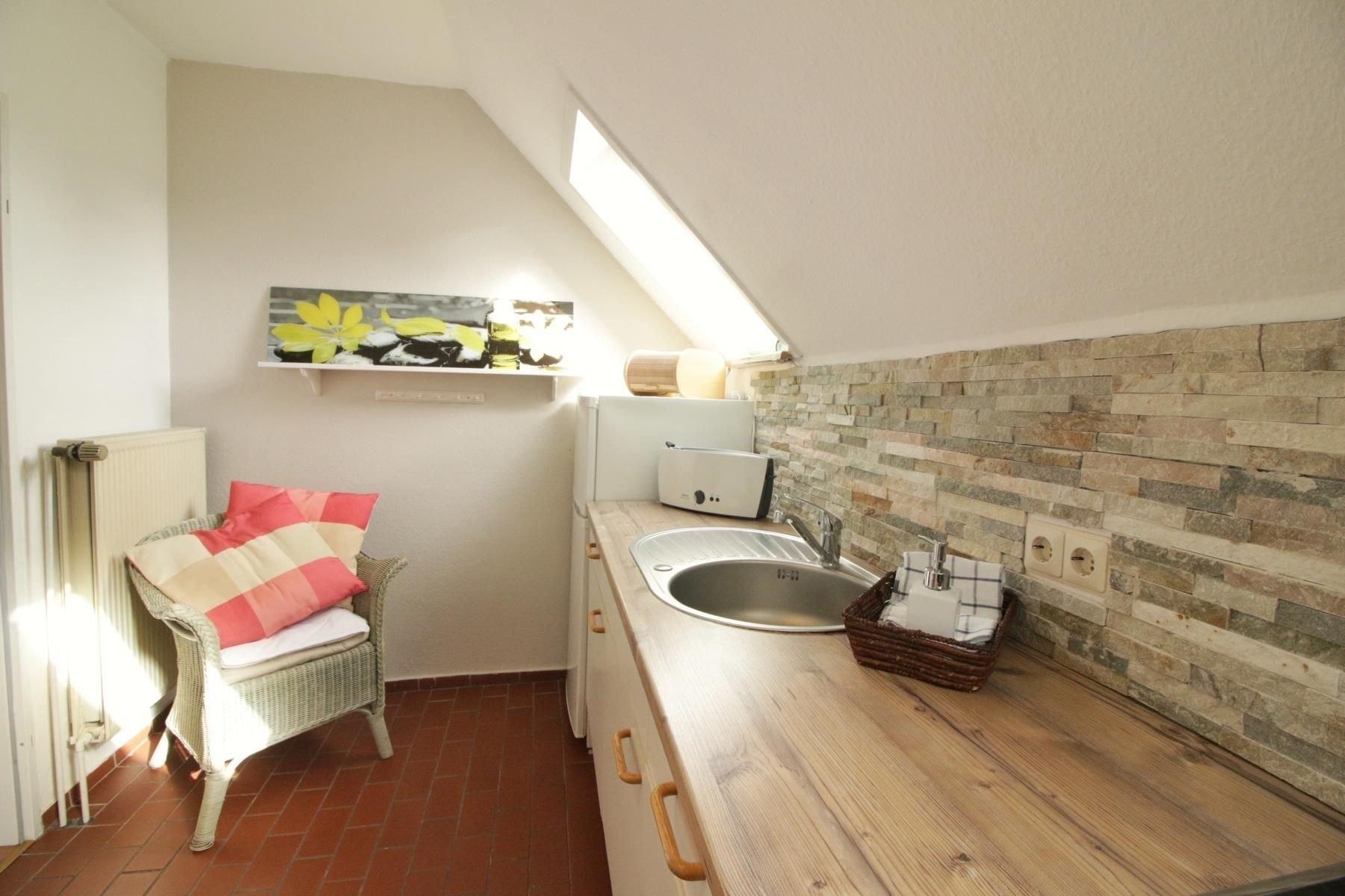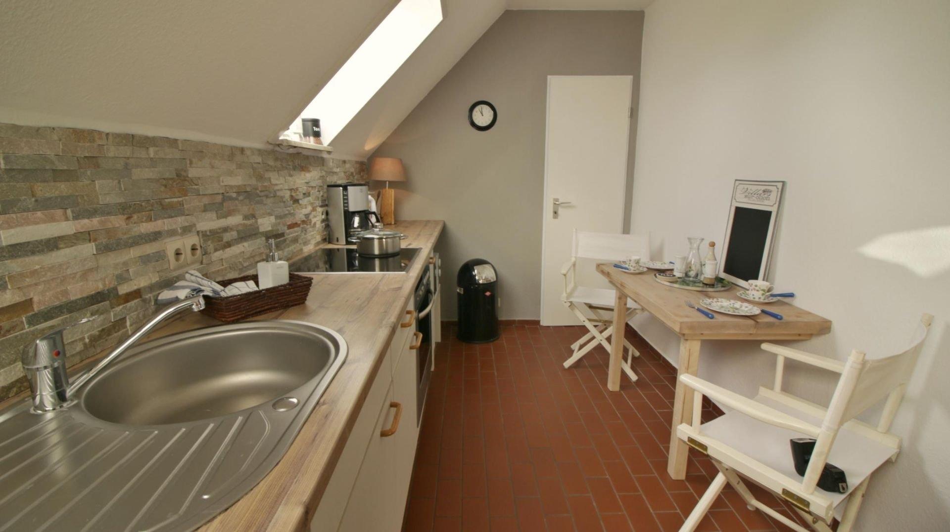 Unsere Ferienwohnung 47 befindet sich der 1. Etage. Sie bietet Übernachtungsmöglichkeiten für zwei Personen in ruhiger Lage von Horumersiel. Gemütlich eingerichtet und mit Liebevollen Details wurde diese Wohnung neu Ausgestattet. Vom Flur aus, in dem ein Einbauschrank ausreichend Platz für Ihre Kleidung bietet, kommt man zum einen in den Wohn-Schlafraum, welcher durch eine Fachwerknachbildung Optisch voneinander getrennt ist. Fernseher, Musikanlage stehen zur Nutzung für Sie bereit.Aus dem Flur gelangt man ebenfalls in die Küche. Diese ist Ausgestattet mit einer Kühl-Gefrierkombination, Backofen, Ceranfeld, Mikrowelle und vielen weiteren Küchenutensilien und bietet Sitzmöglichkeiten für zwei Personen. An die Küche grenzt ein kleiner Abstellraum. Das Badezimmer mit einem Waschbecken, Spiegel, Ablage und einer ebenerdige Dusche ausgestattet.