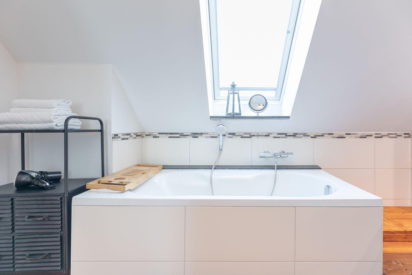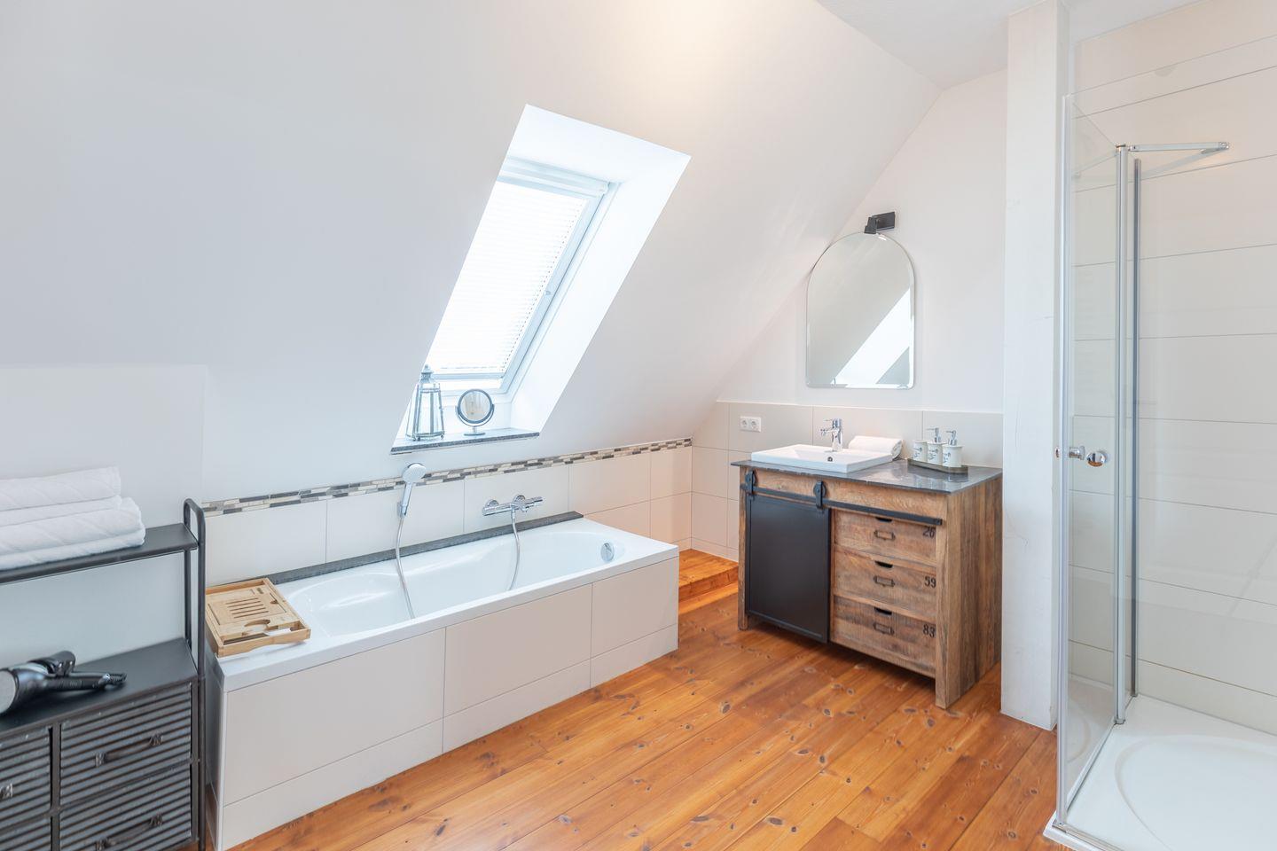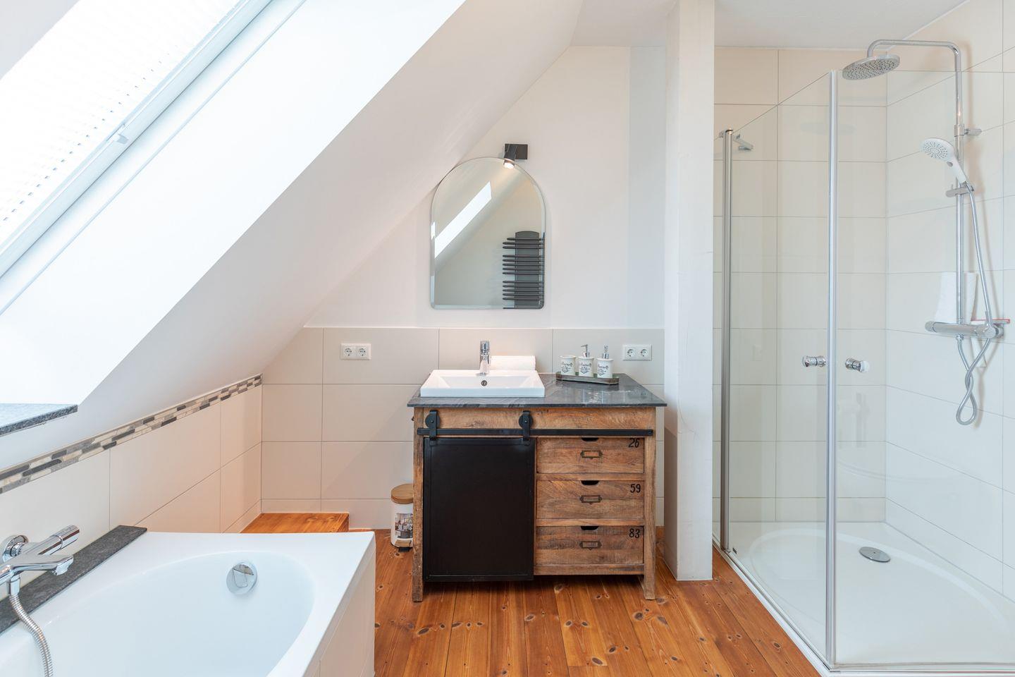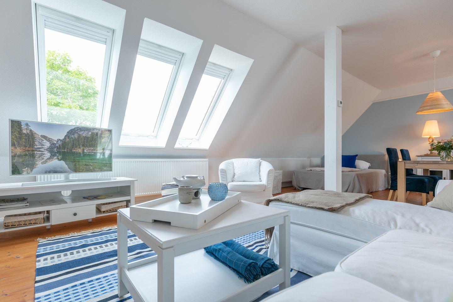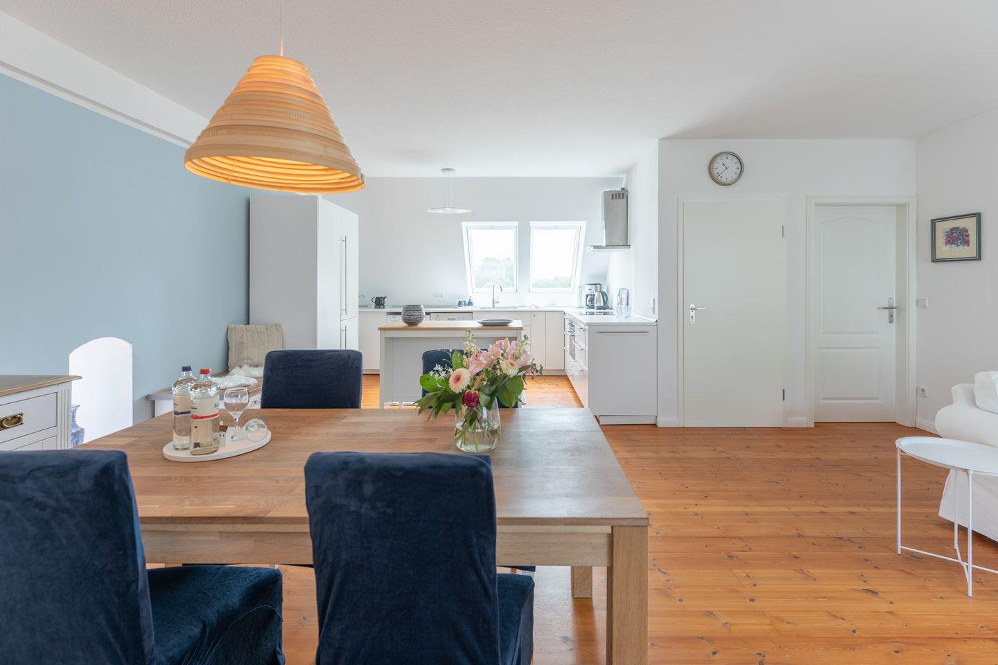 Die 2-Zimmerwohnung erstreckt sich über 2 Etagen. Im 1. Obergeschoss (über eine Treppe erreichbar) erwartet Sie ein großzügiger Wohnraum mit Sofaecke und Smart-TV, Esstisch und Einzelbett für die 3. Person. Die offene Küche mit Backofen, 4-Plattenherd, Geschirrspüler, Toaster, Kaffeemaschine (Filtergröße 4), Wasserkocher uvm. eignet sich hervorragend für Selbstversorger. Das Badezimmer bietet Ihnen eine Badewanne für gemütliche Stunden und zusätzlich auch eine Dusche.