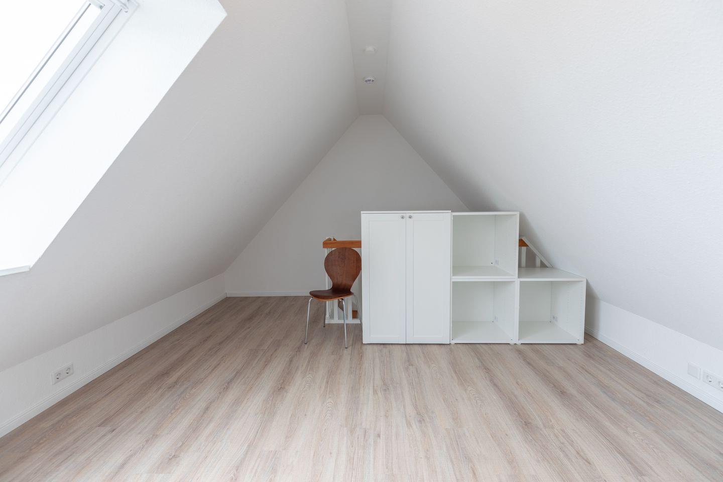 Über eine weitere Treppe erreichen Sie die Mansarde mit einem Doppelbett (180 x 200). Die Schlafzimmerfenster sind mit hitzeabweisenden Verdunkelungsrollos versehen.