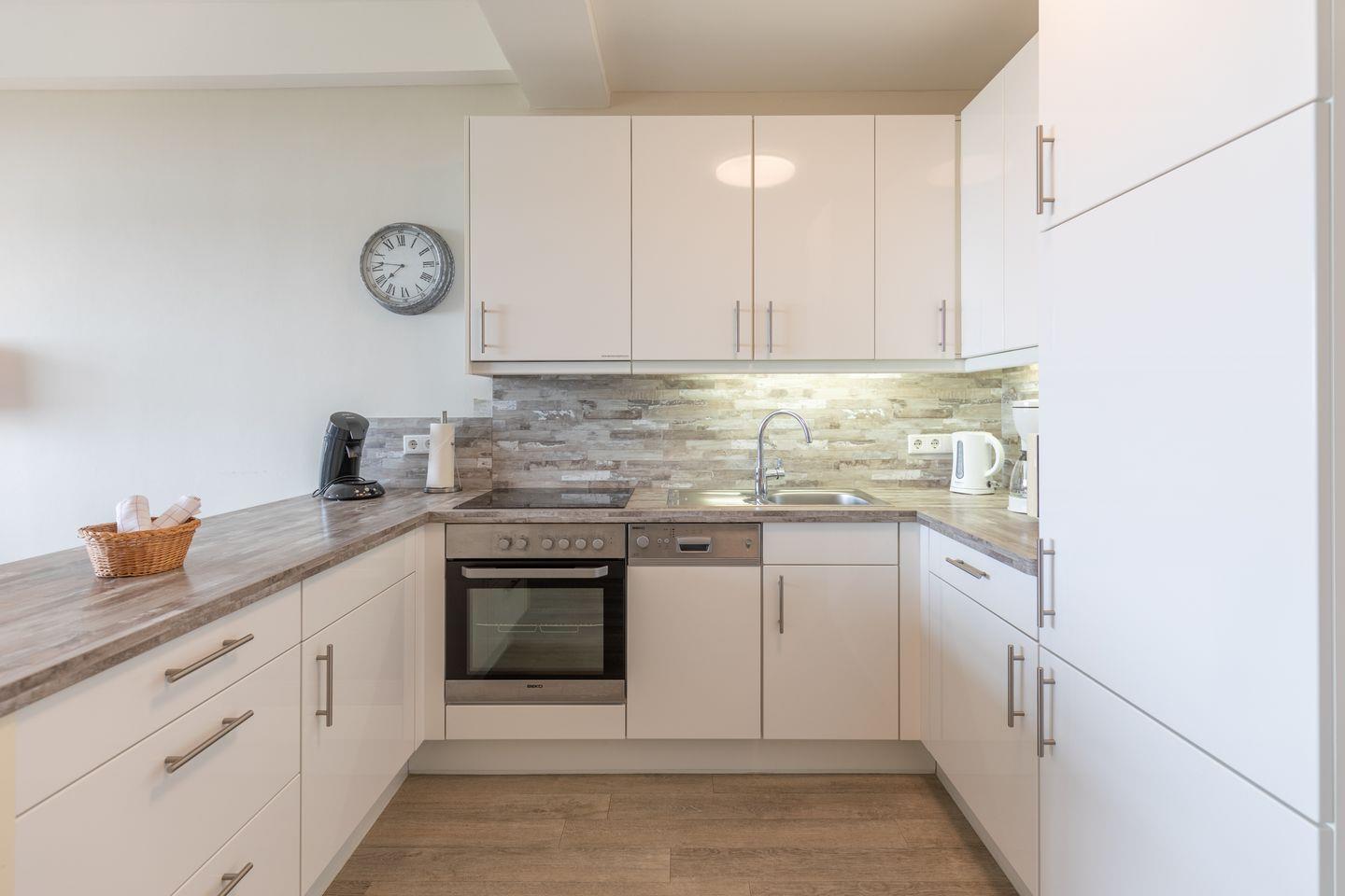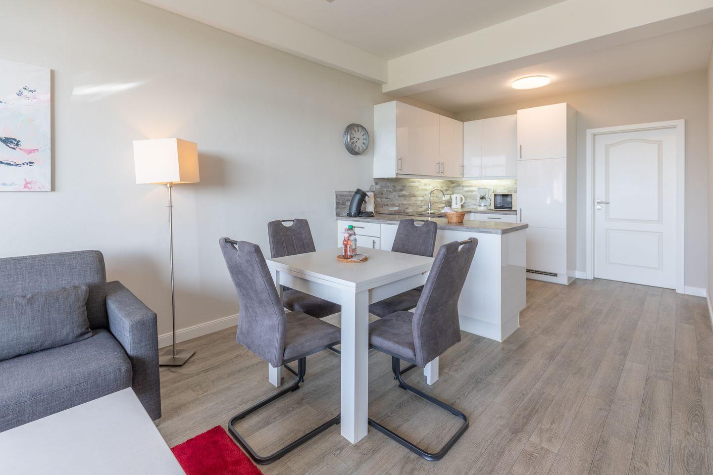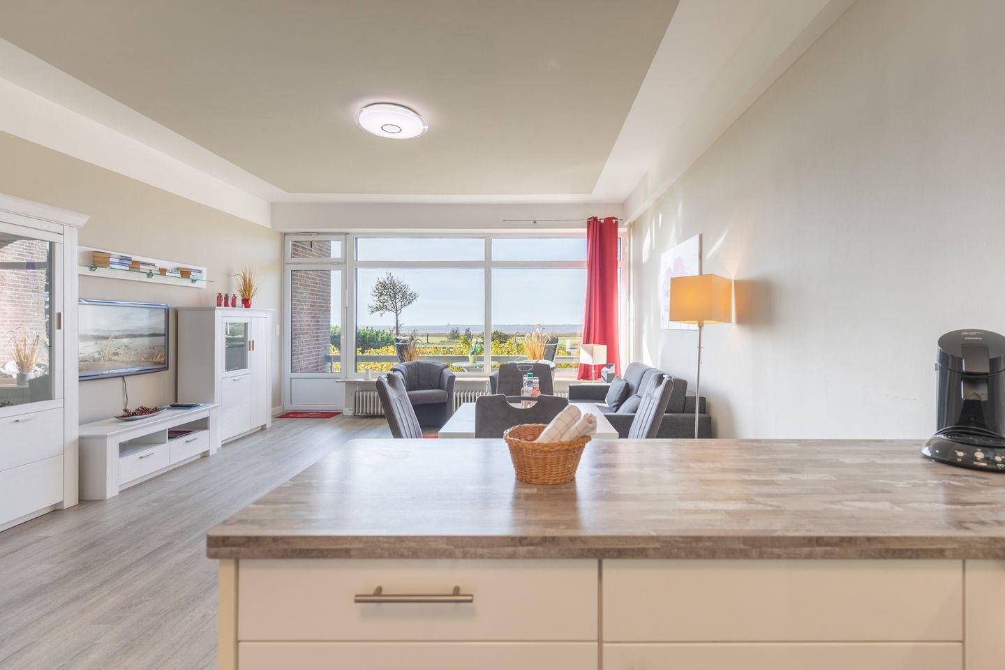 Die 2-Zimmerwohnung liegt im Erdgeschoss und ist über ein paar Stufen zu erreichen. Die Wohnung verfügt über ein Schlafzimmer mit einem Doppelbett (180 x 200), einem Wohnzimmer mit TV und einem Schlafsofa und eine offene, moderne, hochwertig ausgestattete Küche mit Backofen, Ceranfeld, Geschirrspüler, Mikrowelle, Toaster, Kaffeemaschine (Filtergröße 4), Wasserkocher uvm. Setzen Sie sich einfach an den Esstisch oder aber auf den Balkon und genießen Sie den Ausblick auf die Nordsee … carpe diem!