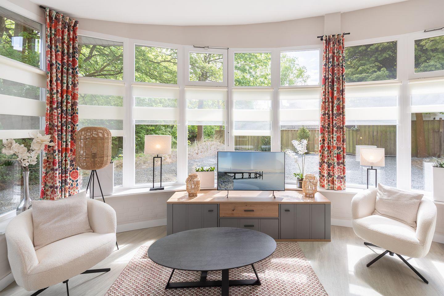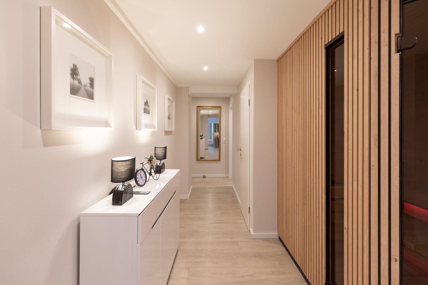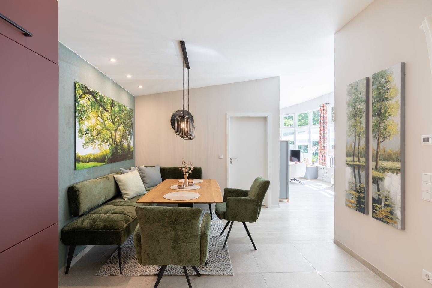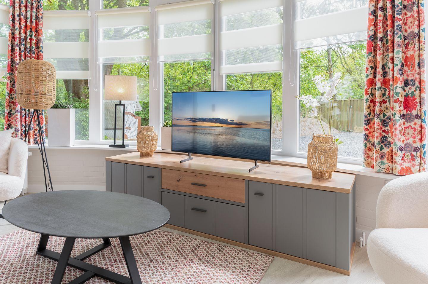 Der helle Wohnbereich lädt mit einer gemütlichen Sofaecke und einem Smart-TV zu entspannten Abenden ein. Für längere Aufenthalte oder zusätzlichen Komfort steht Ihnen im separaten Hauswirtschaftsraum eine eigene Waschmaschine sowie ein Trockner zur Verfügung.