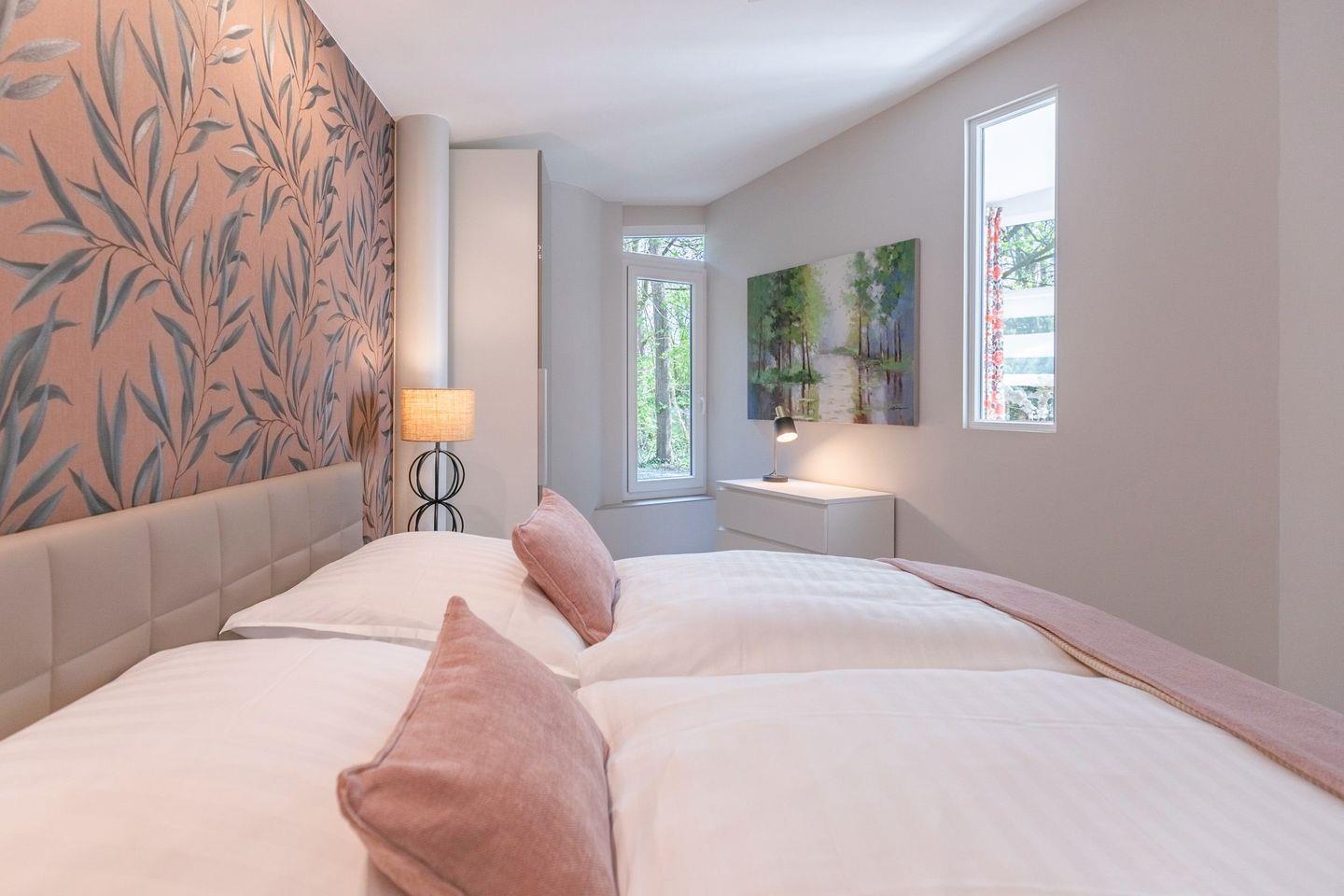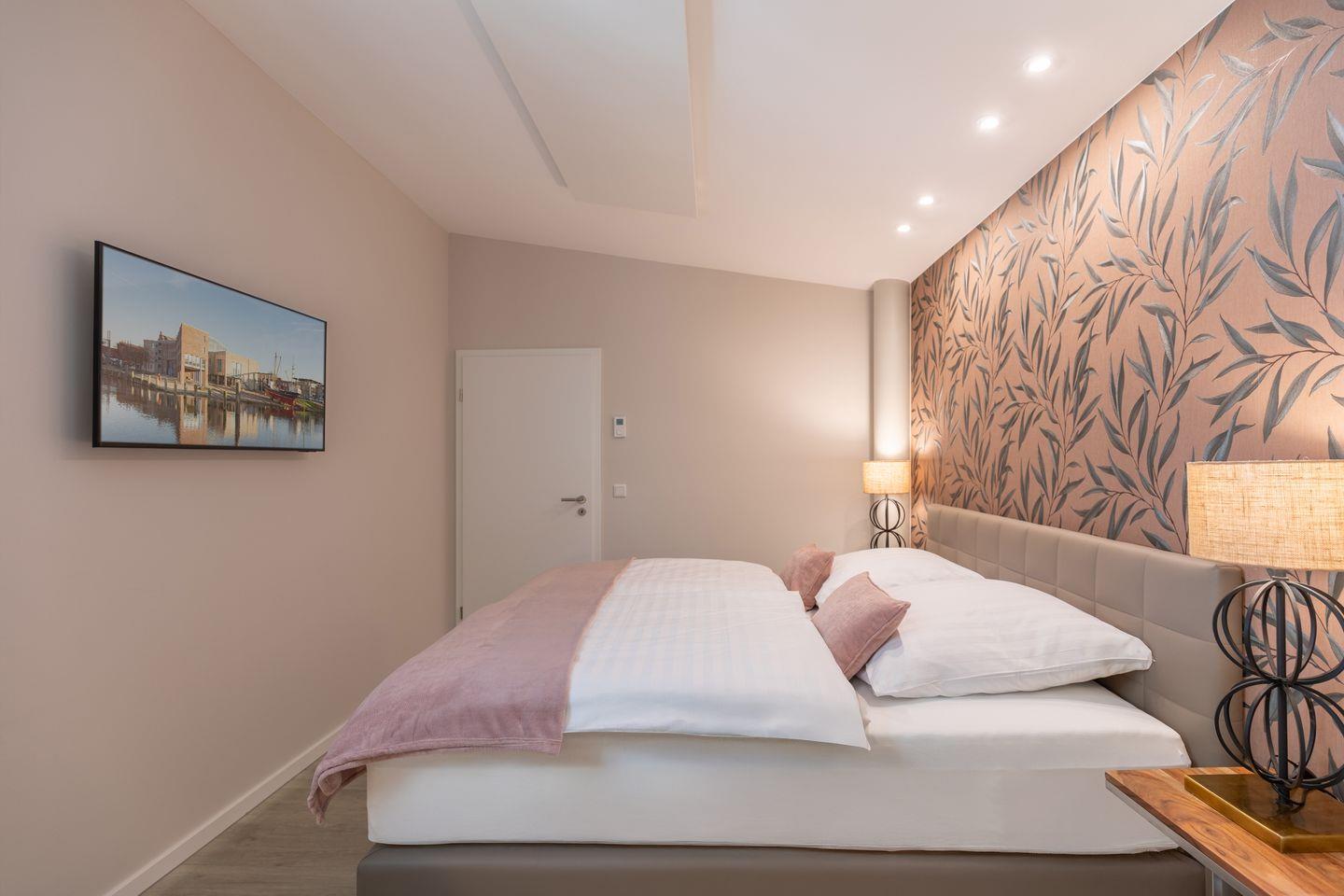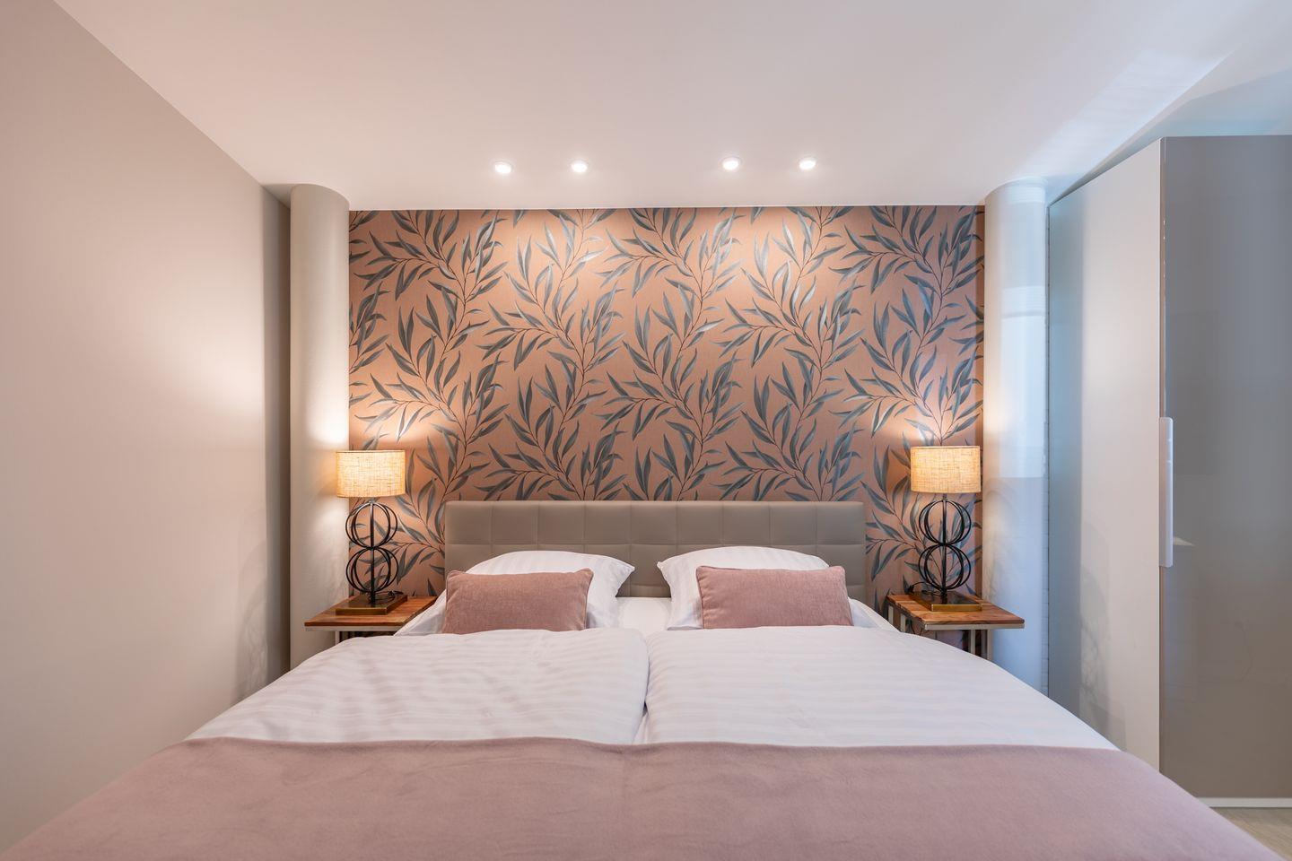 Der Stadtpavillon verfügt über zwei stilvoll eingerichtete Schlafzimmer – beide ausgestattet mit einem komfortablen Boxspringbett (180 × 200 cm) und einem Kleiderschrank. In einem der Schlafzimmer steht Ihnen zusätzlich ein weiterer Fernseher zur Verfügung