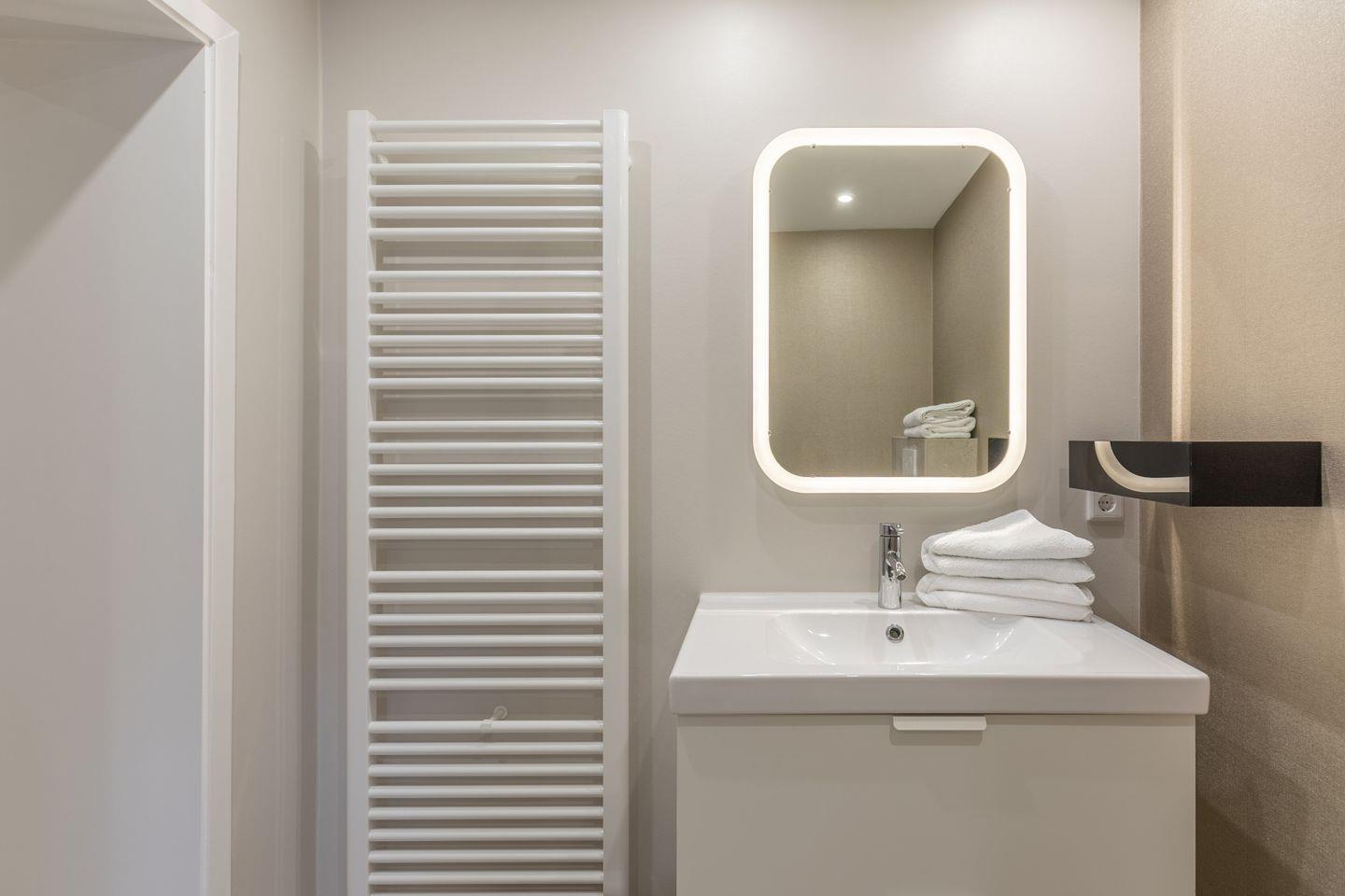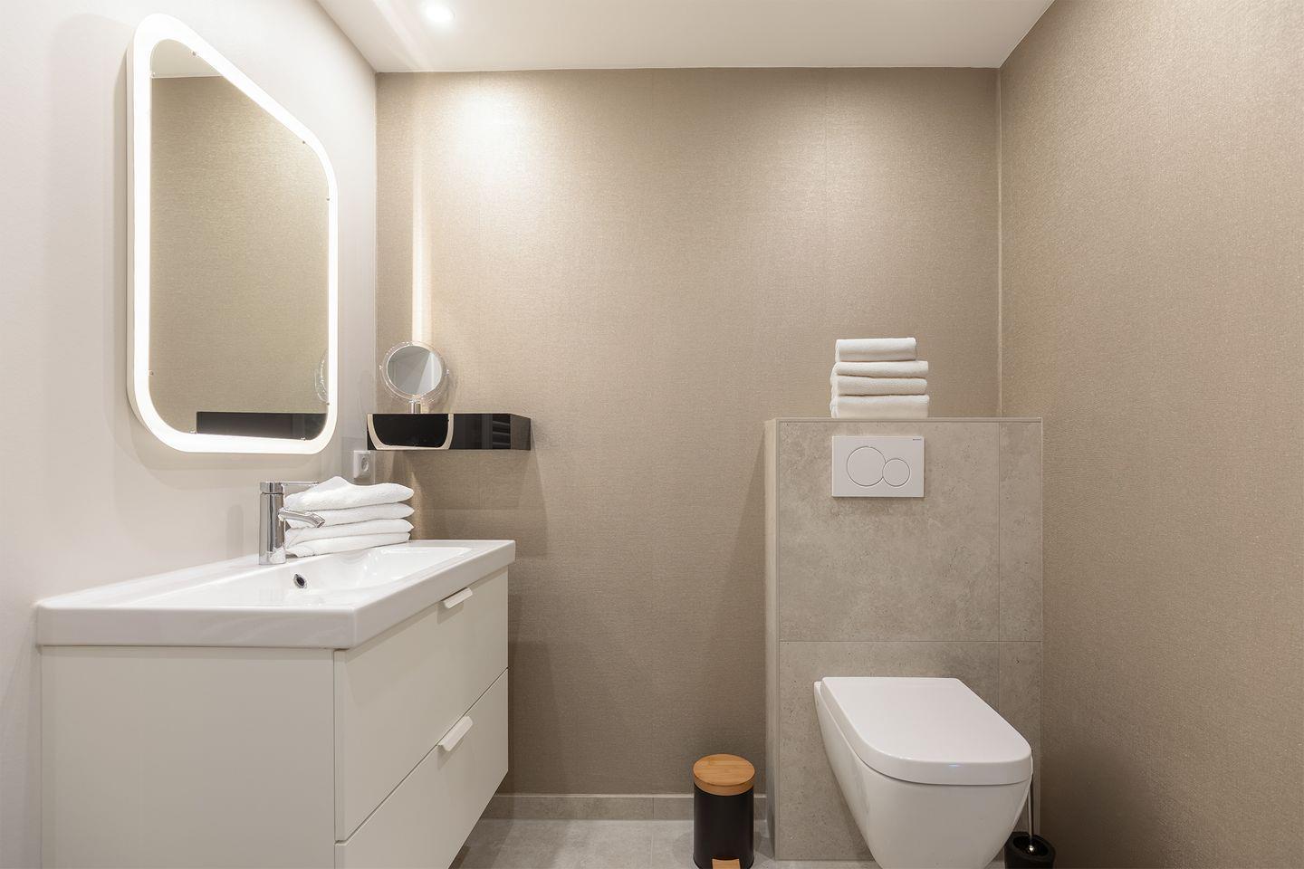 Das geschmackvoll gestaltete Badezimmer mit Dusche, Waschbecken, WC und Haartrockner rundet das Angebot harmonisch ab.