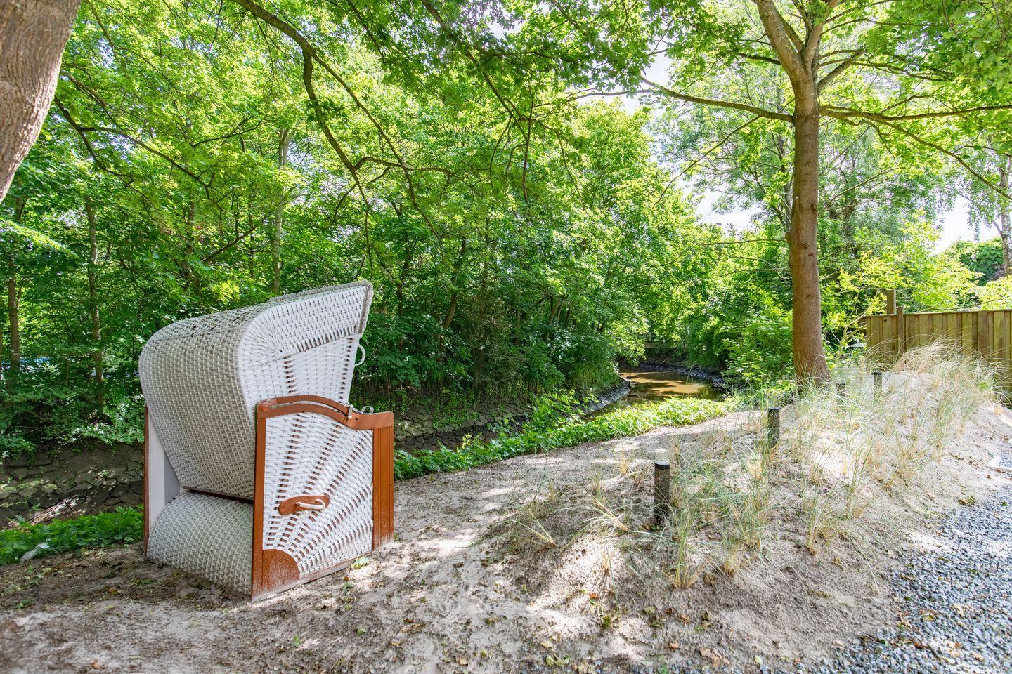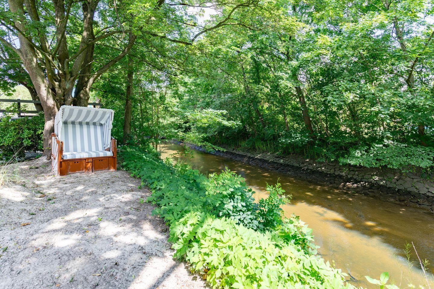 Genießen Sie entspannte Stunden direkt an der Mühlenau: Lehnen Sie sich im Strandkorb zurück und lassen Sie sich an diesem idyllischen Plätzchen bei Kaffee und Kuchen verwöhnen.