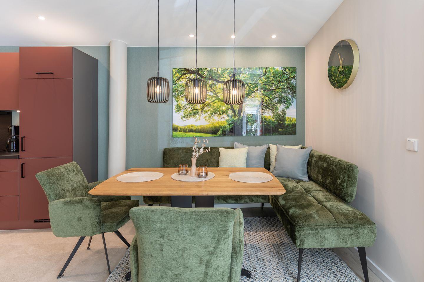 Die moderne, offen gestaltete Küche mit angrenzendem Essbereich ist bestens ausgestattet und bietet alles, was Sie für einen komfortablen Aufenthalt benötigen: ein Induktionskochfeld, Wasserkocher, Backofen, Spülmaschine, Kühlschrank mit Gefrierfach sowie eine Kaffeemaschine stehen bereit.