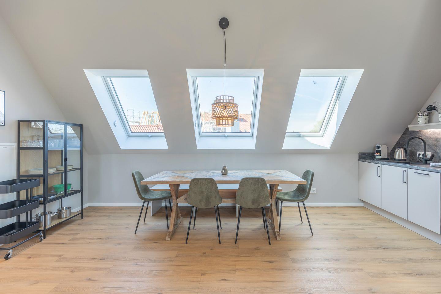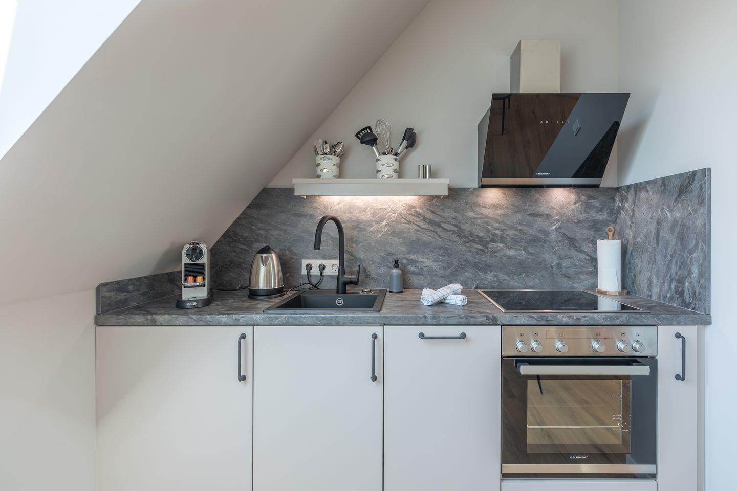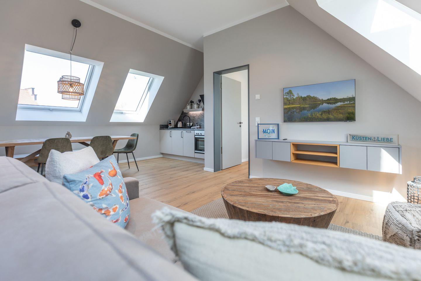 Direkt angeschlossen befindet sich die offene Küche mit Essbereich, Kühlschrank (mit Gefrierfach), Herd, Backofen, Spülmaschine (Tabs inklusive), Kaffeemaschine, Wasserkocher, Besteck, Geschirr plus Töpfe & Pfannen.