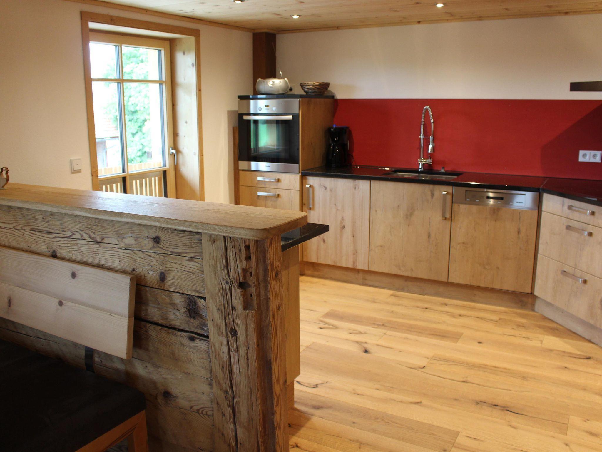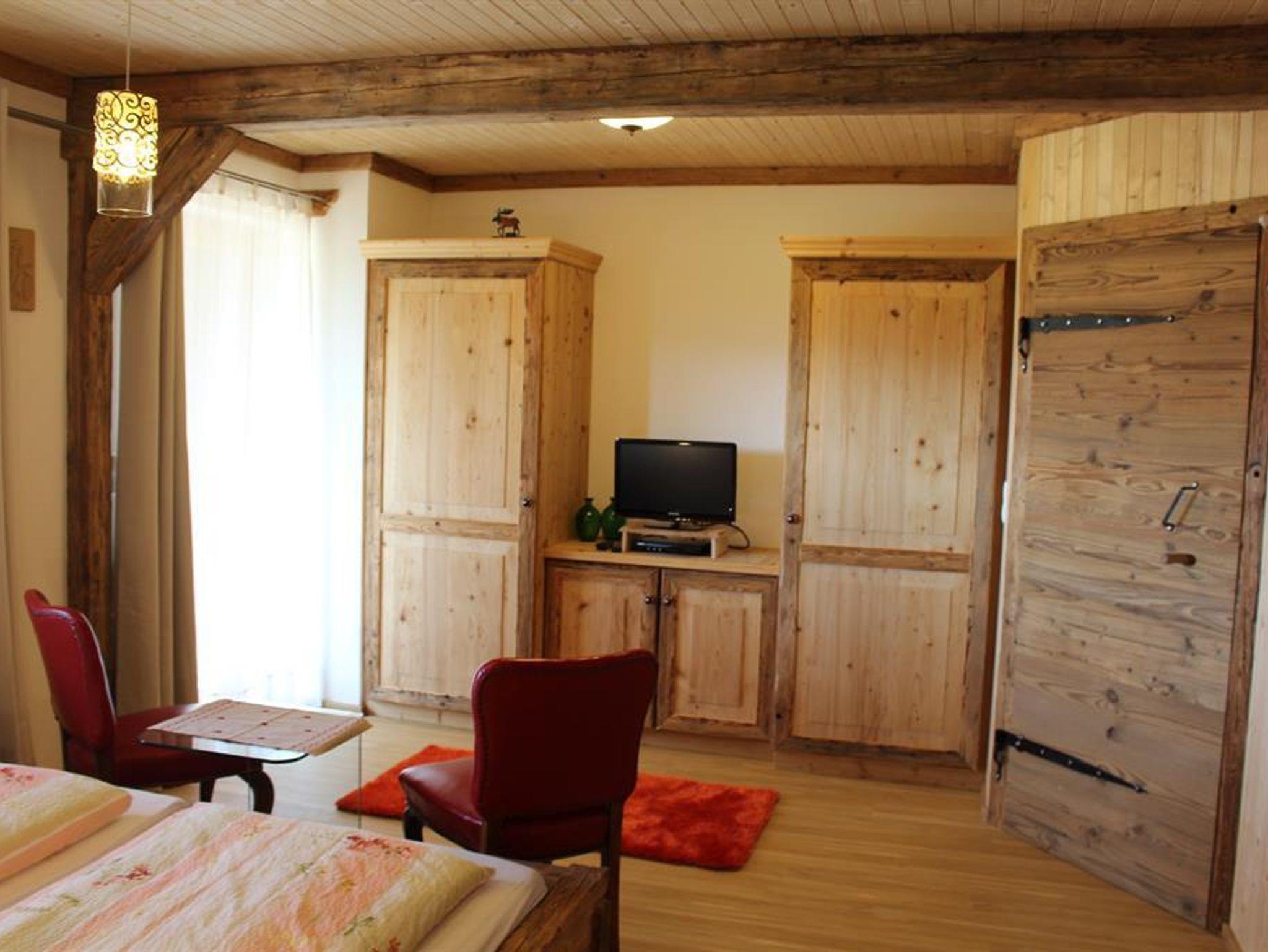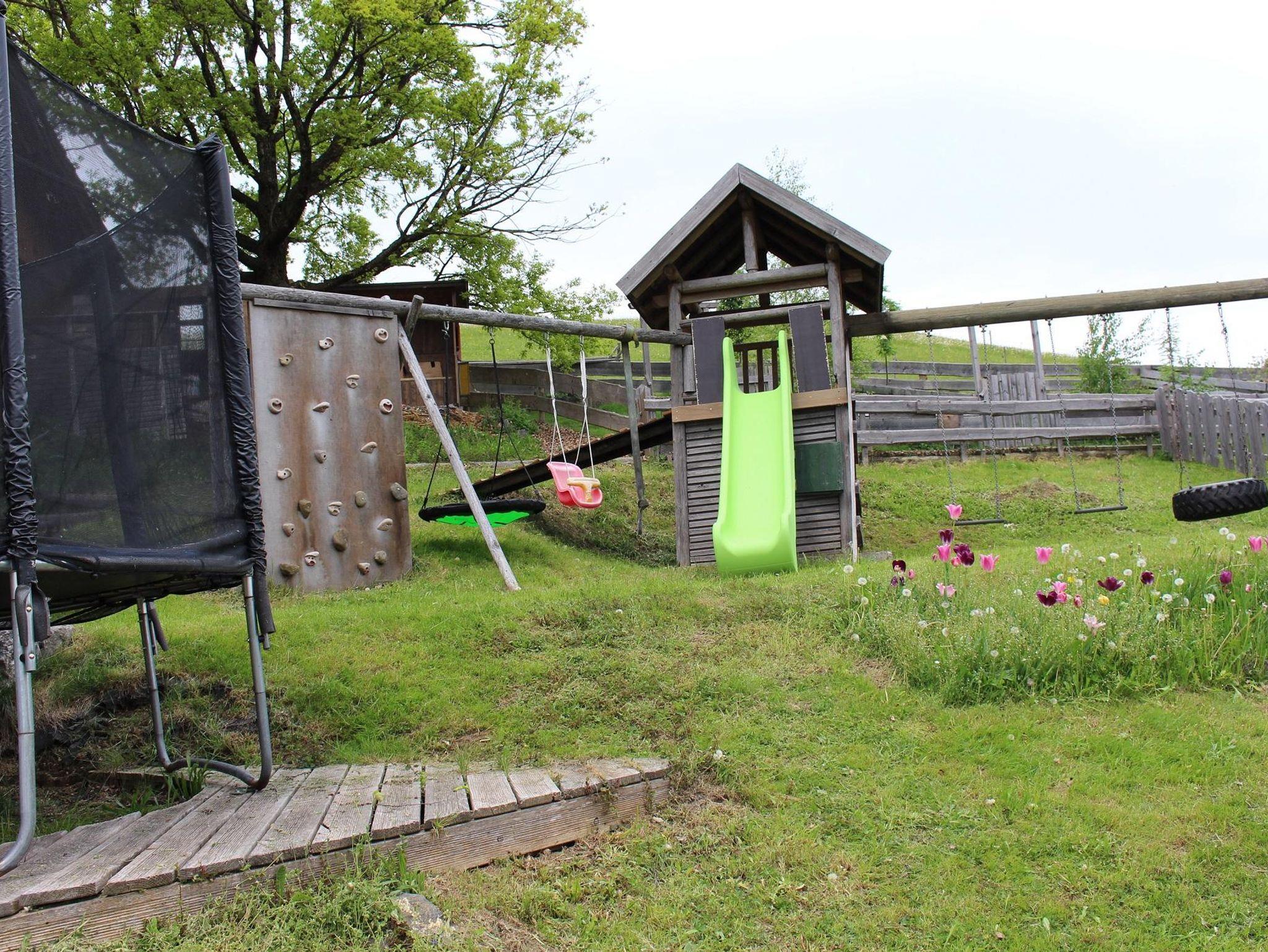 Sehr gemütliche Wohnung, mit 2 Schlafzimmern in Landhausstil und in Altholz. 2 Bäder jeweils mit WC und Dusche. Parkettböden, Holzdecken, Fussbodenheizung in einem Bad, großer Balkon, sep. Eingang für die Fewo´s, Fliegengitter, Toaster, Eierkocher, Kaffeemasch., Wasserkocher, Stand.gewürze, Kinderspiele, Kinderbücher, Kleinkinderfahrzeuge (Traktor, Bobbycar, Dreirad, usw.) vorhanden, Kikerkasten und Tischtennisplatte, große Spiellandschaft mit Sandkasten und Schaukel, 2 gr. Gokards Grillplatz, 2 Liegestühle auf dem Bakon, Wasch.-u. Spülmasch. vorhanden viele Tiere (Katzen, Ochsen,Hasen, Hühner, Schafe, Ziegen, Esel, Enten) herrliche Berg-Panorama-Sicht, Wandermöglichkeit von der Ferienwohnung aus, 10 min Autofahrt zu zwei Seen. 20 min Autofahrt zum nächsten Skilift und Langlaufloipe, Rauchen nur auf Balkon.