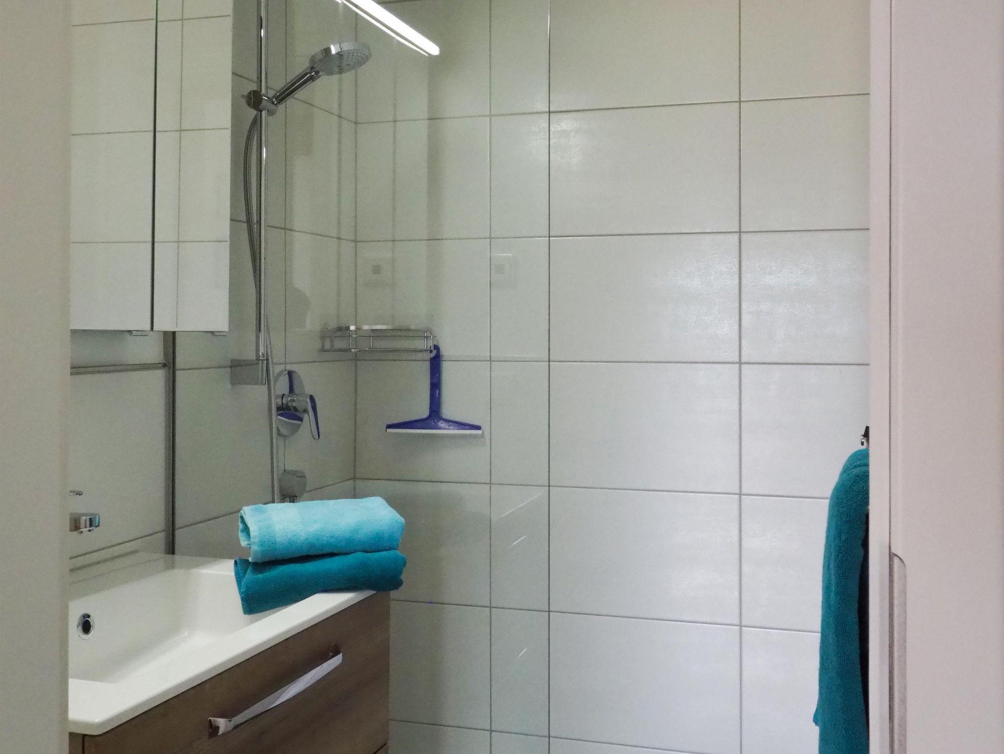 Das Badezimmer ist mit einer begehbaren Dusche und einem Einbauwaschbecken mit Spiegelschrank ausgestattet.
