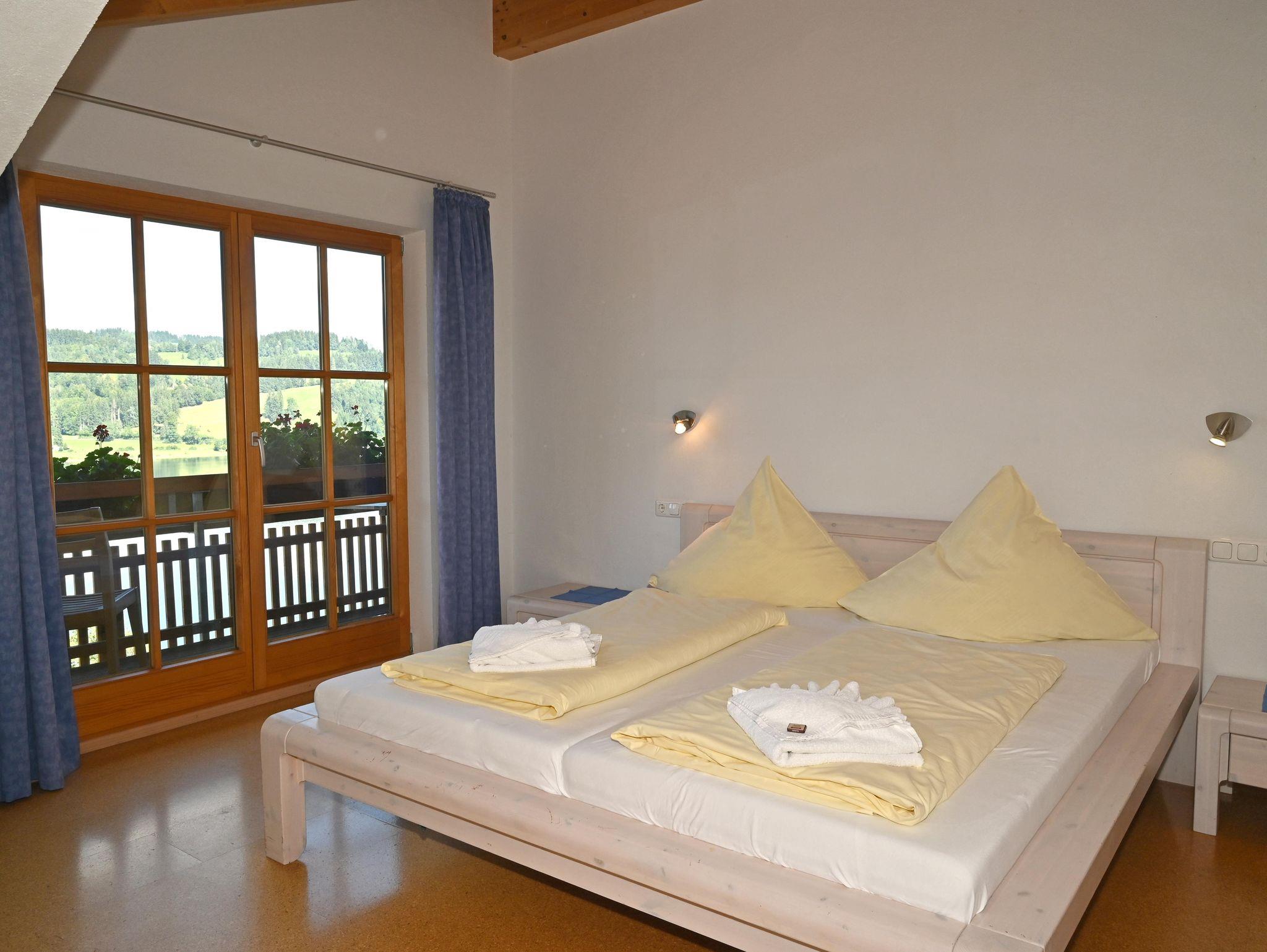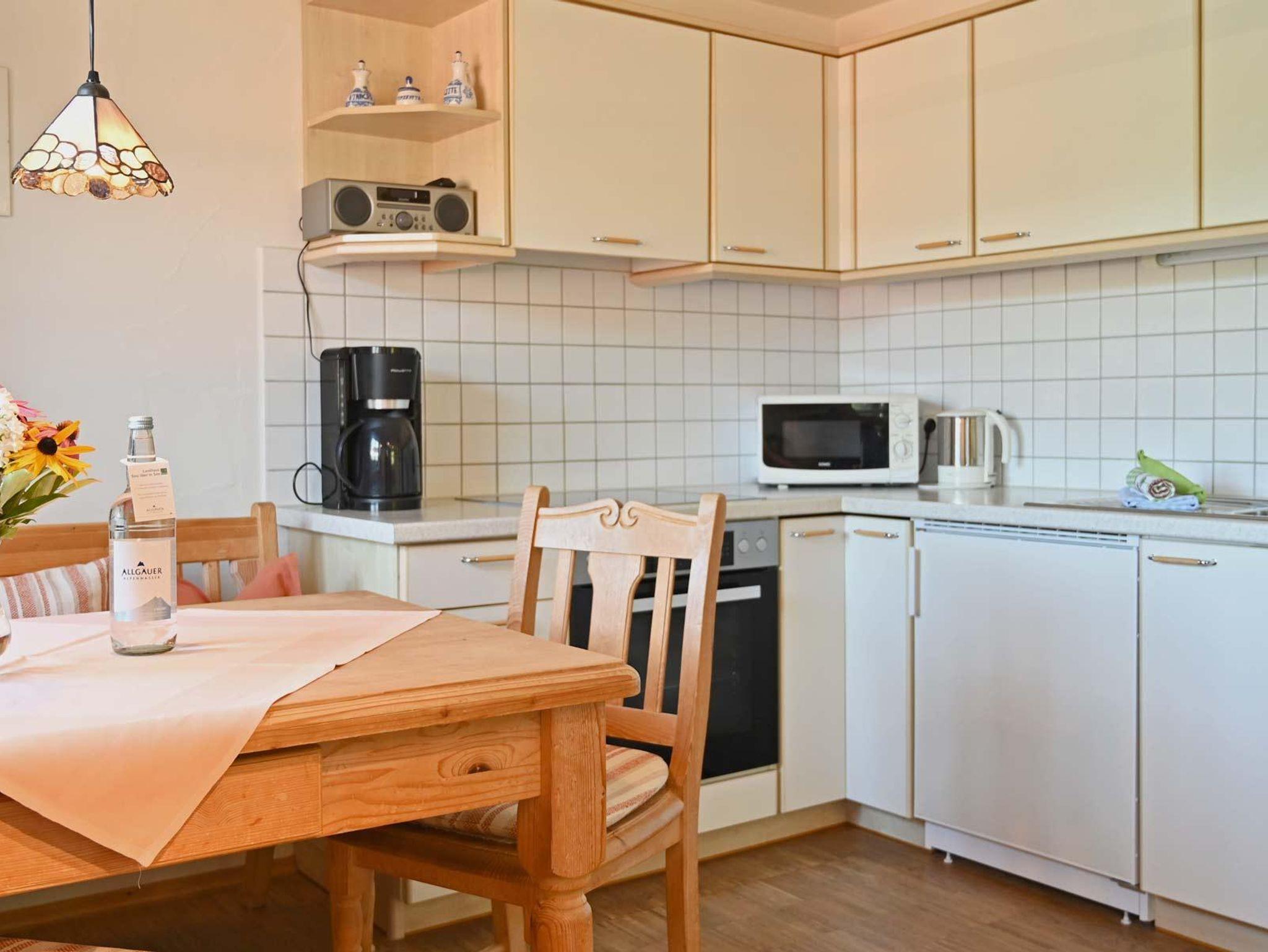Diese neu renovierte Wohnung im Erdgeschoß des Altbaus begeistert durch die große Terrasse mit Panoramablick über den Großen Alpsee. Zwei Schlafzimmer und zwei Badezimmer stehen zur Verfügung. Flachbild HD-Fernseher mit Sat-Empfang, kostenfreies WLAN, Betten sind bezogen, Hand- Dusch- Geschirrtücher sind vorhanden und können nach Bedarf gewechselt werden. Die Wohnung hat 4-Sterne-Komfort und eine Traumaussicht, jedoch eine etwas niedrige Deckenhöhe weil altes Bauernhaus, daher leider nur für Leute bis 1,90 m Körpergröße geeignet. Direkter Zugang zu Liegewiese und überdachtem Stellplatz.