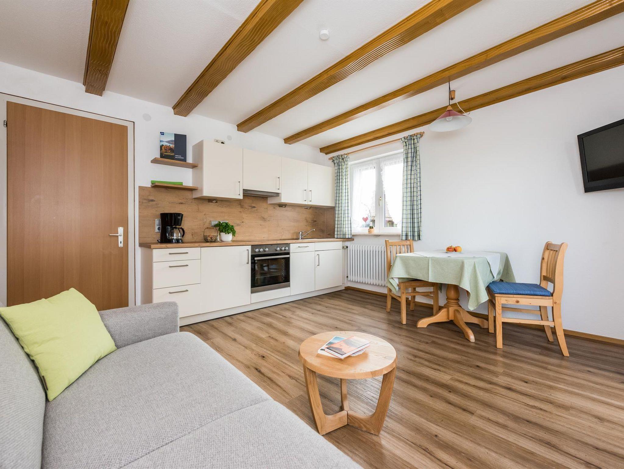 Die Ferienwohnung Grüntenblick besteht aus einem Schlafzimmer, Küche mit Spülmaschine und Backofen, Wohnzimmer mit TV, Du/Wc und einen Balkon Richtung Osten. Vom Balkon genießen Sie den freien Blick auf den Wächter des Allgäus, den Grünten.