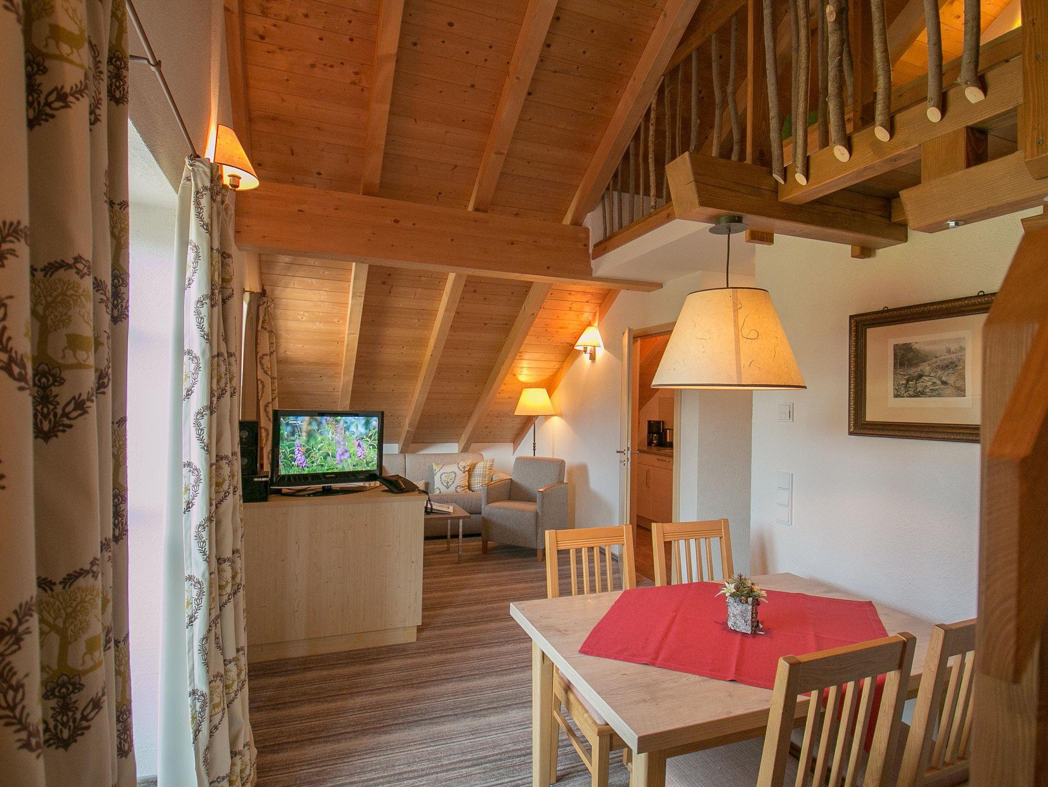 Die Jagd gehört in unseren Fluren seit jeher zur Pflege der Wälder. Die Wohnung im Dachgeschoss verfügt über einenHochstand, der als gemütliche Kuschelecke das besondere Ambiente unterstreicht. Im geräumigen Wohn-Esszimmer finden Sie Platz am gemütlichen Esstisch und zum Entspannen auf dem Sofa. Zusätzliche Schlafmöglichkeit auf Anfrage. Auf dem Westbalkon lässt sich die Nachmittags- und Abendsonne genießen.