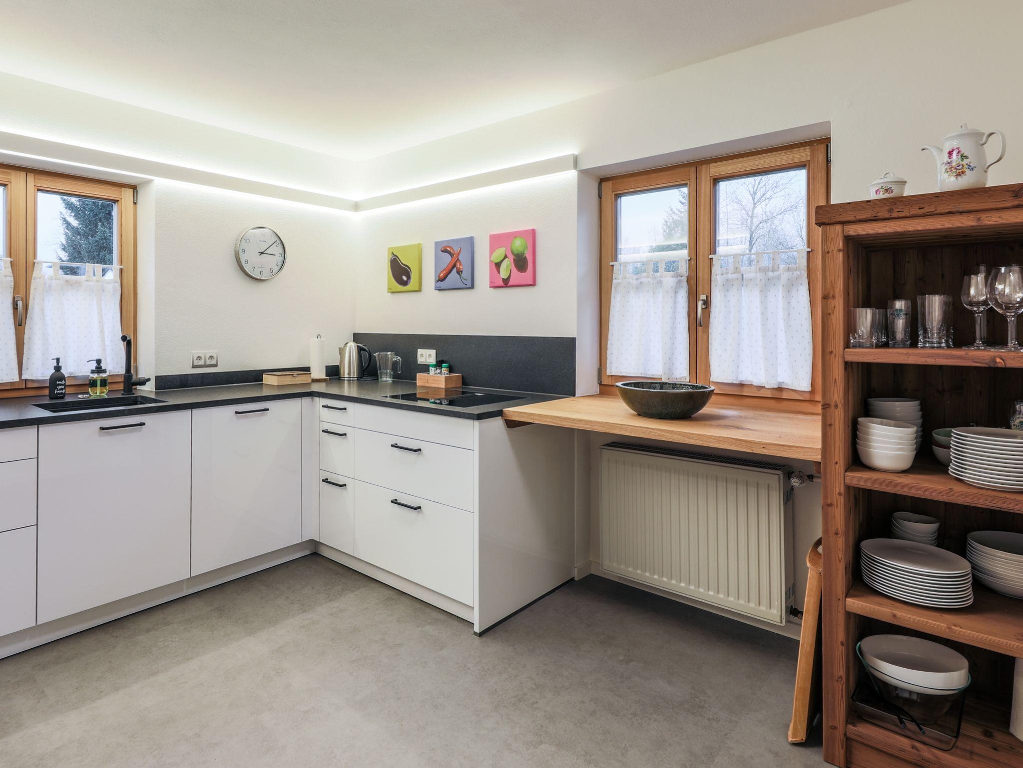 Im Dachgeschoss befinden sich 2 DZ (20m² und 15m²), das 4-Bett Kinderzimmer (18m²), ein Bad und eine extra Toilette.Ein weiteres DZ mit Bad (21m²) ist im Erdgeschoss. Dazu Küche, Wohnzimmer, Stüberl mit beheizbarem Kachelofen (Holz vorhanden), Bibliothek/Arbeitszimmer, extra Garderobe.Die Küche enthält• Geschirrspüler • Kühlschrank mit Gefrierfach • Induktionsherd mit 4 Platten, große Auswahl an Töpfen und Pfannen. • ein Backofen• Konventionelle Filterkaffeemaschine, Nespresso Kapselmaschine, Espressokanne • Toaster • Geschirr und Besteck für 10 Personen • sonstiges: von Standardgewürzen bis Kaffeefilter und Müllbeutel sollten Sie alles vorfinden, was Sie brauchen. Auch an Spülmittel brauchen Sie nicht zu denken. Im Keller können Sauna, Ruheraum und Spielzimmer genutzt werden. Des weiteren steht eine Waschküche und ein Trockenraum zur Verfügung.Insgesamt ca. 210m² Wohn- und Nutzflättwäsche und Dusch/Handtücher werden gestellt. (Bitte ggf. Bademantel und Saunatuch selbst mitbringen) In den 2 Bädern sind je ein Haartrockner vorhanden.Waschmaschine und Trockner in der Waschküche.WLAN, Drucker, TV, Musikanlage, PS4, Profi Kicker, Darts, Brettspiele, Bücher aus der Bibliothek, Klavier, Kinderbett stehen zur Verfügung.Terrasse und Garten:Auf der teils überdachten Terrasse lässt es sich auf den Lounge Möbeln gut aushalten (kleine Untertreibung), oder auf den Sonnenliegen in der Wiese, bzw. unter dem 40 jährigen Apfelbaum einfach nur die Umgebung genießen.Ein Grill, der große Holztisch mit Bänken und das leckere BBQ kann beginnen. An der Garage befindet sich eine Wallbox zum Laden von E-KFZ.Die Garage selbst ist relativ schmal (da Baujahr 1977) und ist idealerweise als Rad und Skidepot zu nutzen.