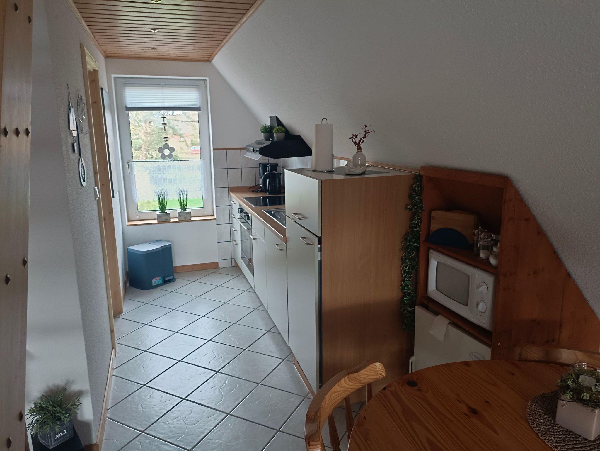 Die geräumige Oberwohnung bietet ein Schlafzimmer mit Doppelbett für zwei Personen sowie eine Koje im Wohn-/Essbereich für eine Person. Im großen Wohn-/Essbereich finden Sie ein großes Ecksofa, ein Essbereich und eine kleine Küchenzeile. Das helle Badezimmer ist mit einer Dusche und WC ausgestattet. Die Oberwohnung erreichen Sie über eine Treppe mit separaten Eingang. Bis zu zwei Hunde/Haustiere sind erlaubt. Nichtraucherwohnung.