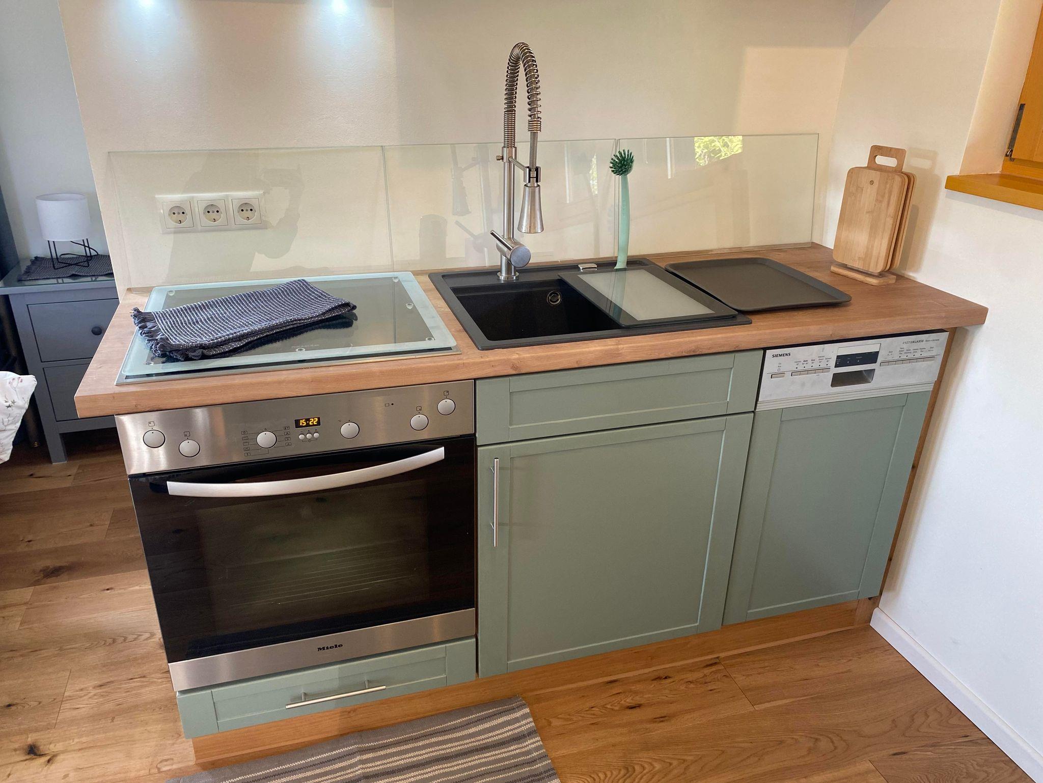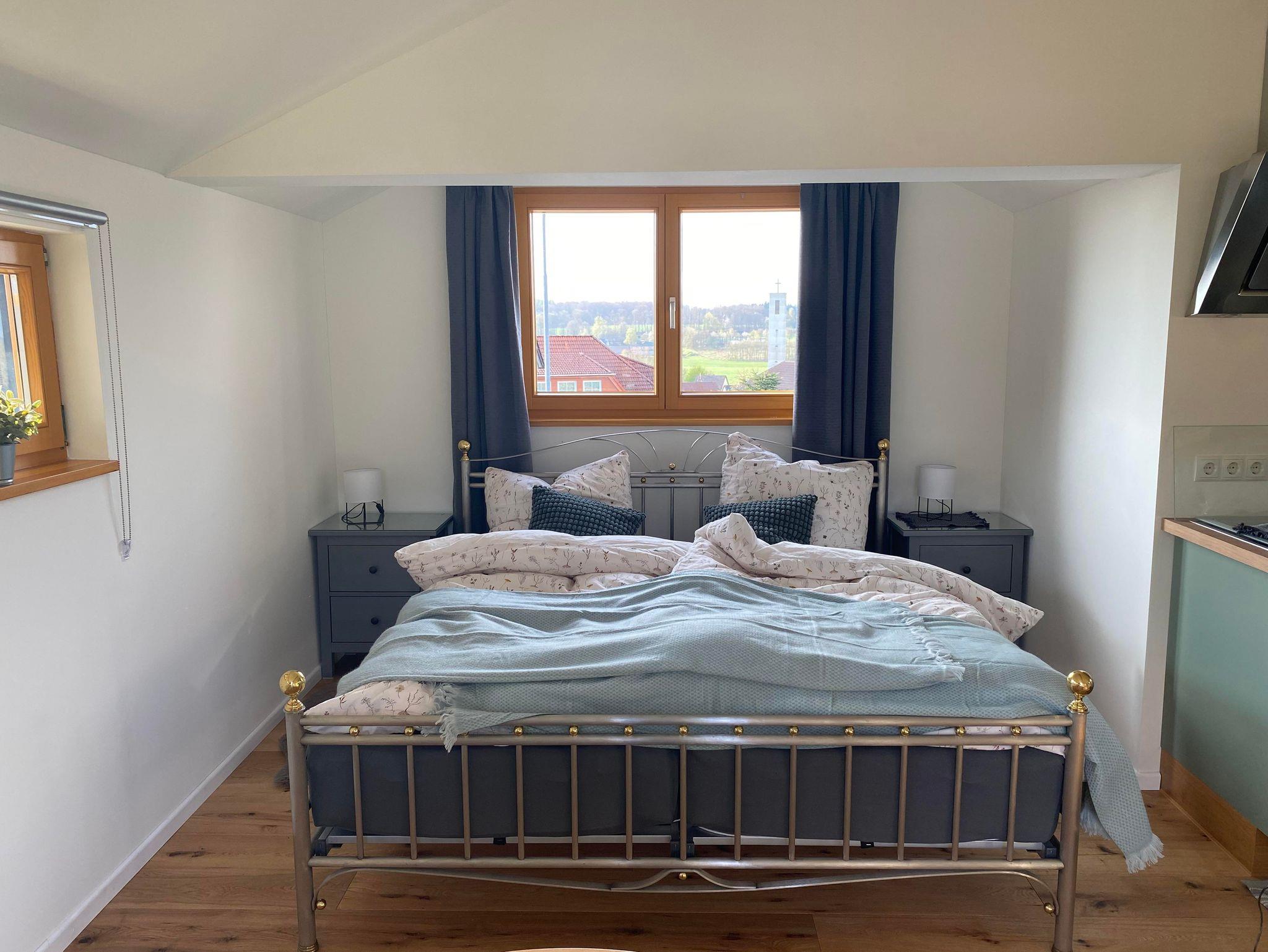Im oberen Geschoss erwartet Sie ein helles Studio mit Holzfenstern in alle Himmelsrichtungen und mit Blick in den Ort und ins Grüne. An den Fenstern gibt es Verdunklungsrollos oder Vorhänge. Der Boden im Wohnbereich besteht aus Eicheparkett. Die Möbel sind farblich aufeinander abgestimmt. Die Küche ist mit Kochgeschirr, Porzellan und Gläsern ausgestattet. Vom Wohnbereich gelangt man dirkt in den Garten. Der Sanitärbereich ist über eine Eichenholztreppe vom Wohnbereich aus zu erreichen.