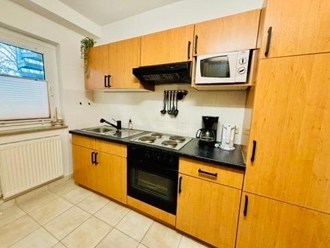 Voll ausgestattete Küche (Backofen, Herd, Kühlschrank, Toaster, Wasserkocher, Kaffeemaschine).