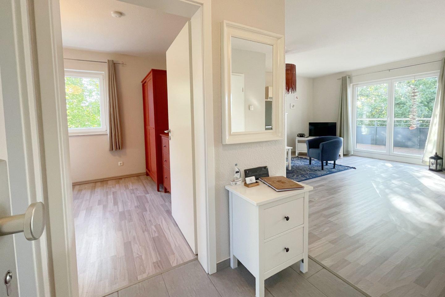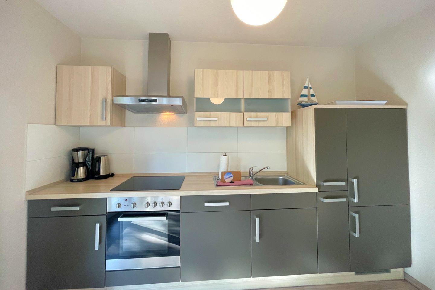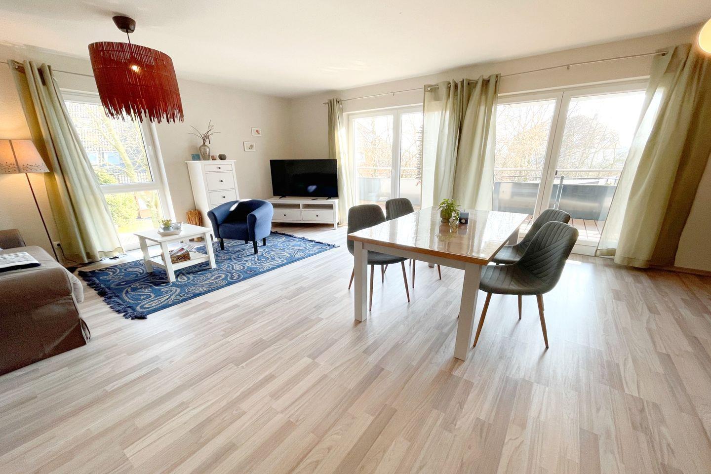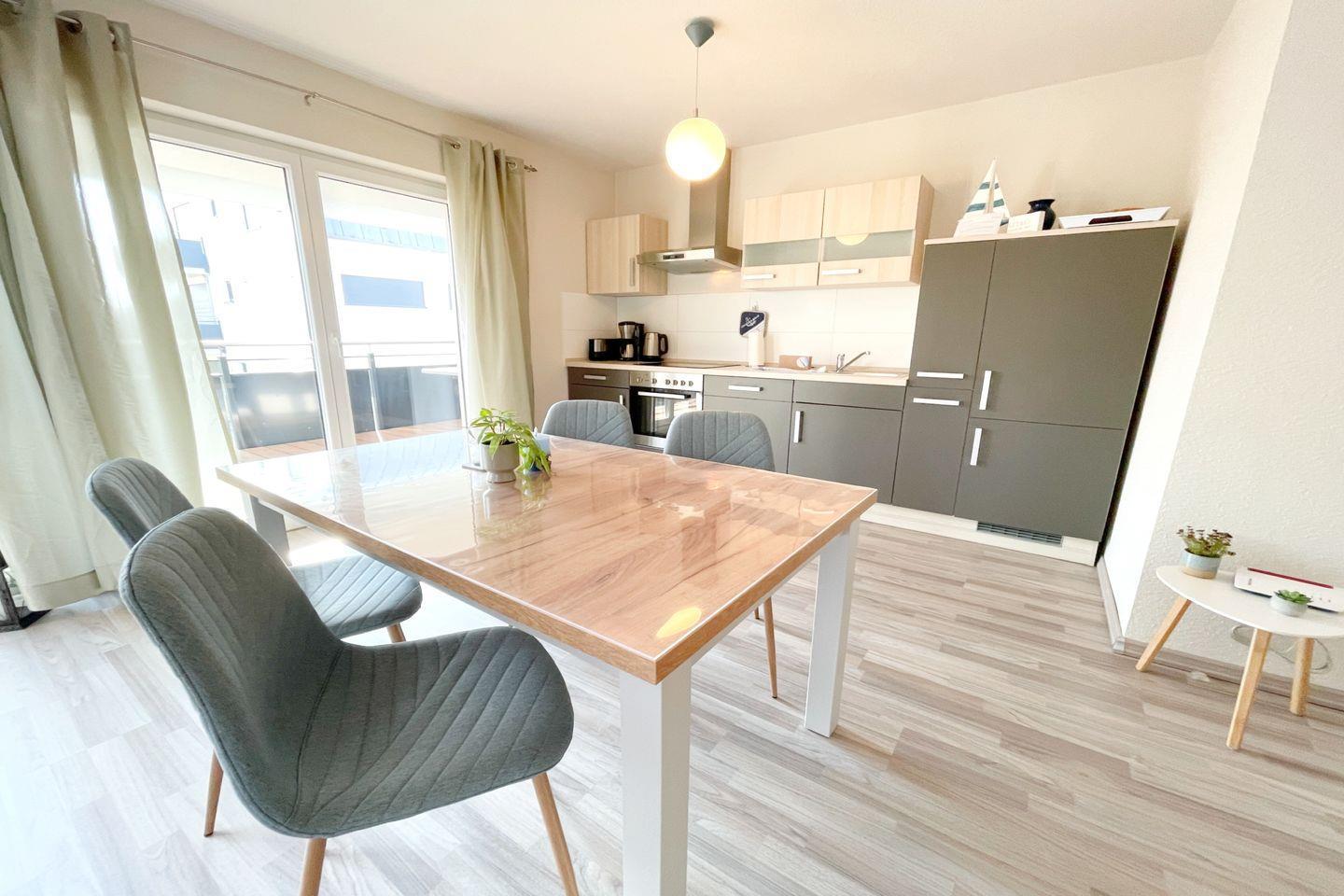 Die Ferienwohnung verfügt über ein geschmackvoll eingerichtetes Schlafzimmer sowie ein gemütliches Wohnzimmer, das mit einer bequemen Sofaecke und einem Esstisch ausgestattet ist. Hier können Sie entspannte Stunden verbringen und die Zeit zusammen genießen. Die offene Küche ist mit allem ausgestattet, was Sie für die Zubereitung eigener Mahlzeiten benötigen, einschließlich einer Spülmaschine, Backofen, Kühlschrank sowie einer Kaffeemaschine und einem Wasserkocher. Für Familien sind auch Kinderhochstühle und kinderfreundliche Ausstattung bei Bedarf verfügbar.