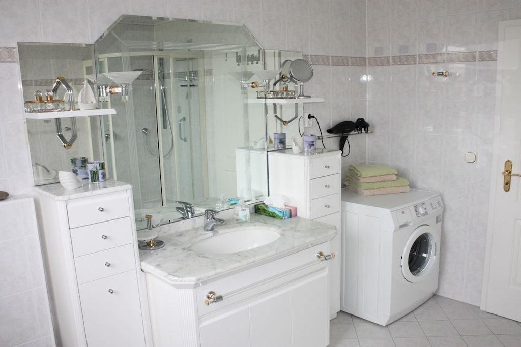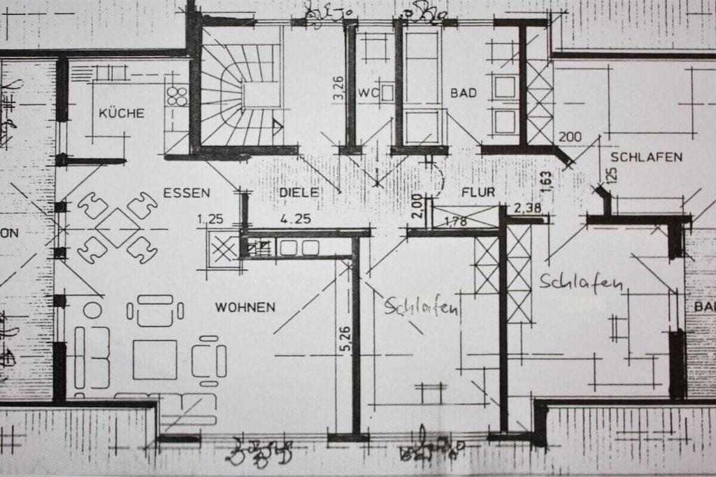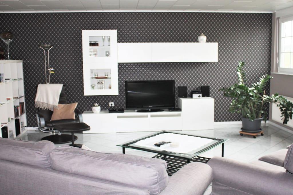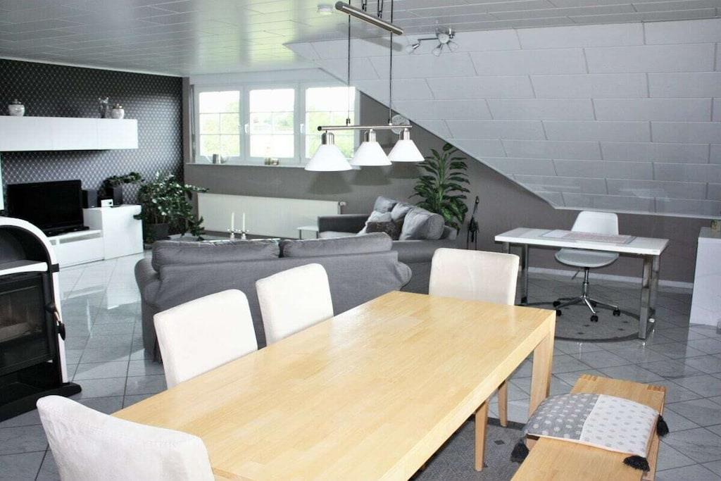 Die FeWo hat drei große Schlafzimmer, eine voll ausgestattete Küche (Mikrowelle, Geschirrspüler, Elektroherd, Kühl- u. Gefrierschank etc. mit angrenzendem Wohn-/Esszimmer (Leseecke, Schreibtisch), Kaminofen als Zusatzheizung, ein großes Bad/WC mit Dusche, Eckbadewanne, Waschmaschine sowie ein zusätzliches WC. Die Wohnung verfügt über zwei Flat/SAT/TV, einen Blue-Ray-Player, eine Stereoanlage und einen WLAN-Internetzugang. Durch die vielen Fenster ist die Wohnung lichtdurchflutet, hell und freundlich. Es ist eine Nichtraucherwohnung, rauchen ist jedoch auf beiden Balkonen möglich. Fitnessraum (Crosstrainer, Laufband, Ergometer, Stepper, Bauchtrainer, Profi-Fitnessstation) im KellerG kann genutzt werden.