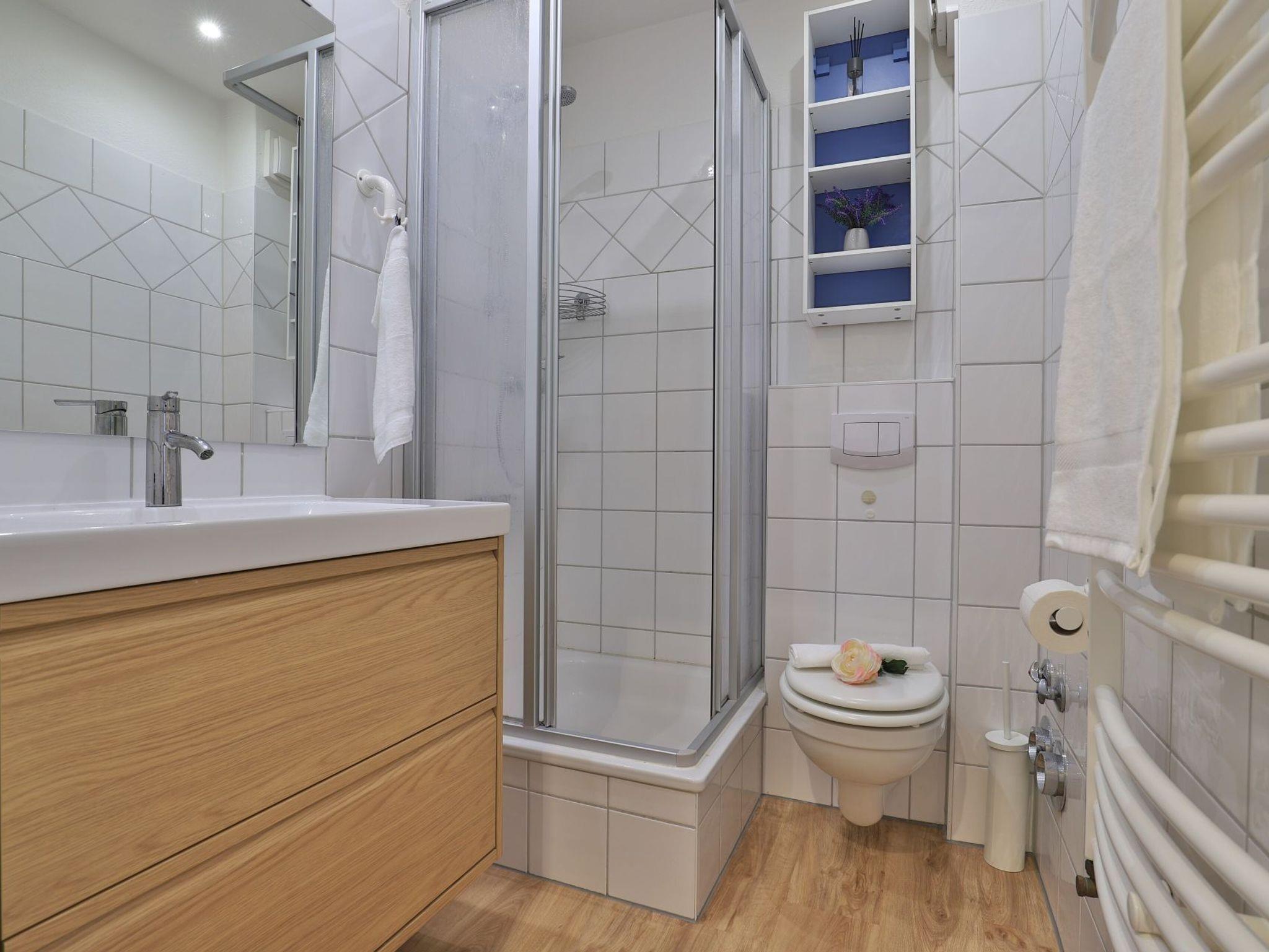 Ein hell gefliest ist das Duschbad gehört zur Wohnung. Für kleine Kinder sind Kinderreisebett-/Hochstuhl in der Wohnung vorhanden. Eine Waschmaschine- im Untergeschoss könne sie gegen Gebühr nutzen. Ihren PKW parken Sie kostenfrei auf dem Außenstellplatz.