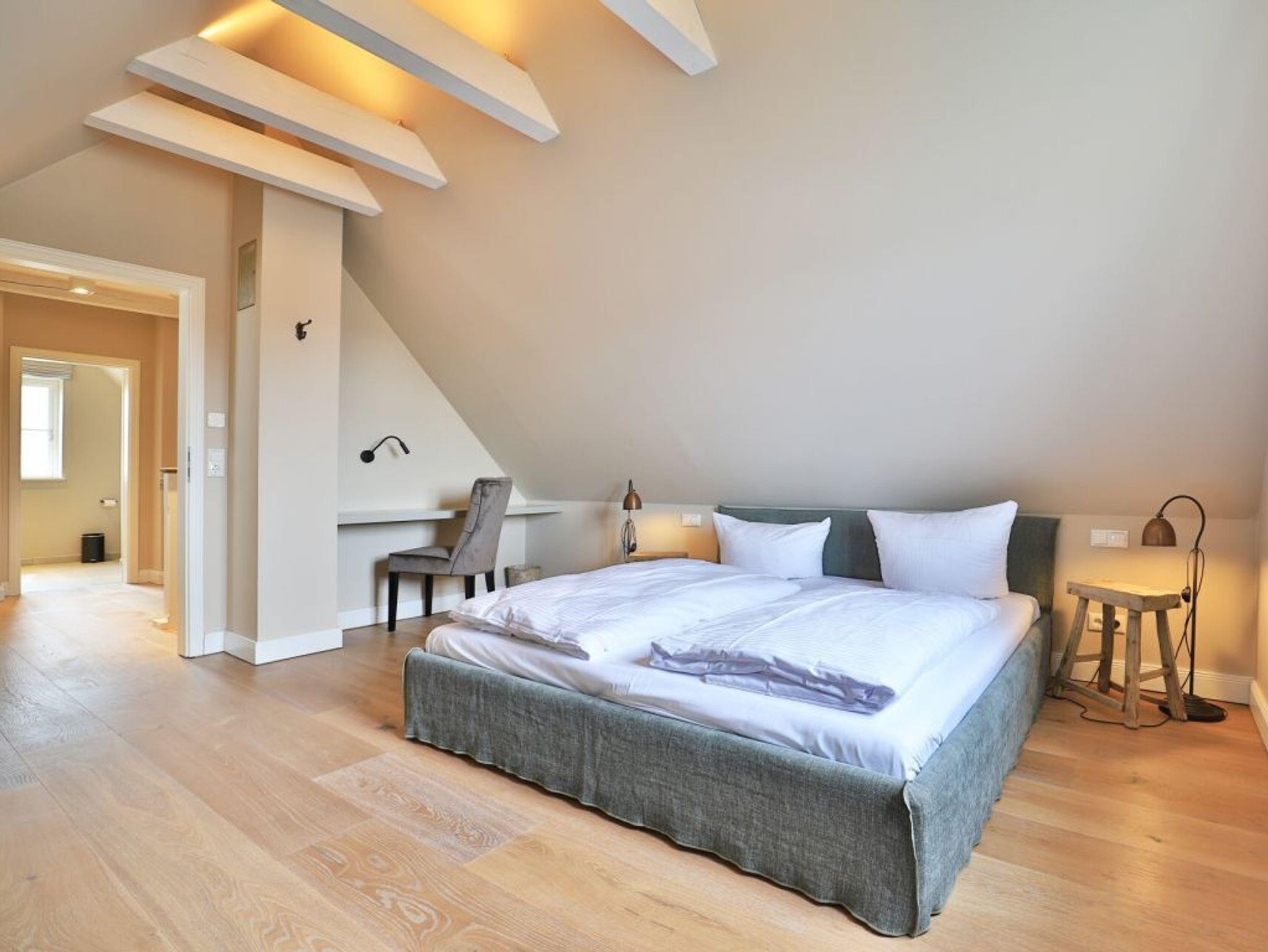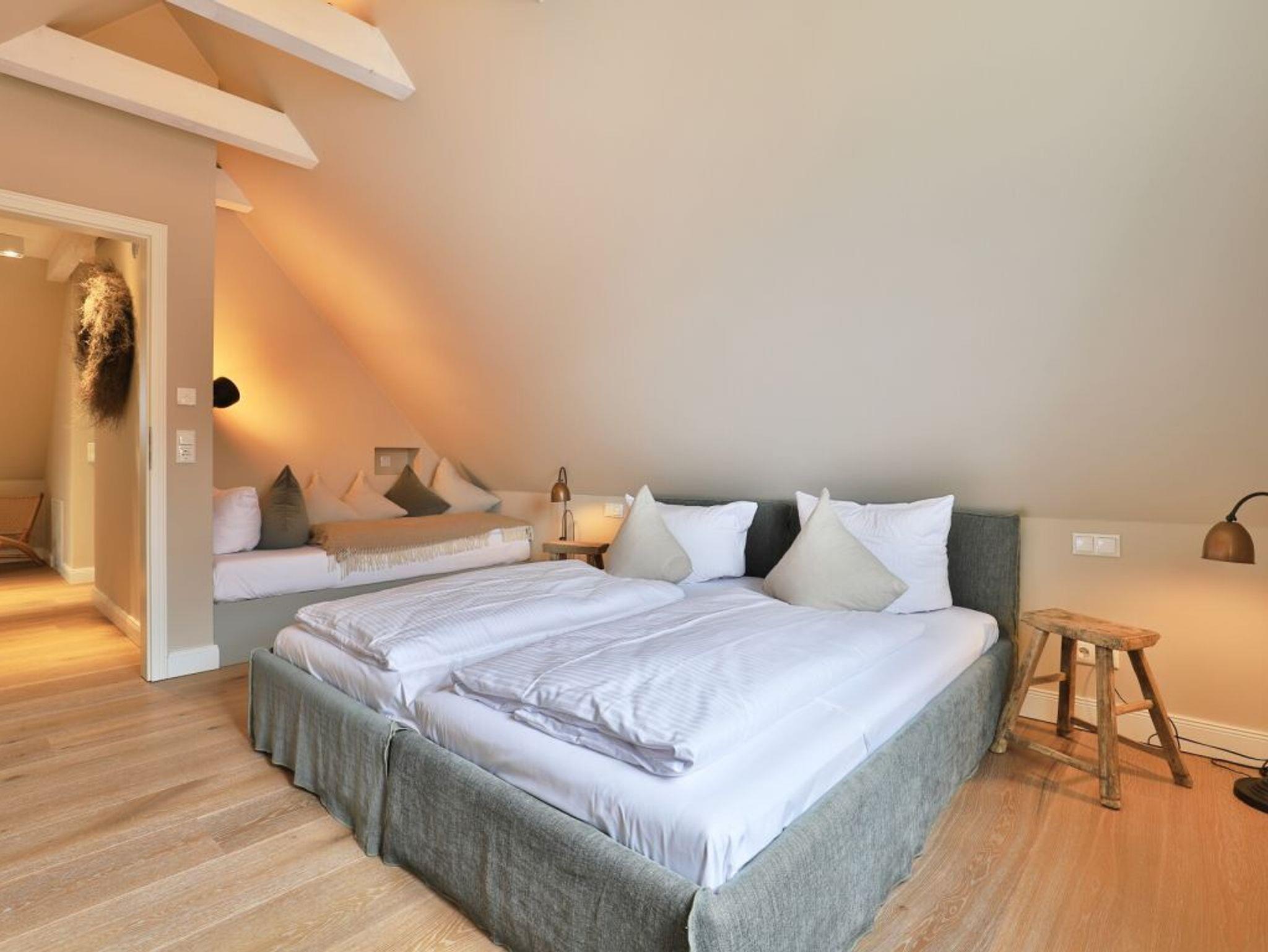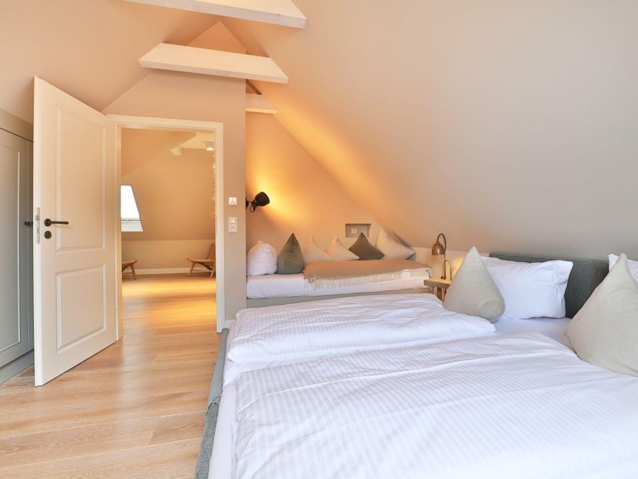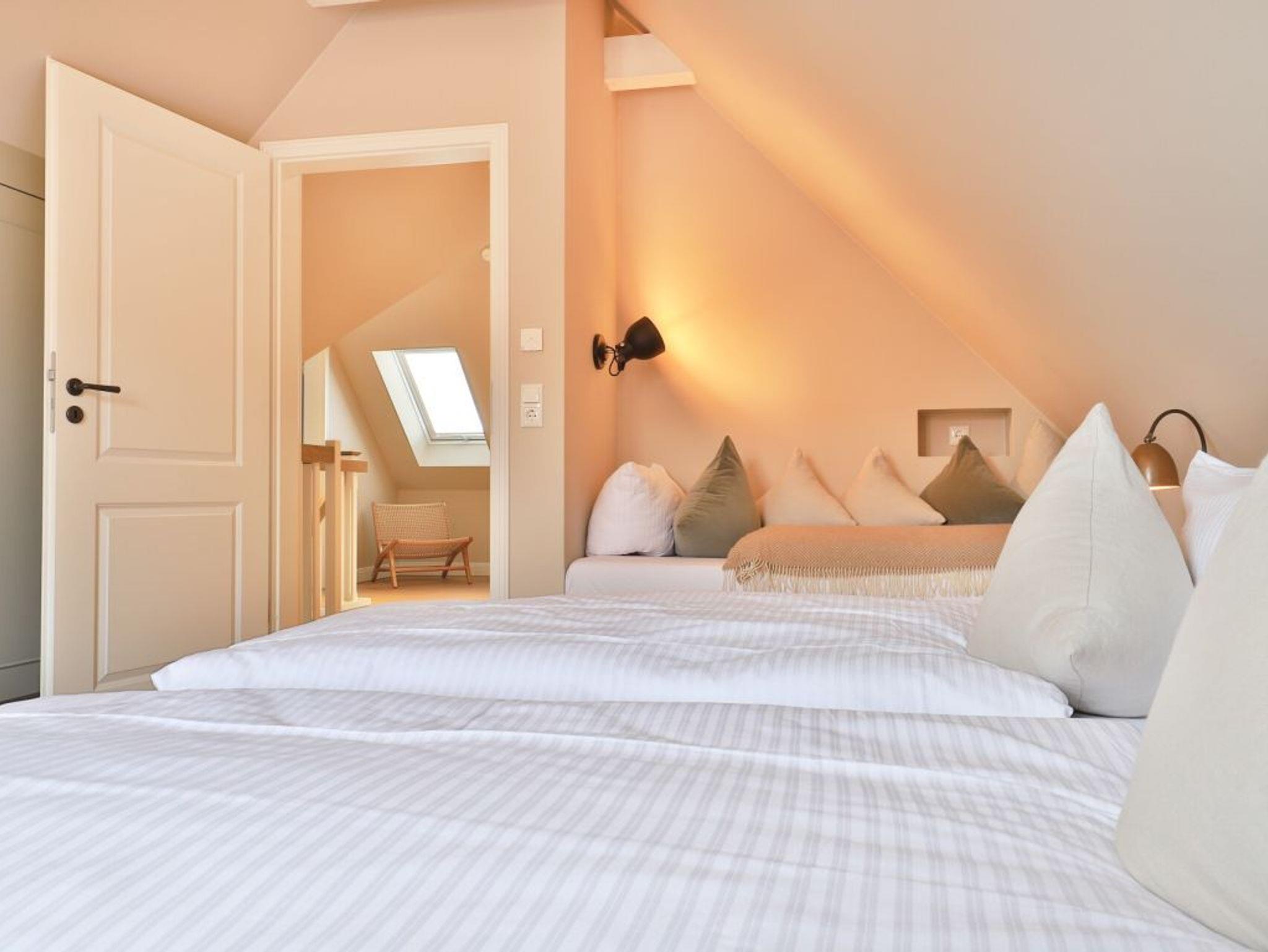 Auch von diesem Schlafzimmer gelangen Sie auf die Terrasse. Zudem befindet sich auf dieser Wohnebene ein modernes Tageslicht Duschbad. Über den Wohnungsflur erreichen Sie über eine leicht geschwungene Treppe das Obergeschoss, wo sich zwei weitere Schlafzimmer einmal mit Doppelbett und das weitere Schlafzimmer mit zwei Einzelbetten und einer zusätzlichen Schlafgelegenheit befinden. Alle drei Schlafzimmer bieten Kleiderschränke mit viel Stauraum für Ihre Urlaubsgarderobe. Die obere Ebene besitzt zudem ein modernes Tageslicht Vollbad mit Badewanne, Dusche und guten Ablagemöglichkeiten für Ihre Kosmetikartikel. Der inklusive Service umfasst auch die Nutzung von Kinderhochstuhl und einem Kinderreisebett.