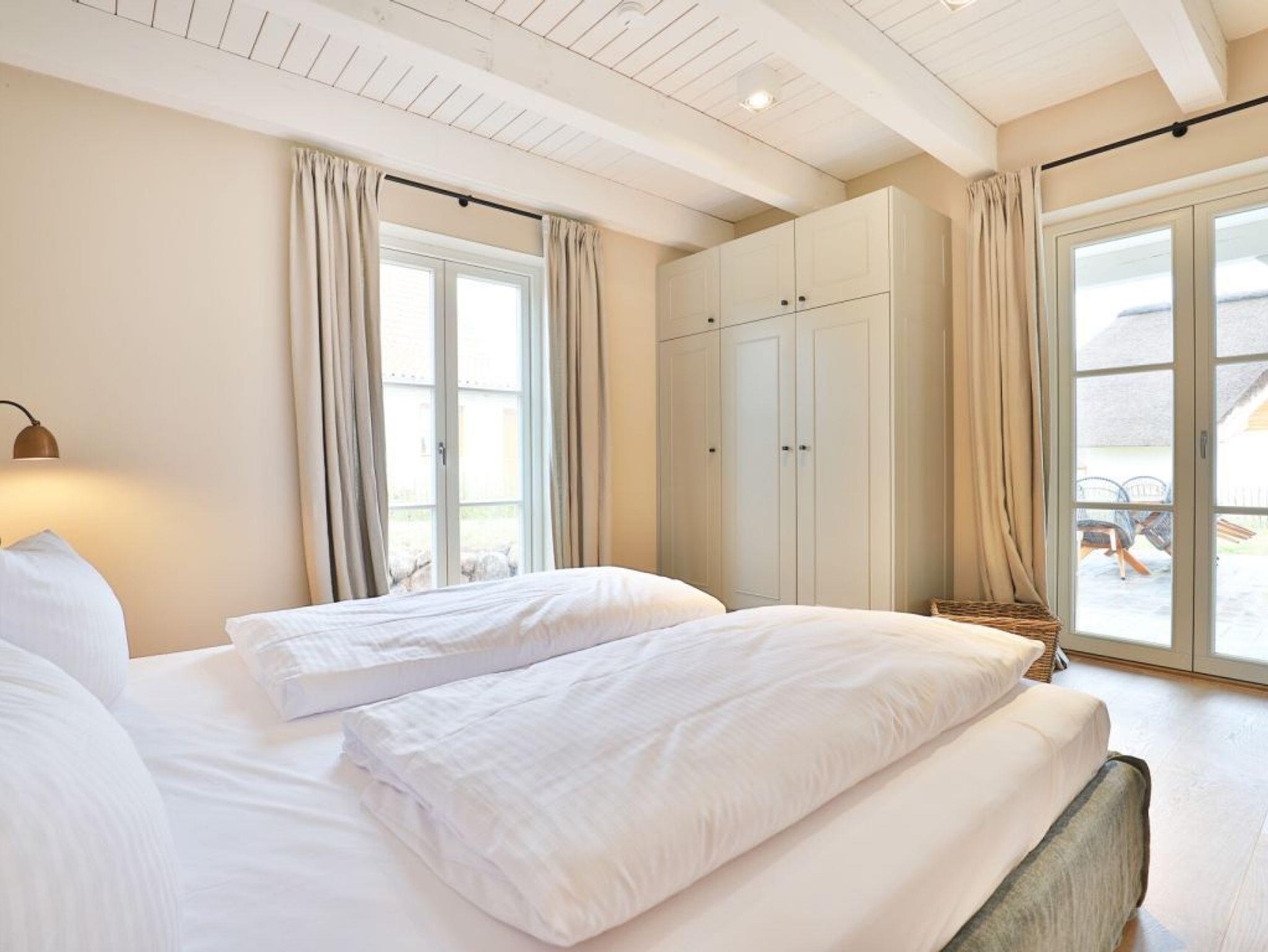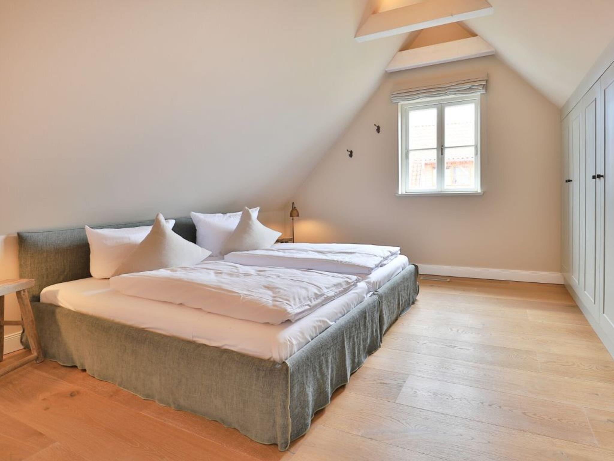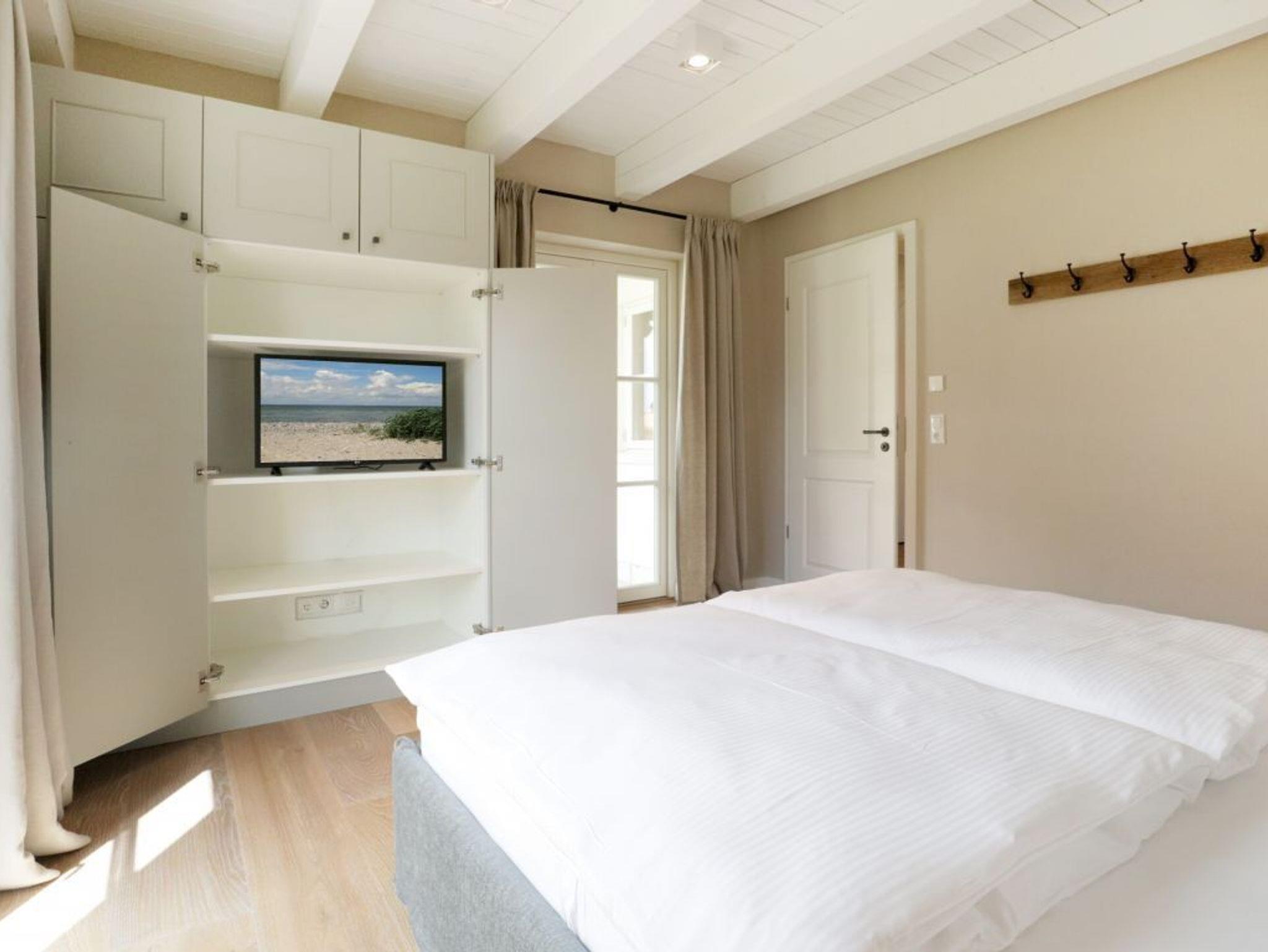 Auch von diesem Schlafzimmer gelangen Sie auf die Terrasse. Zudem befindet sich auf dieser Wohnebene ein modernes Tageslicht Duschbad. Über den Wohnungsflur erreichen Sie über eine leicht geschwungene Treppe das Obergeschoss, wo sich zwei weitere Schlafzimmer einmal mit Doppelbett und das weitere Schlafzimmer mit zwei Einzelbetten und einer zusätzlichen Schlafgelegenheit befinden. Alle drei Schlafzimmer bieten Kleiderschränke mit viel Stauraum für Ihre Urlaubsgarderobe. Die obere Ebene besitzt zudem ein modernes Tageslicht Vollbad mit Badewanne, Dusche und guten Ablagemöglichkeiten für Ihre Kosmetikartikel. Der inklusive Service umfasst auch die Nutzung von Kinderhochstuhl und einem Kinderreisebett.